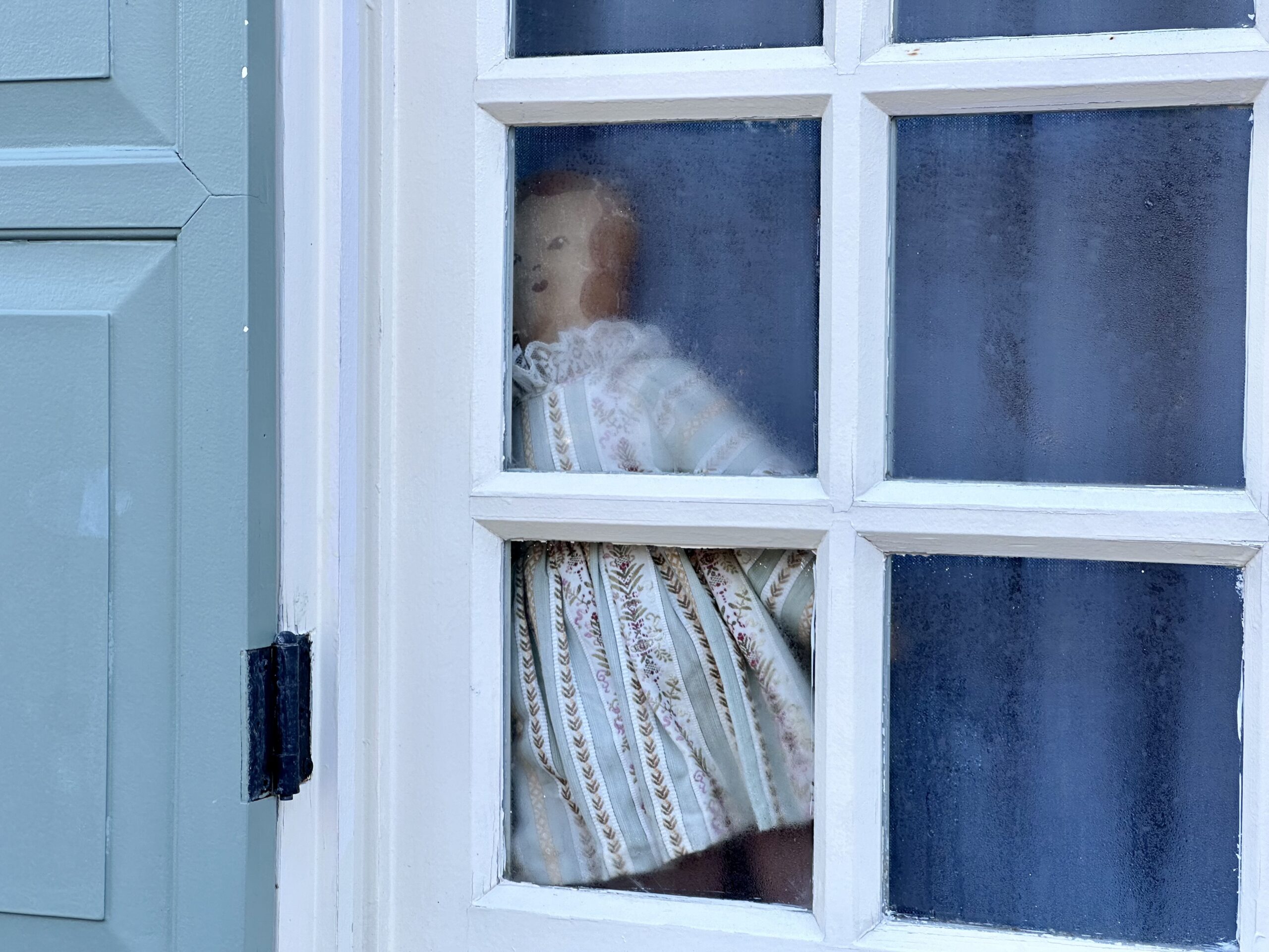 THE LIBERTY DOLL MOVED. THIS IS NOT A DRILL. She was previously standing in the center, but I guess she got tired and decided to lean against the wall, or maybe this is how she sleeps and she just slept in this morning. It was an early park day after all. Usually, Magic Kingdom opens at 9:00 a.m. but today it opened at 8:00 a.m., which means early entry was at 7:30 a.m. The Liberty Doll, as I call her, is located in Liberty Square in one of the home windows. Have you ever seen the Liberty Doll in person?