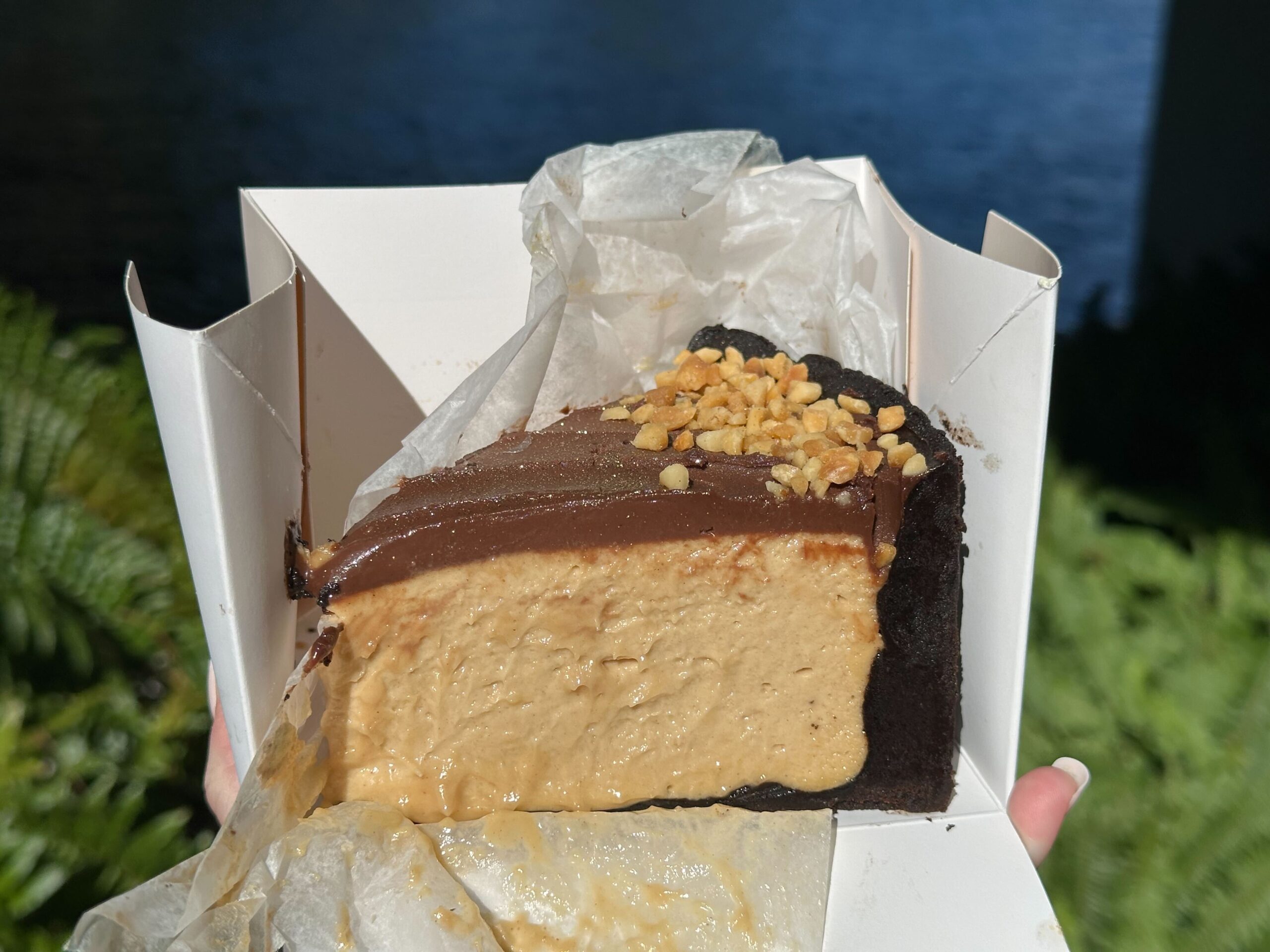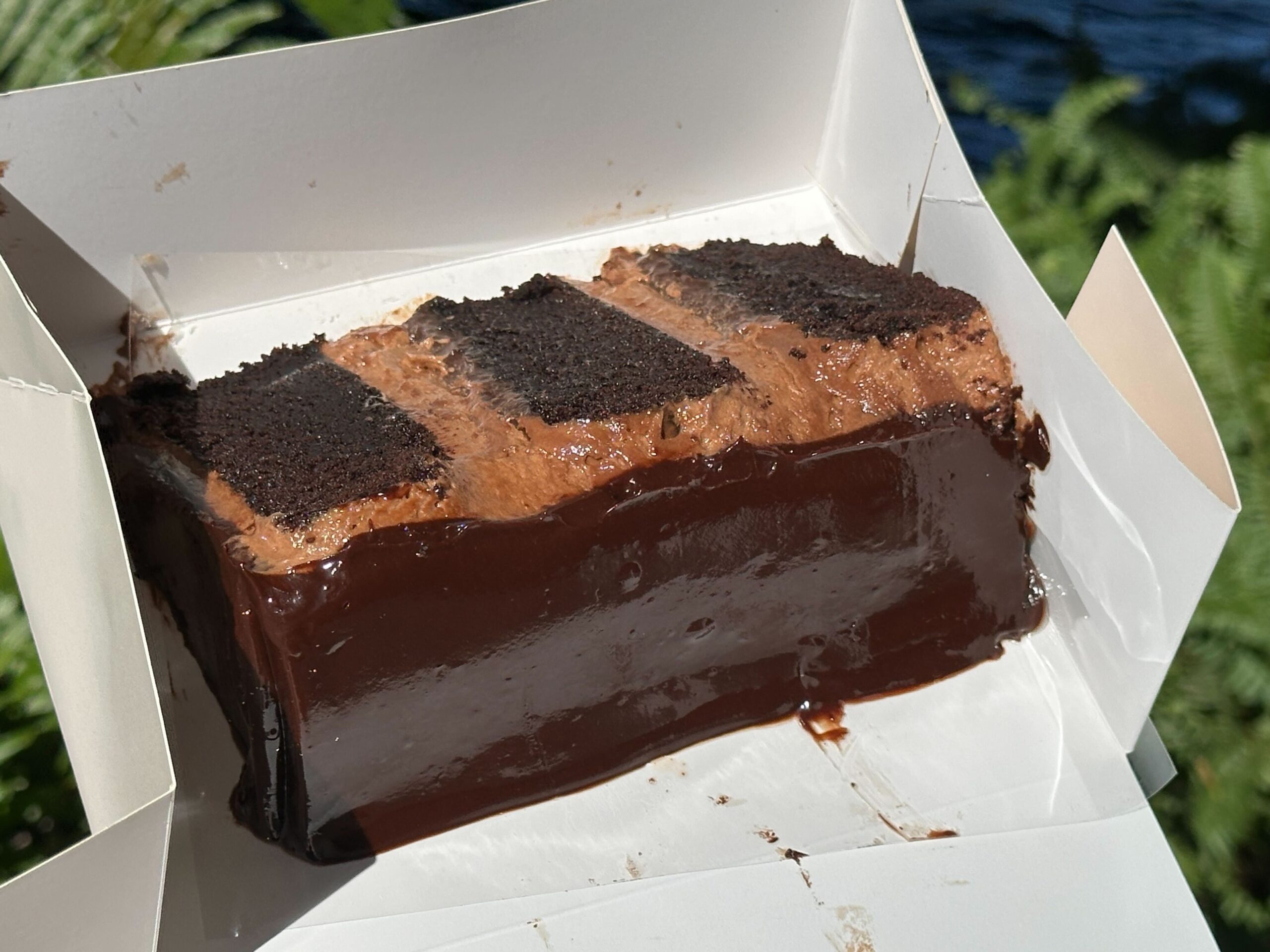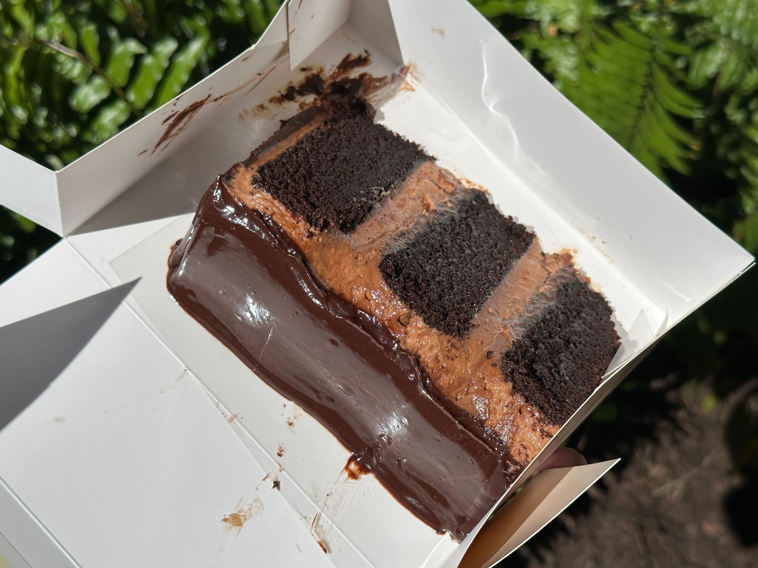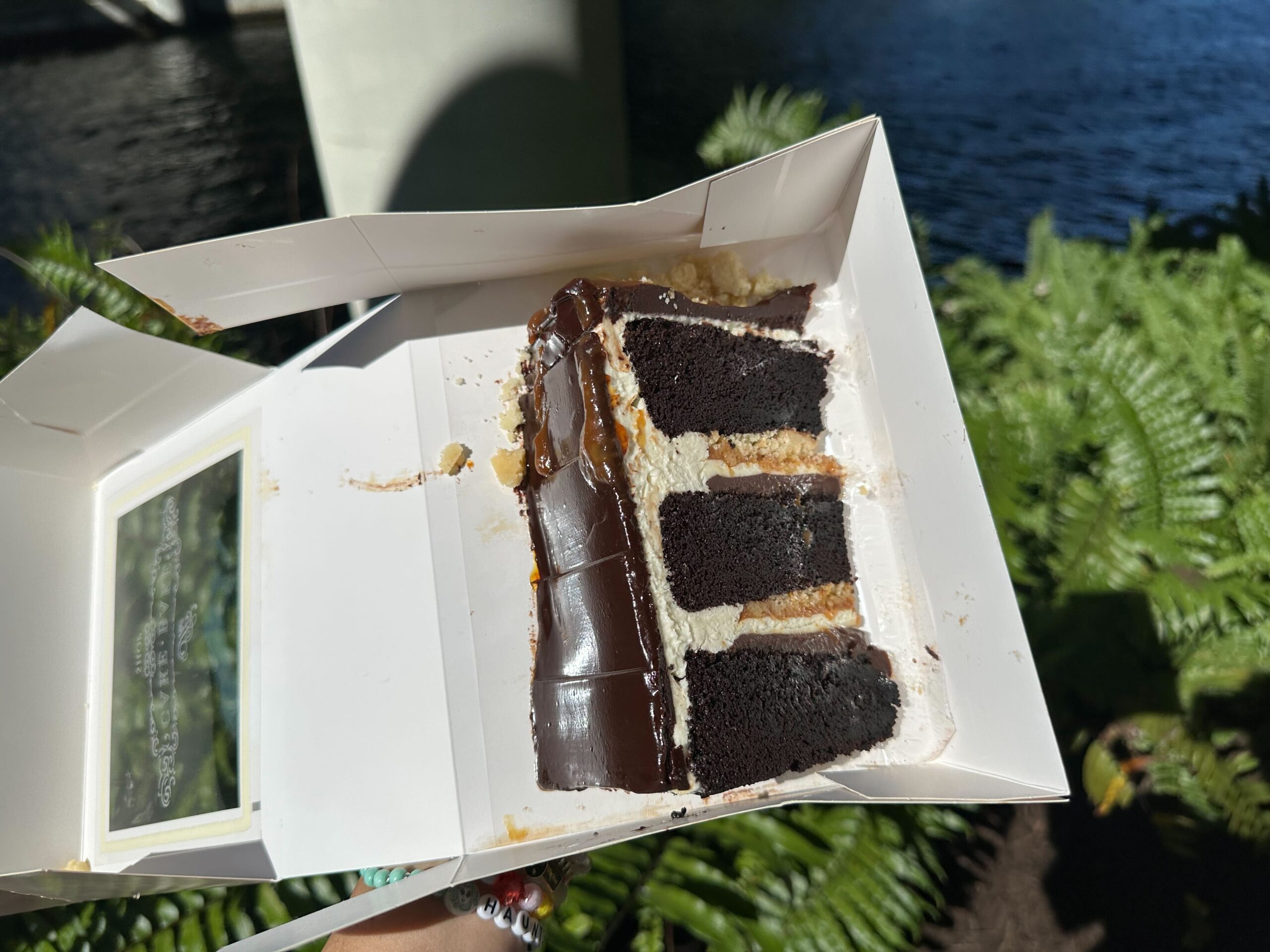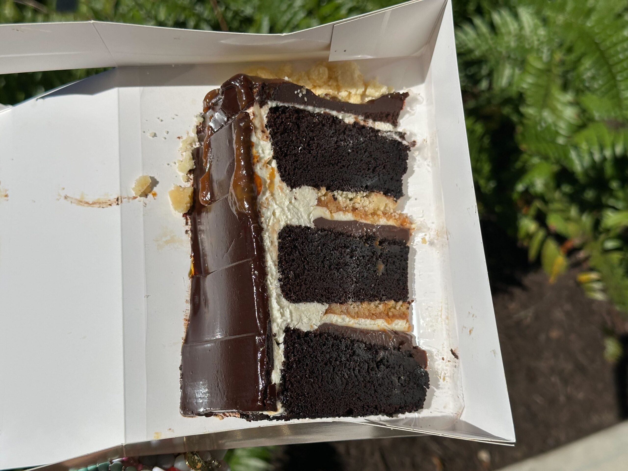 Out of all of our slices, this one held up the best against the Florida heat! It was also the best slice of cake out of everything we tried. It’s incredibly moist and has a really nice chocolatey flavor. The shortbread cookie is magnificent. This is definitely a three-person cake, thanks to how rich it is.