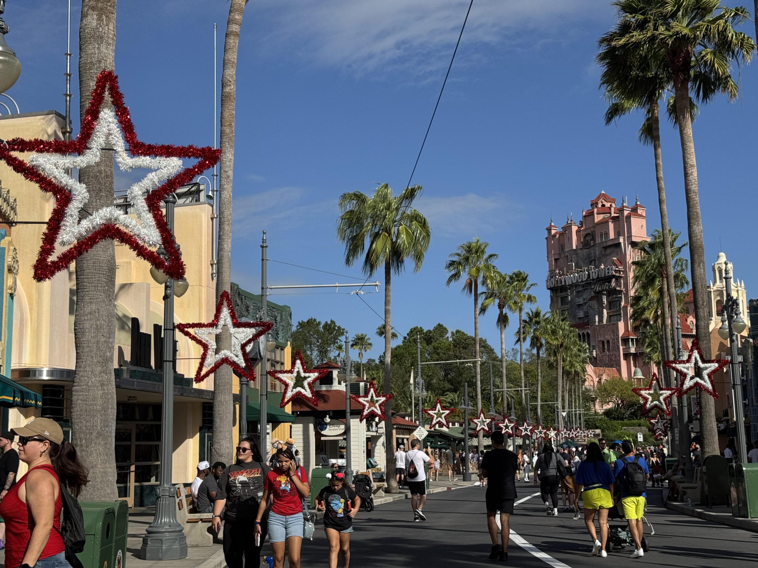 People stroll under star-shaped decorations on a sunny street lined with palm trees, reminiscent of the charming scenes found at Disney's Hollywood Studios, with a tall building standing proudly in the background.