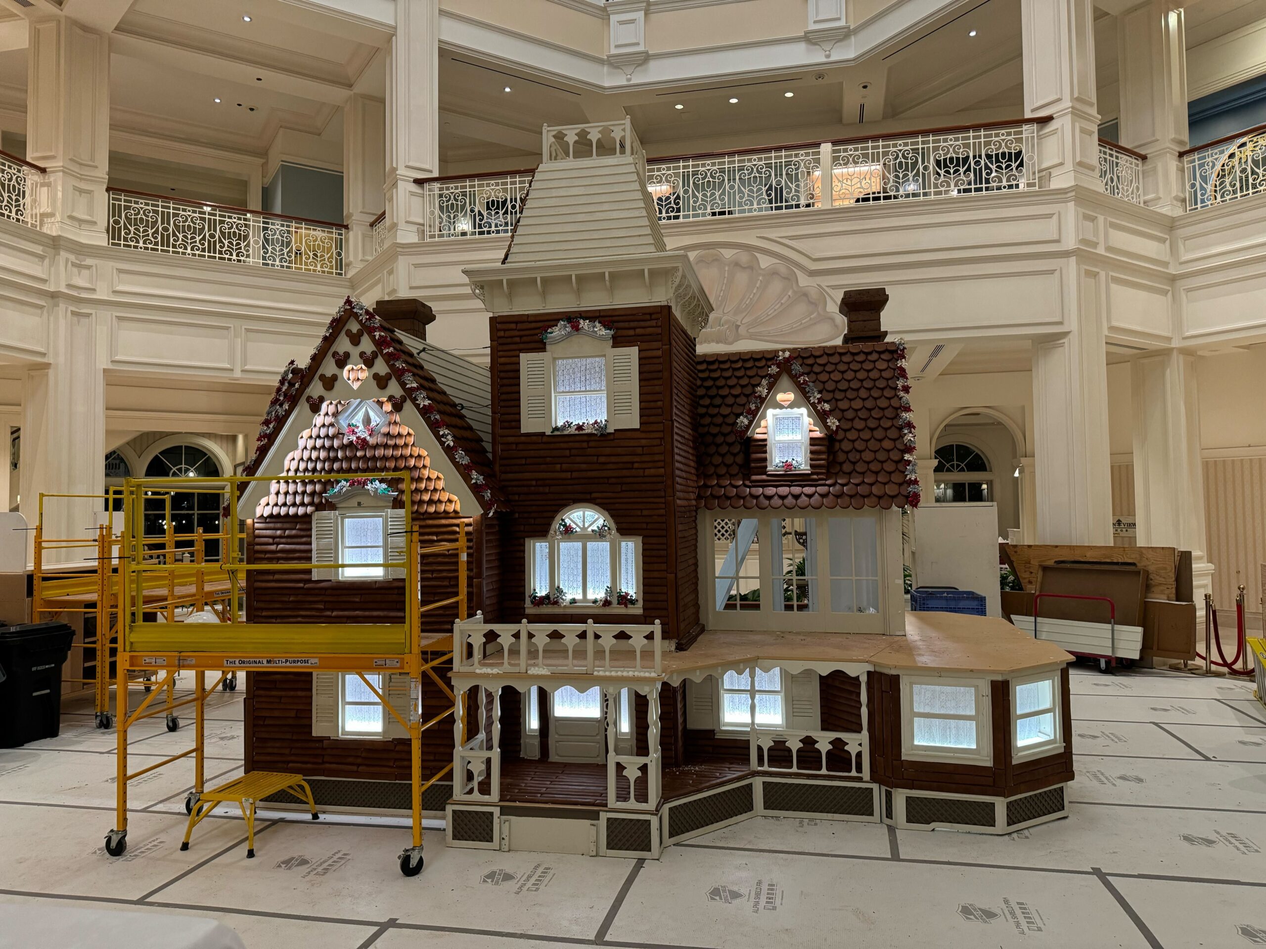 The Grand Floridian's grand gingerbread house display is under construction indoors, with scaffolding surrounding it in a spacious, ornate room, adding a sprinkle of Disney magic to the scene.