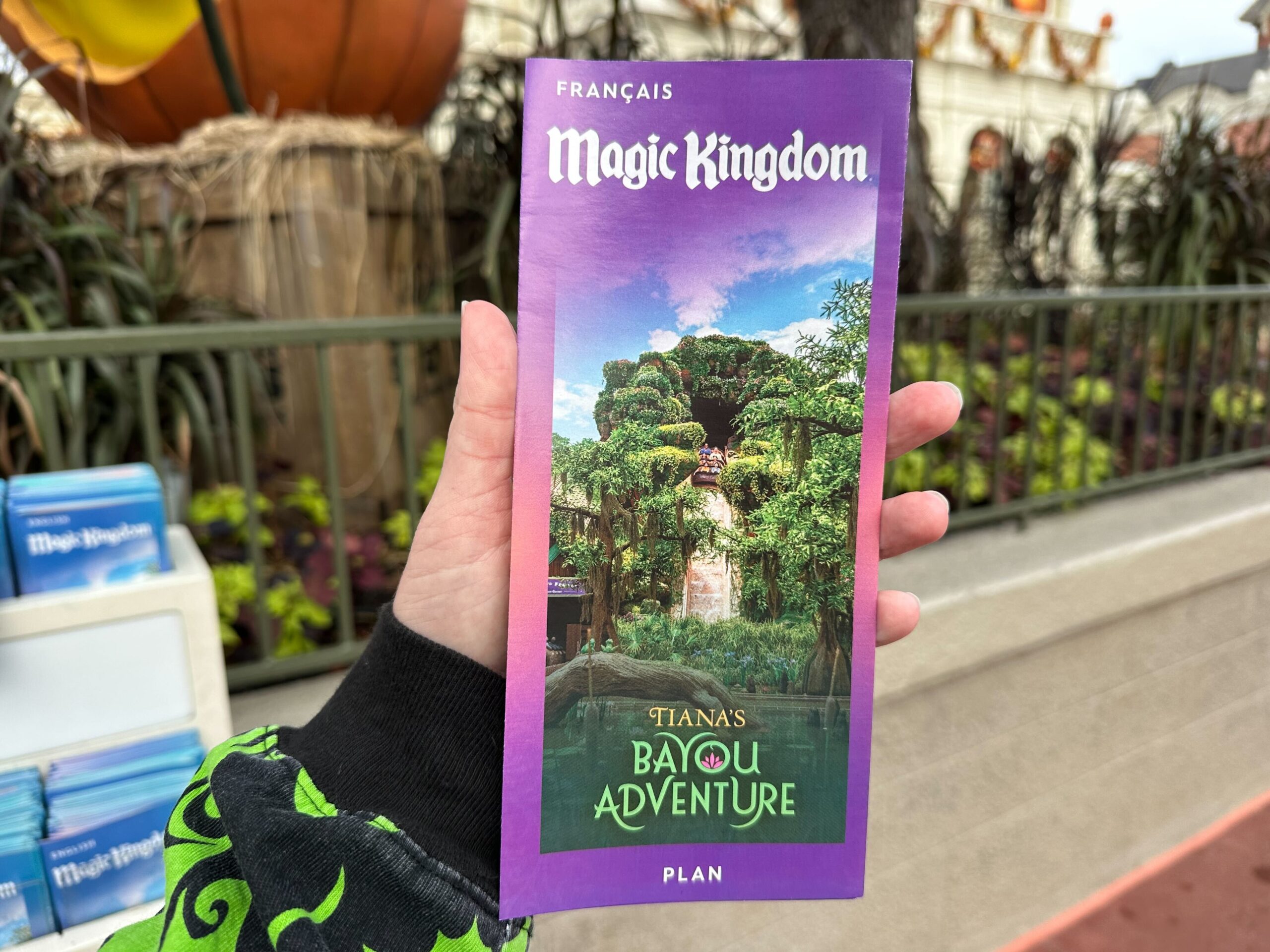 A person holds a French-language Magic Kingdom map featuring "Tiana's Bayou Adventure" against a theme park backdrop.