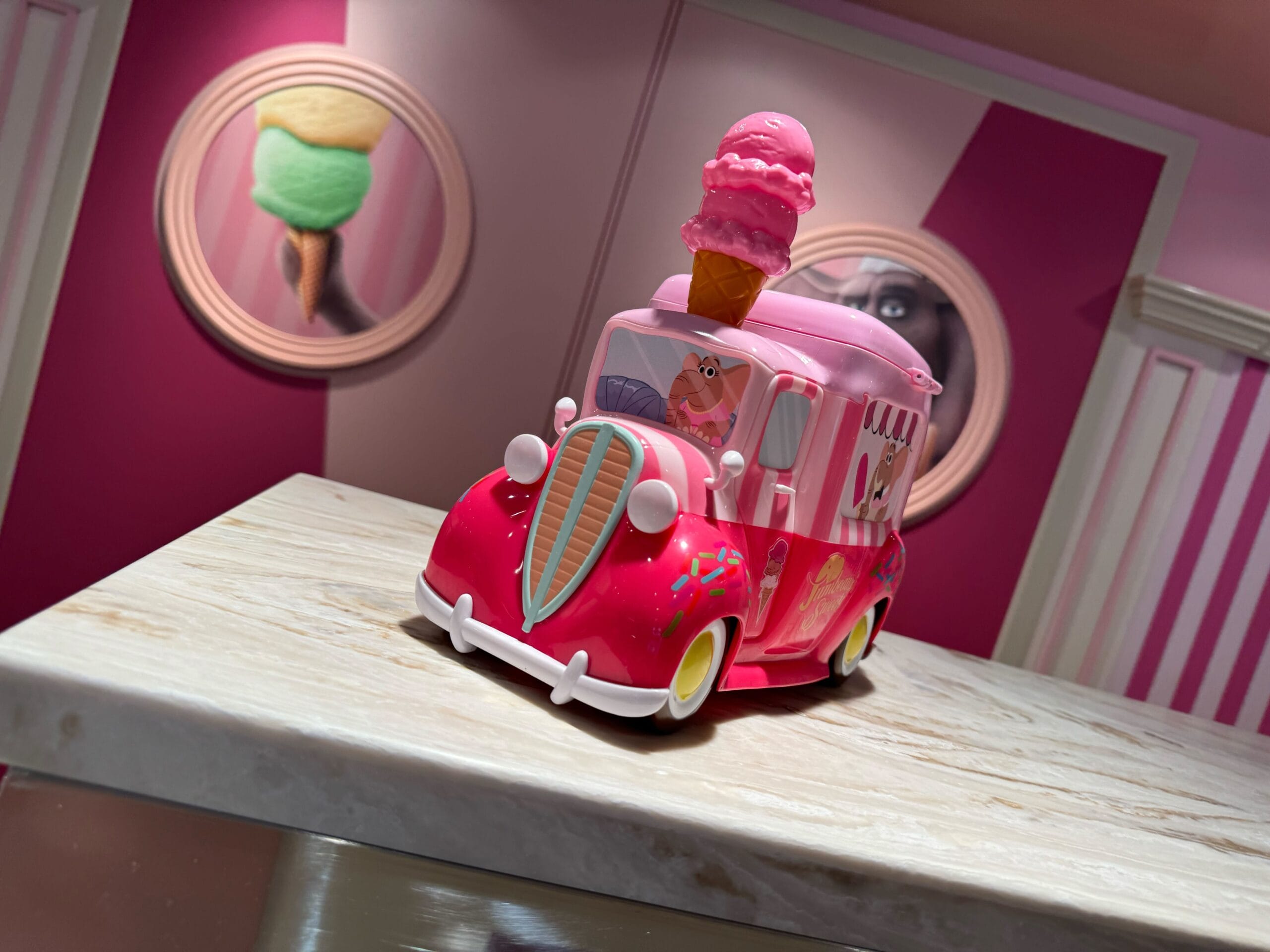 A pink toy ice cream truck with an ice cream cone on top is displayed on a marble surface. The background features colorful ice cream artwork.