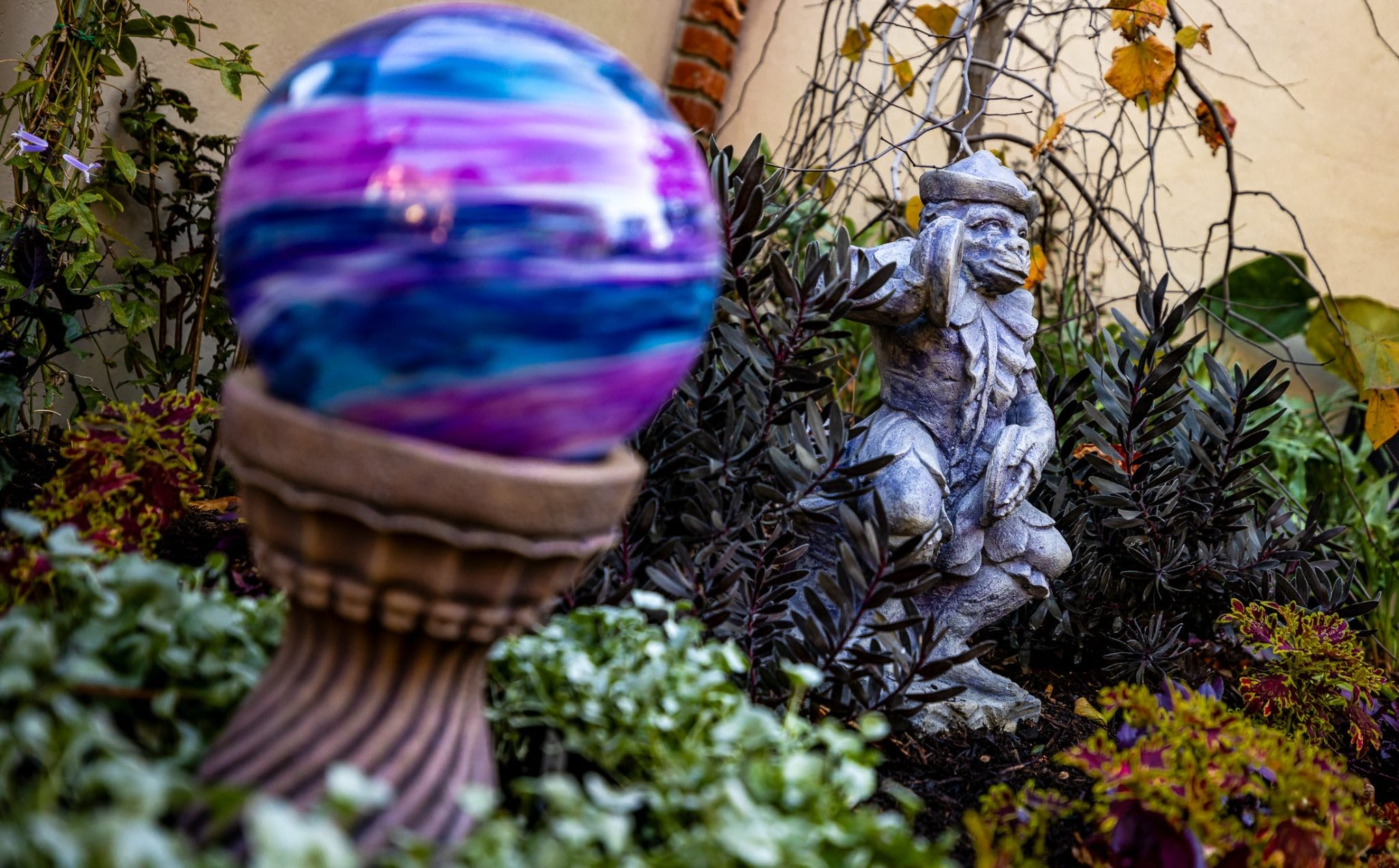 Next guests will enter the garden of Madame Leota, with every item seemingly dipped in mystical energy. There is a statuary of oddities including frogs, lizards, rats, and a cymbal-playing monkey, frozen in time as though by an incantation. There is a repeating motif of fortune-telling orbs. The large oak tree in the center is decorated by Leota with colorful ornaments, chimes, and bells.