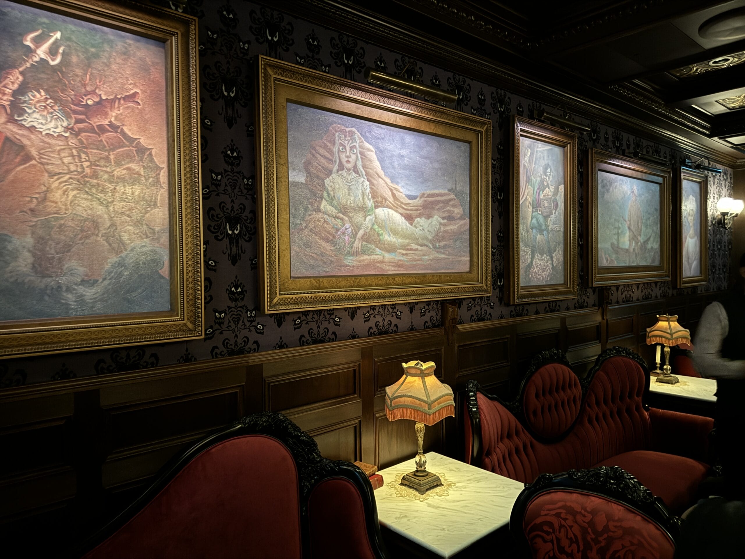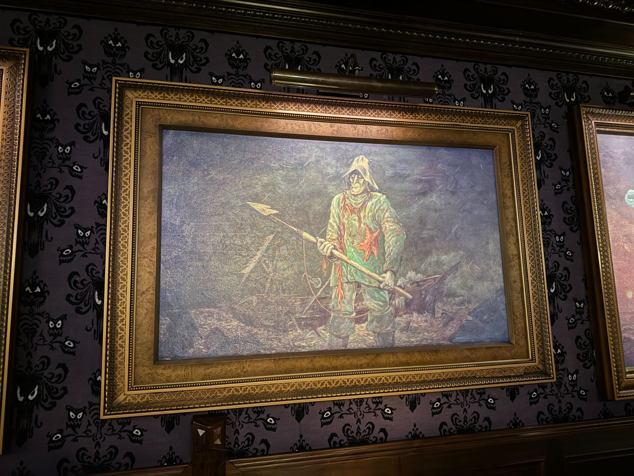 One portrait features The Mariner, a character created by Disney animator Marc Davis. The Mariner’s portrait has appeared in the Haunted Mansion at Disneyland, Magic Kingdom, and Tokyo Disneyland. His story “will be taken to new depths” in the Haunted Mansion Parlor.
