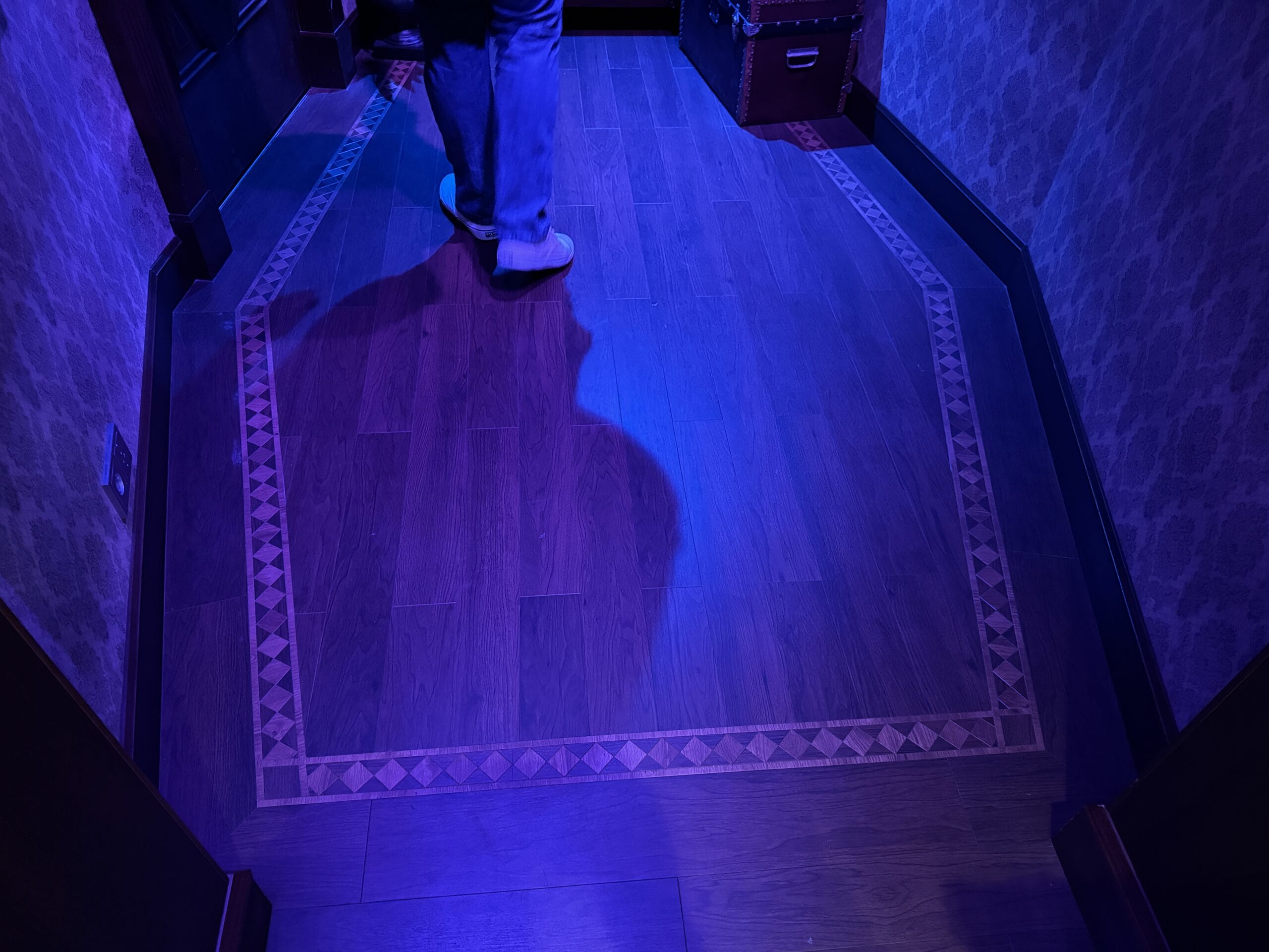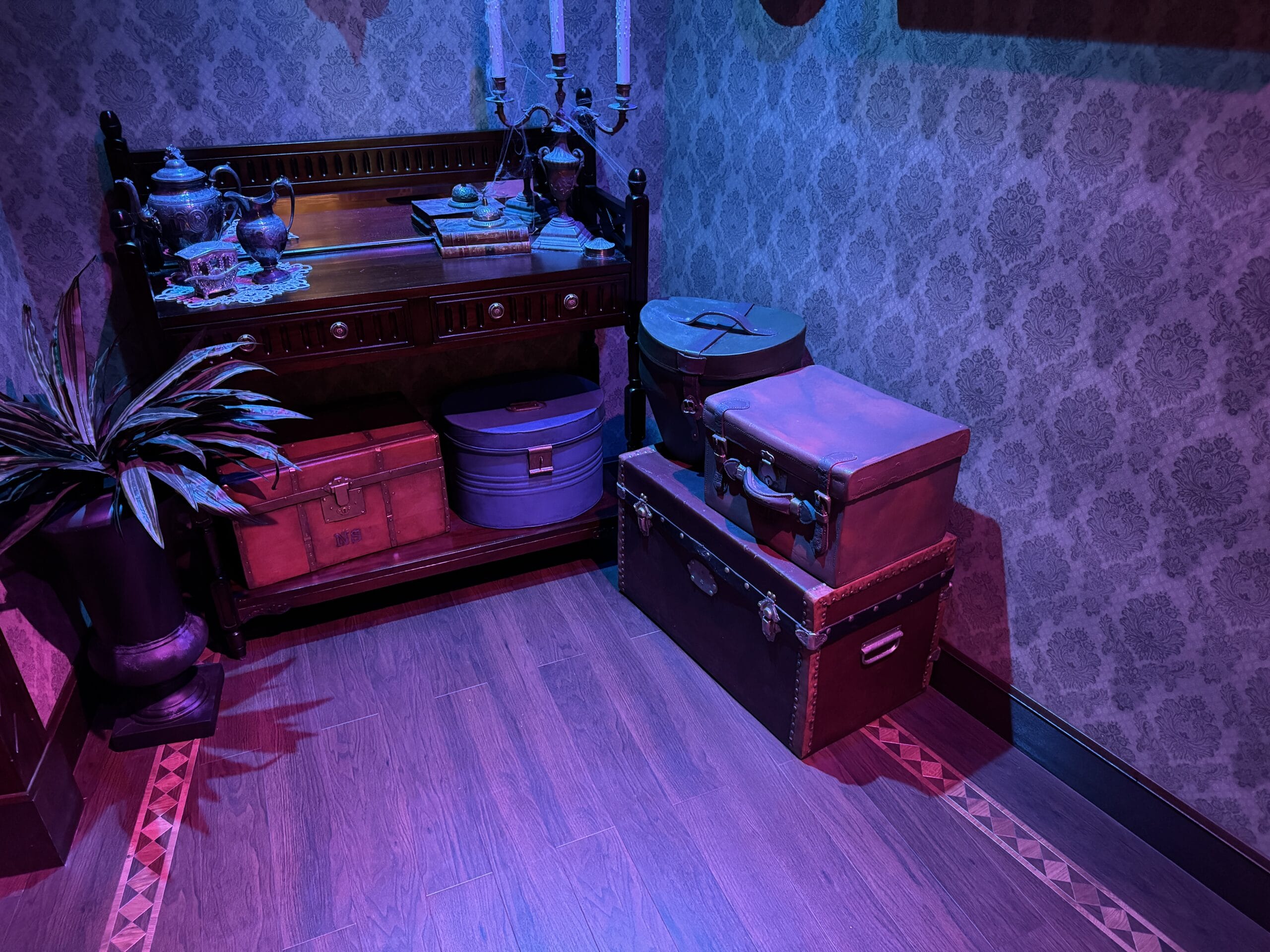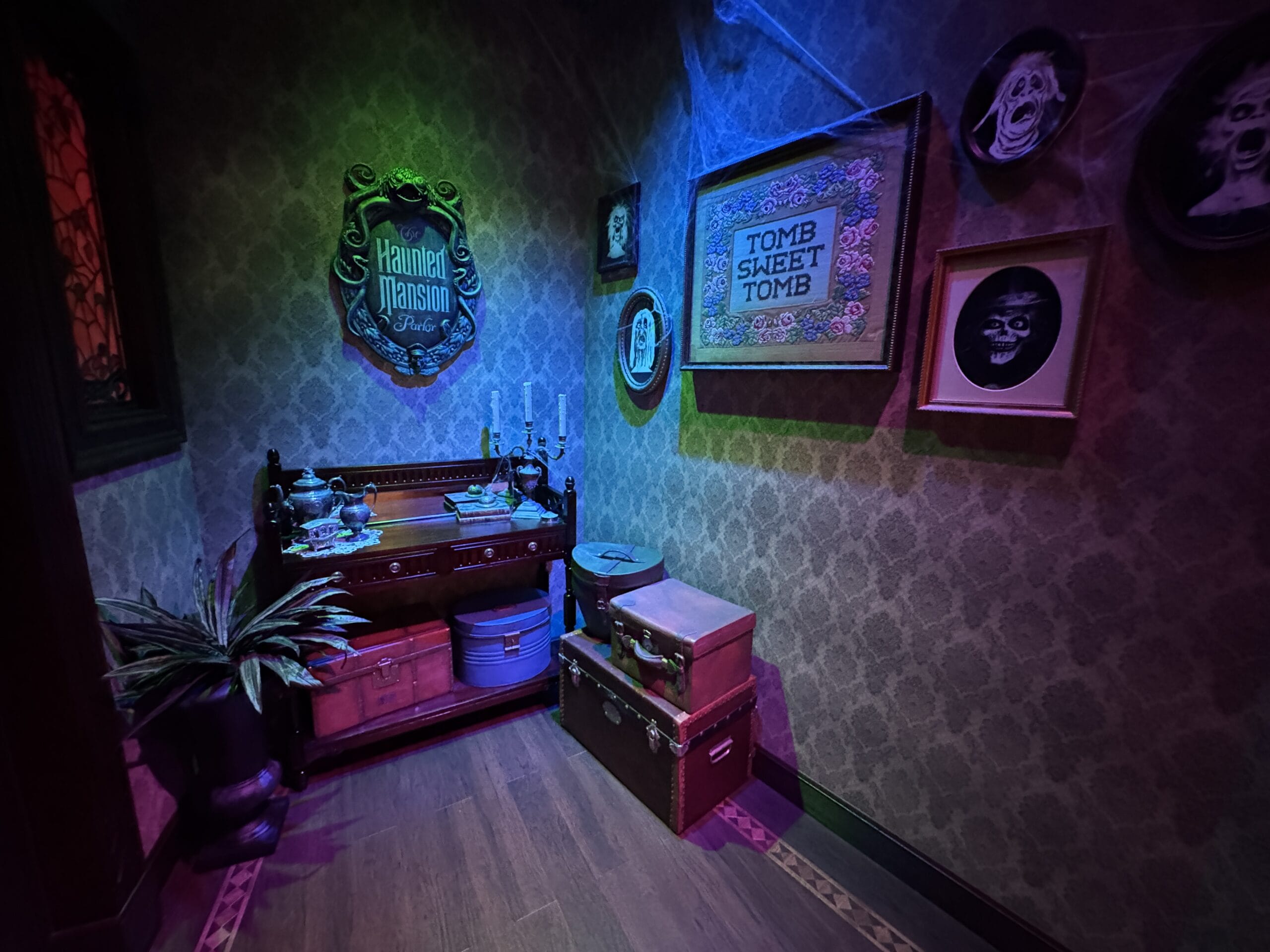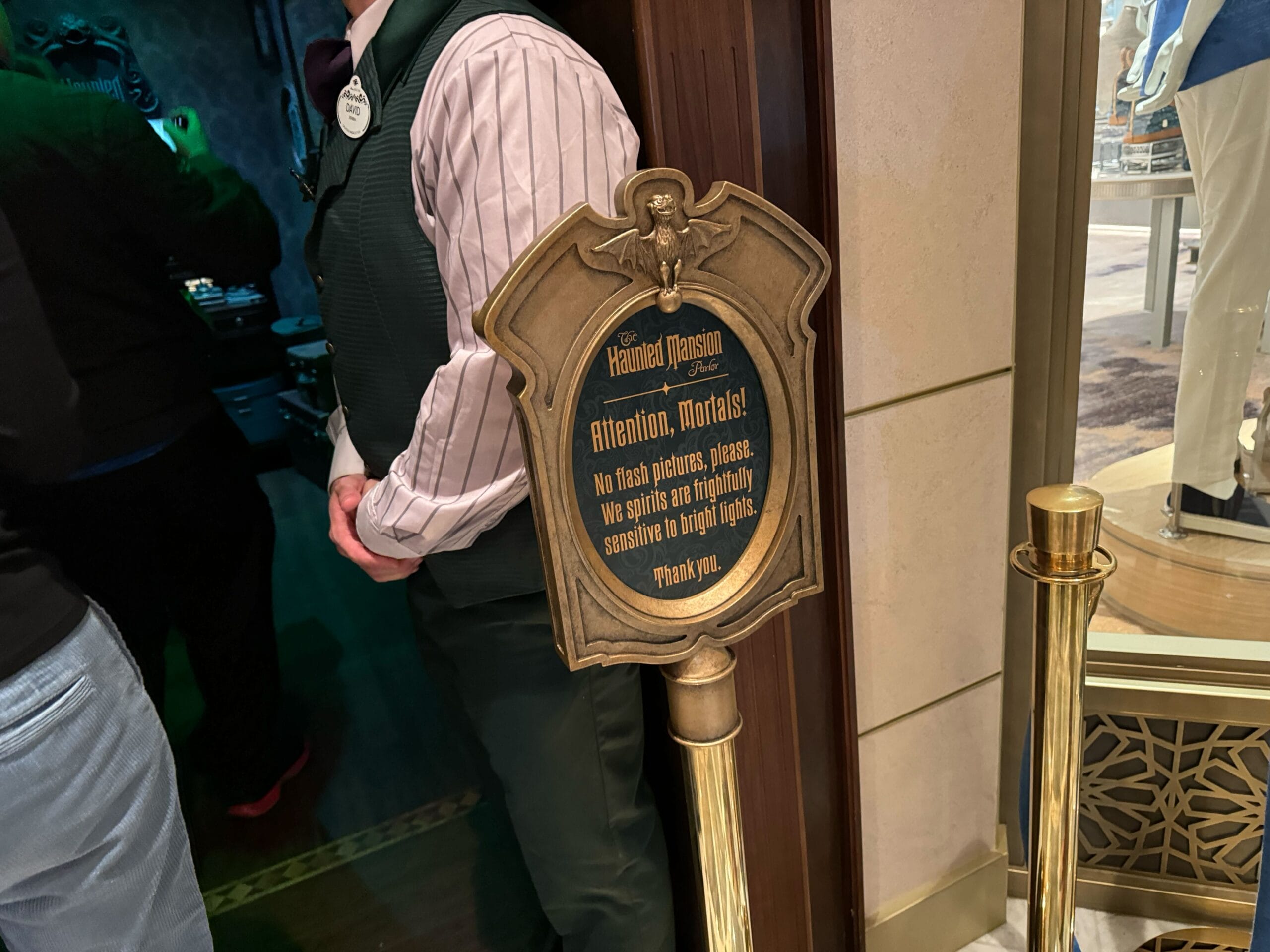 Our tour begins outside the hallway to the Parlor, where a standing gold sign for The Haunted Mansion Parlor advises guests, “Attention, Mortals! No flash pictures, please. We spirits are frightfully sensitive to bright lights. Thank you.” The warning mimics the same heard as guests enter The Haunted Mansion in the parks.