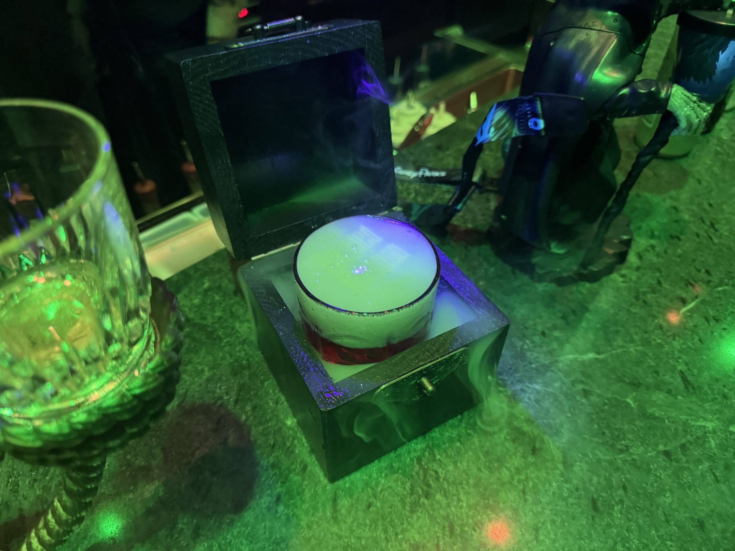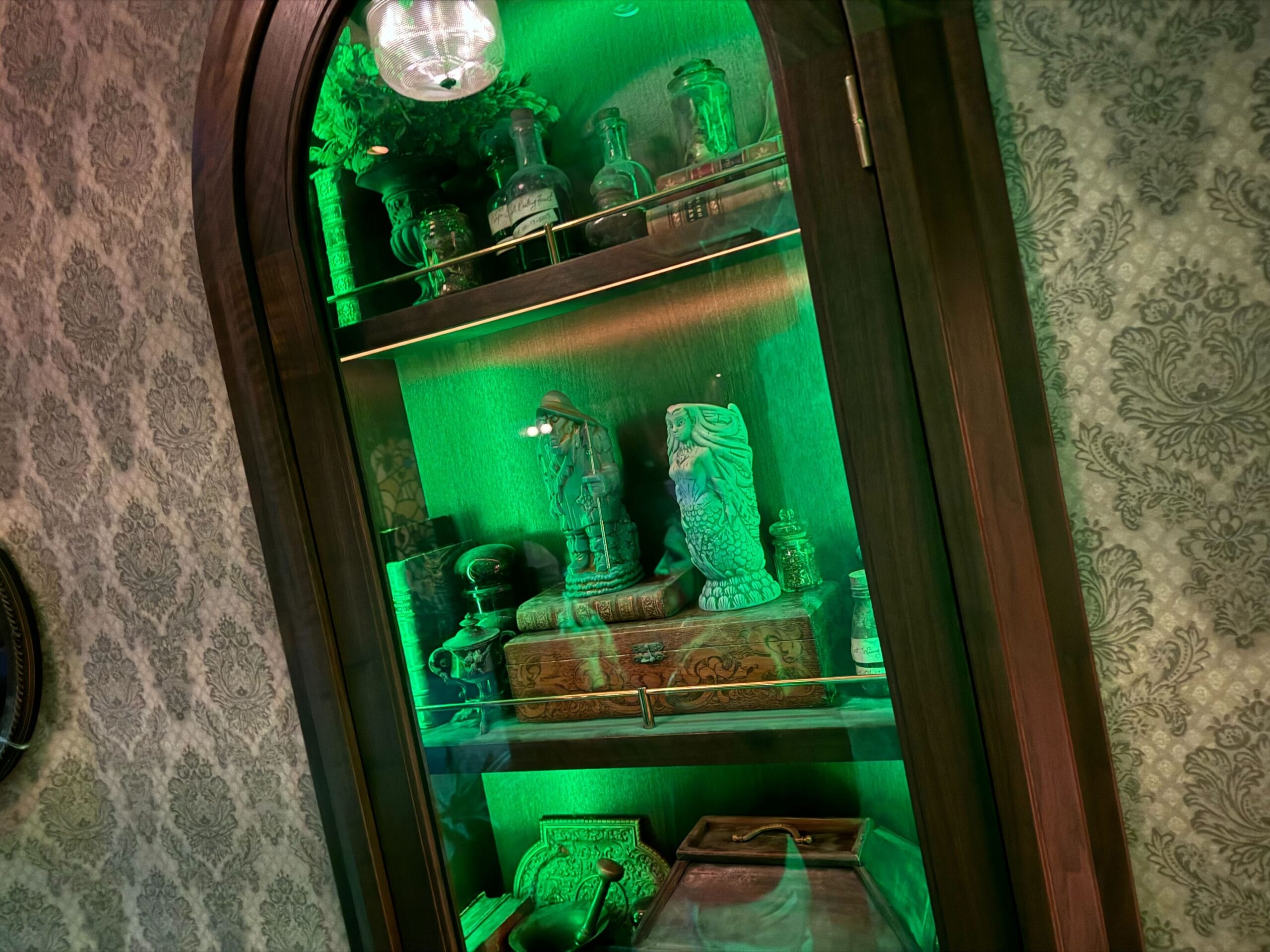As you enter the foyer there is a display case dimly lit in green showcasing some of the available tiki mugs in the Parlor. There are other spooky details to uncover on the shelves as well, including jars, plants, ingredients, and more.