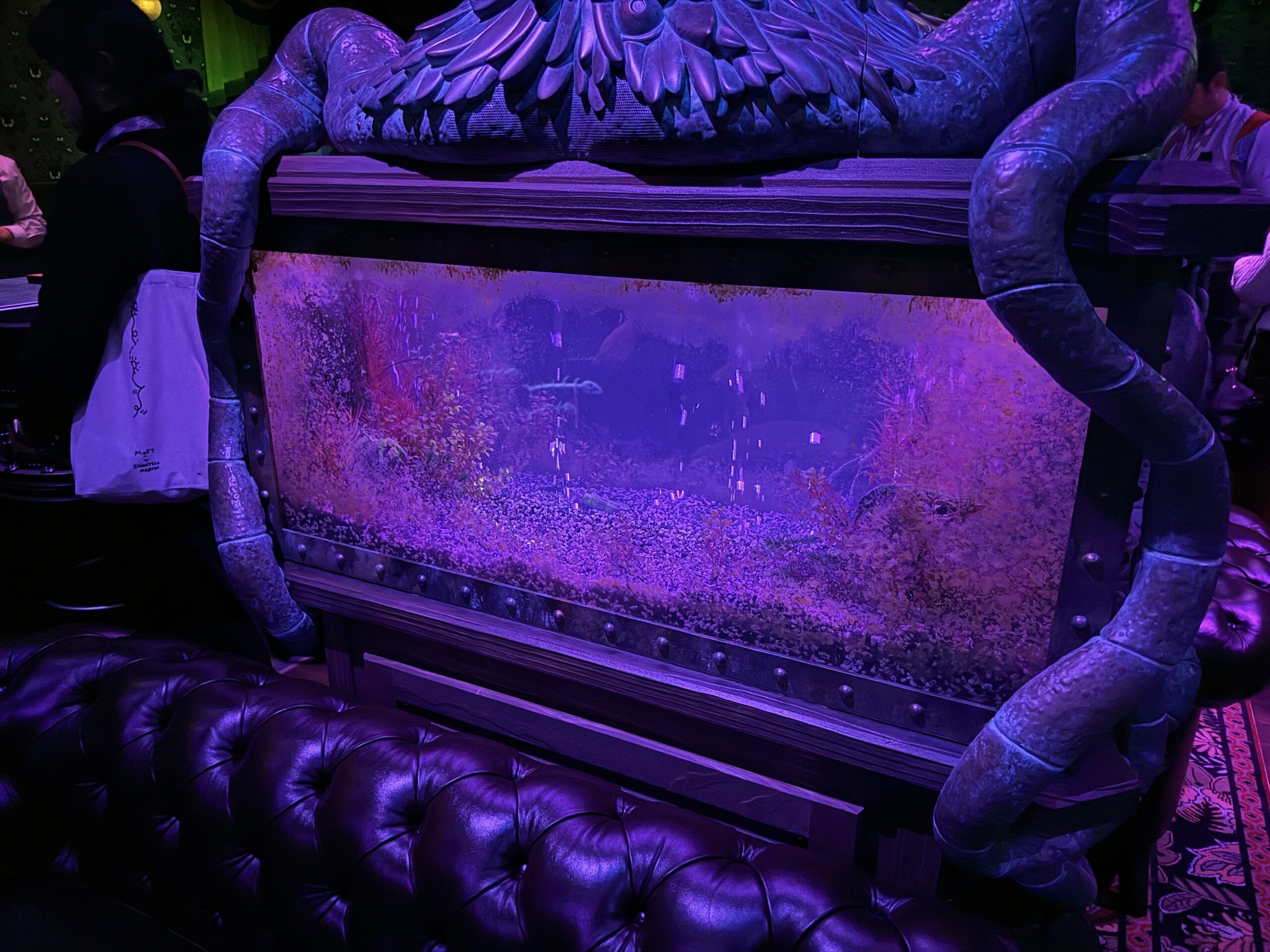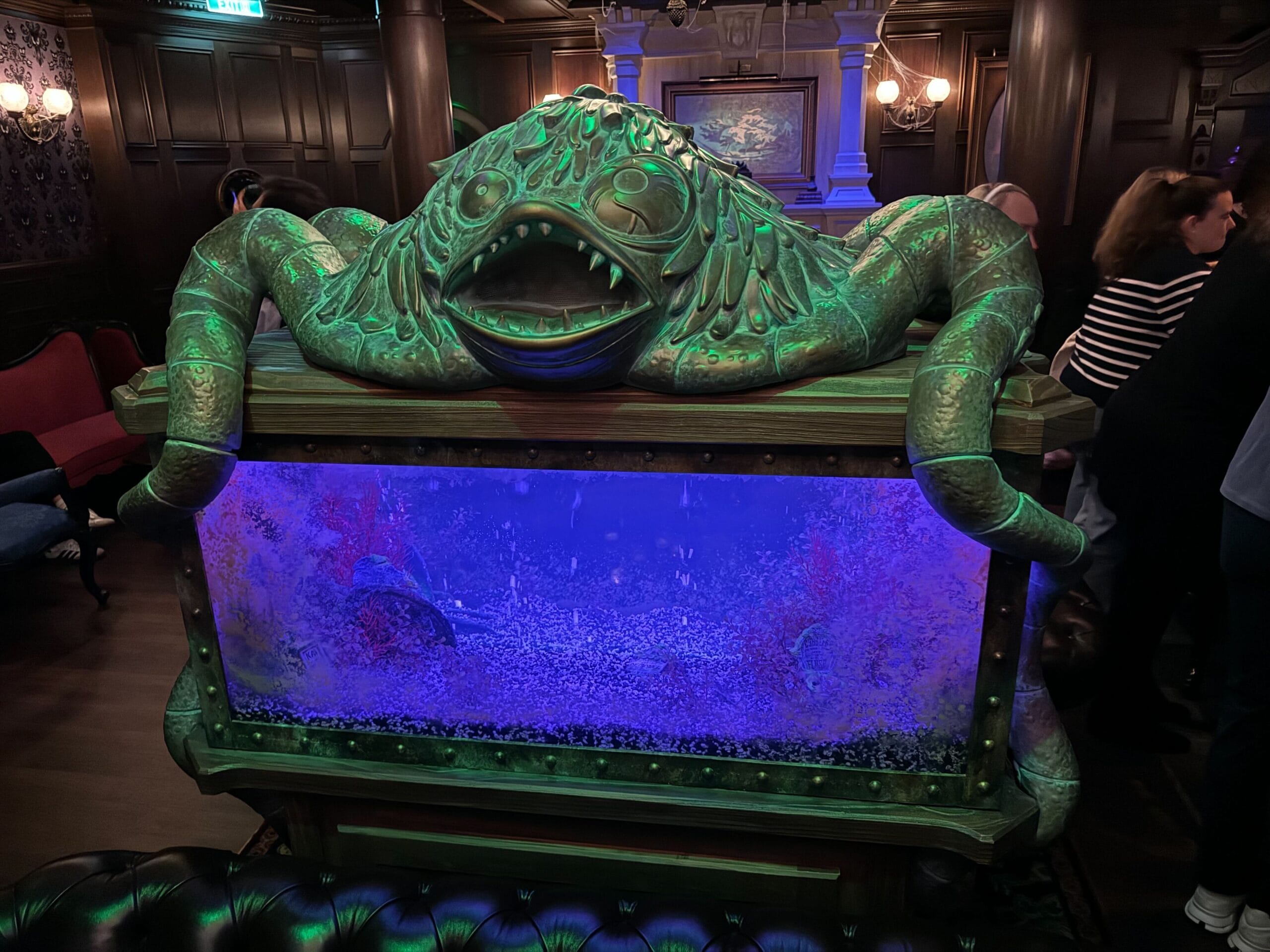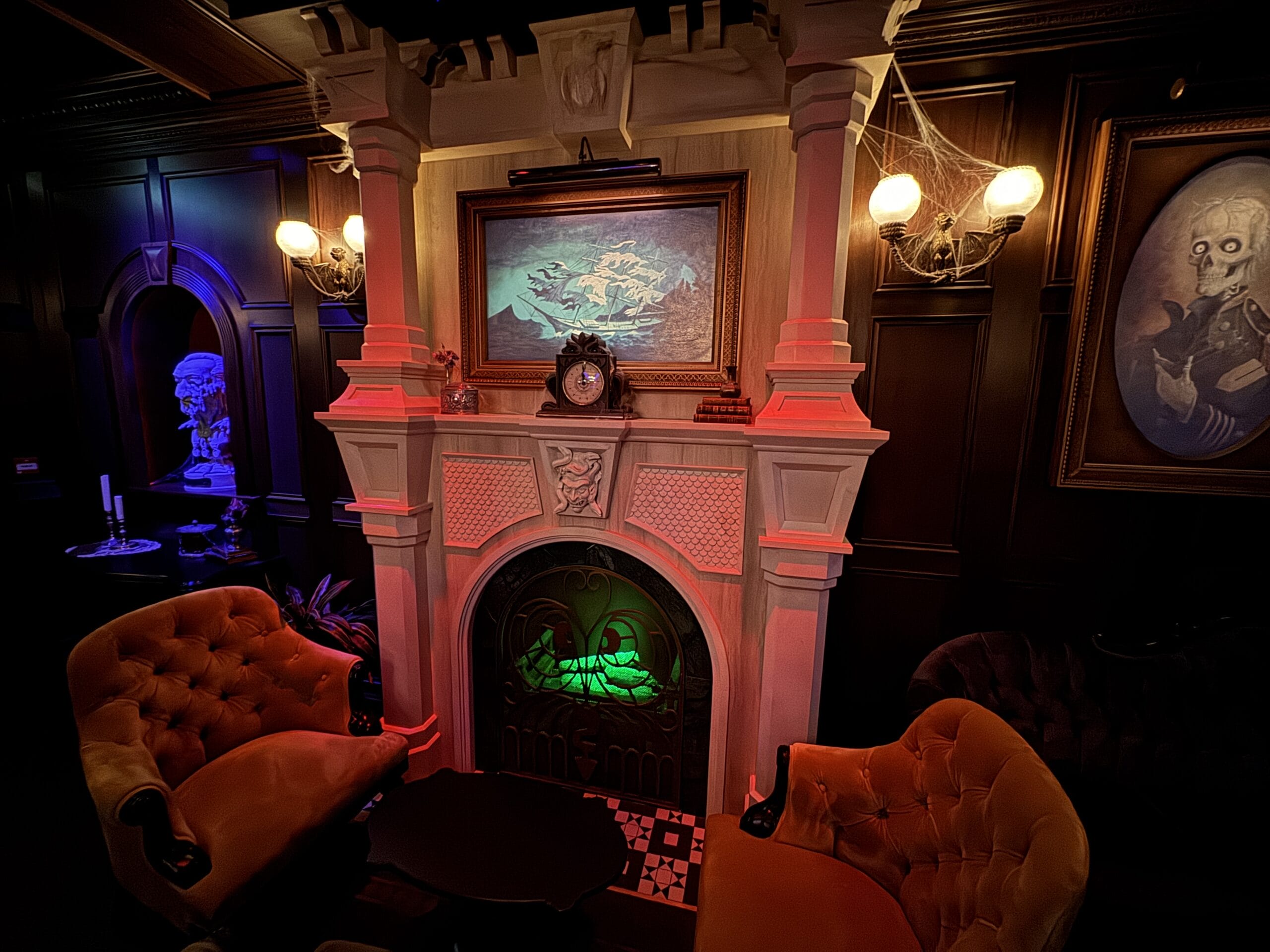 Inside, the bar sits at the far side of the entrance, to the right a fireplace and bust are lit in the same spooky green seen earlier in the foyer. At the center of the room, an eclectic aquarium sits with a ghost fish atop. This is a special homage to Rolly Crump’s “Aquarium with Ghost Fish”.