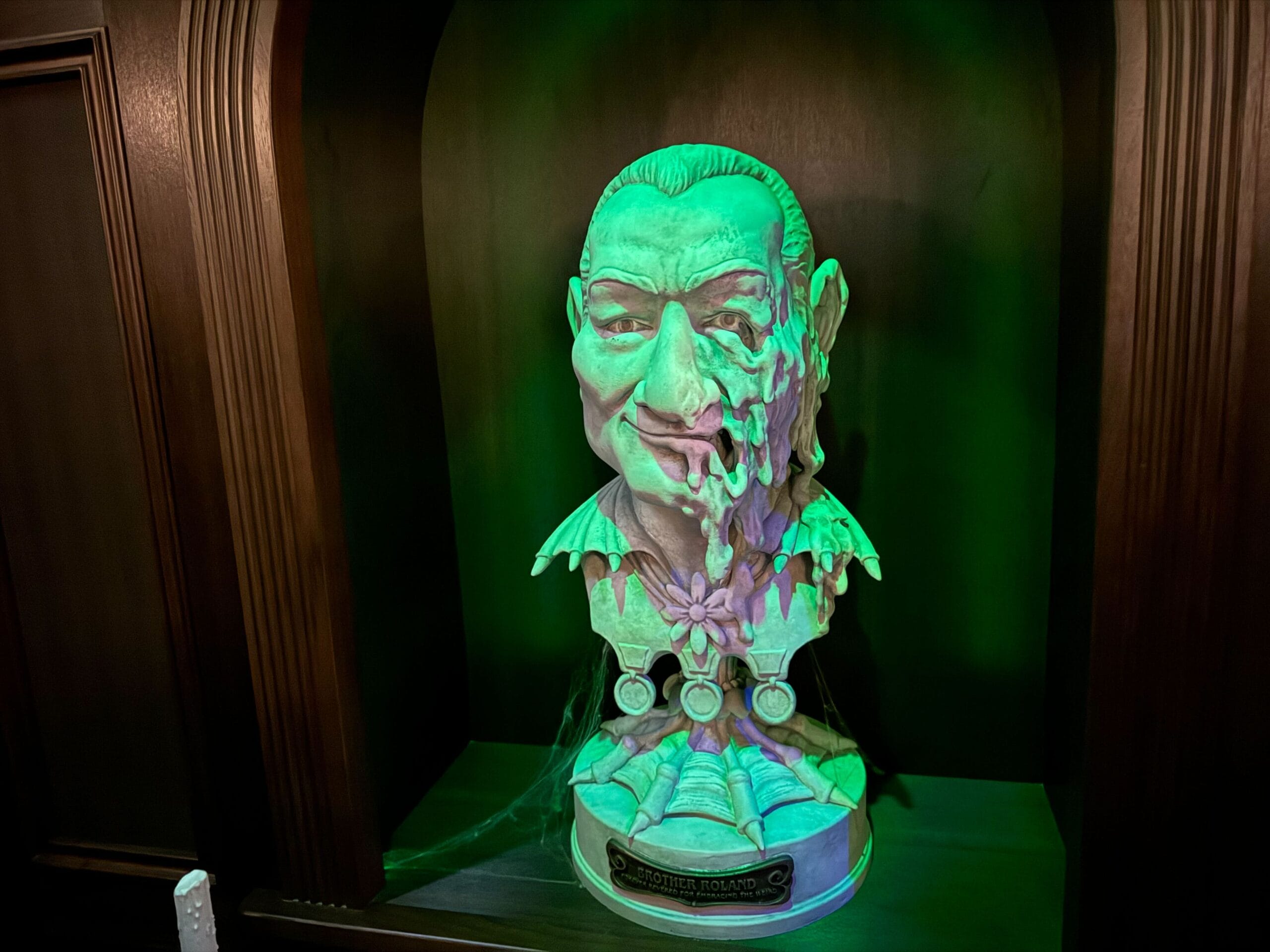 A bust of Brother Roland sits as an homage to the Imagineer and creator Roland “Rolly” Crump. Rolly Crump was on the original Haunted Mansion design team.