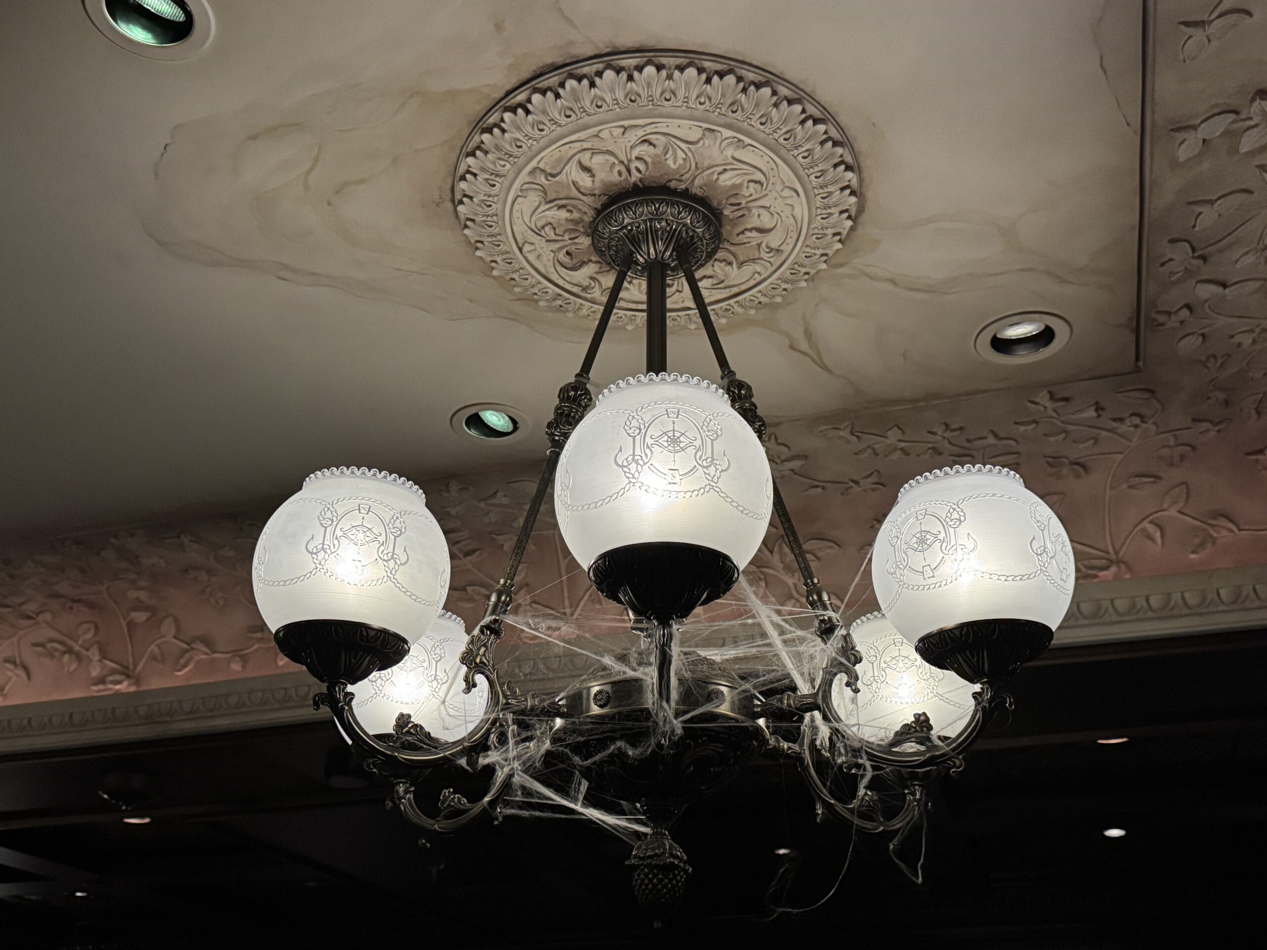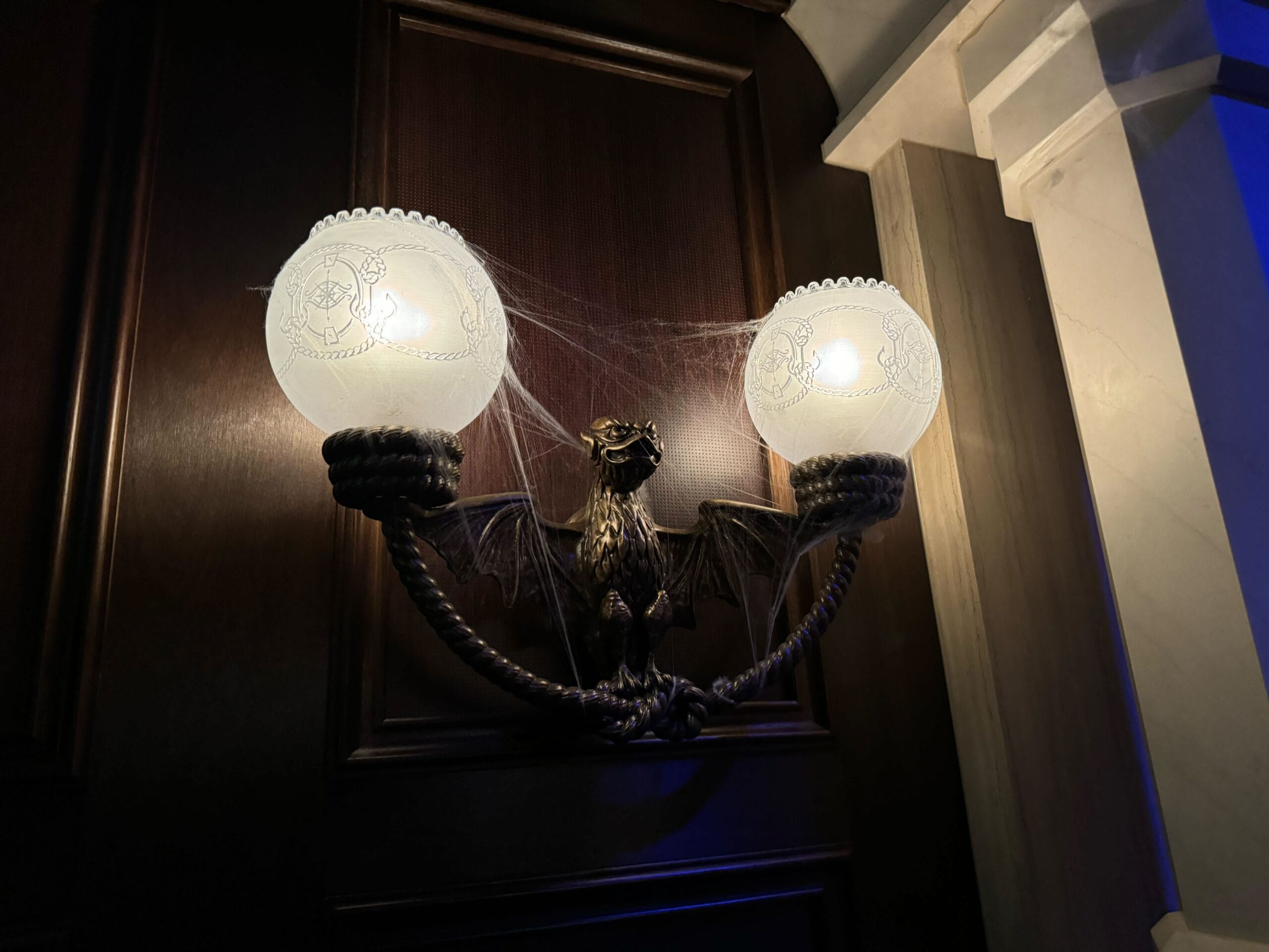 The lanterns affixed to the walls throughout the Parlor feature the iconic bats from The Haunted Mansion’s stanchions. The glass shades feature sketched ropes and other nautical moments. Spiderwebs are across the lanterns.