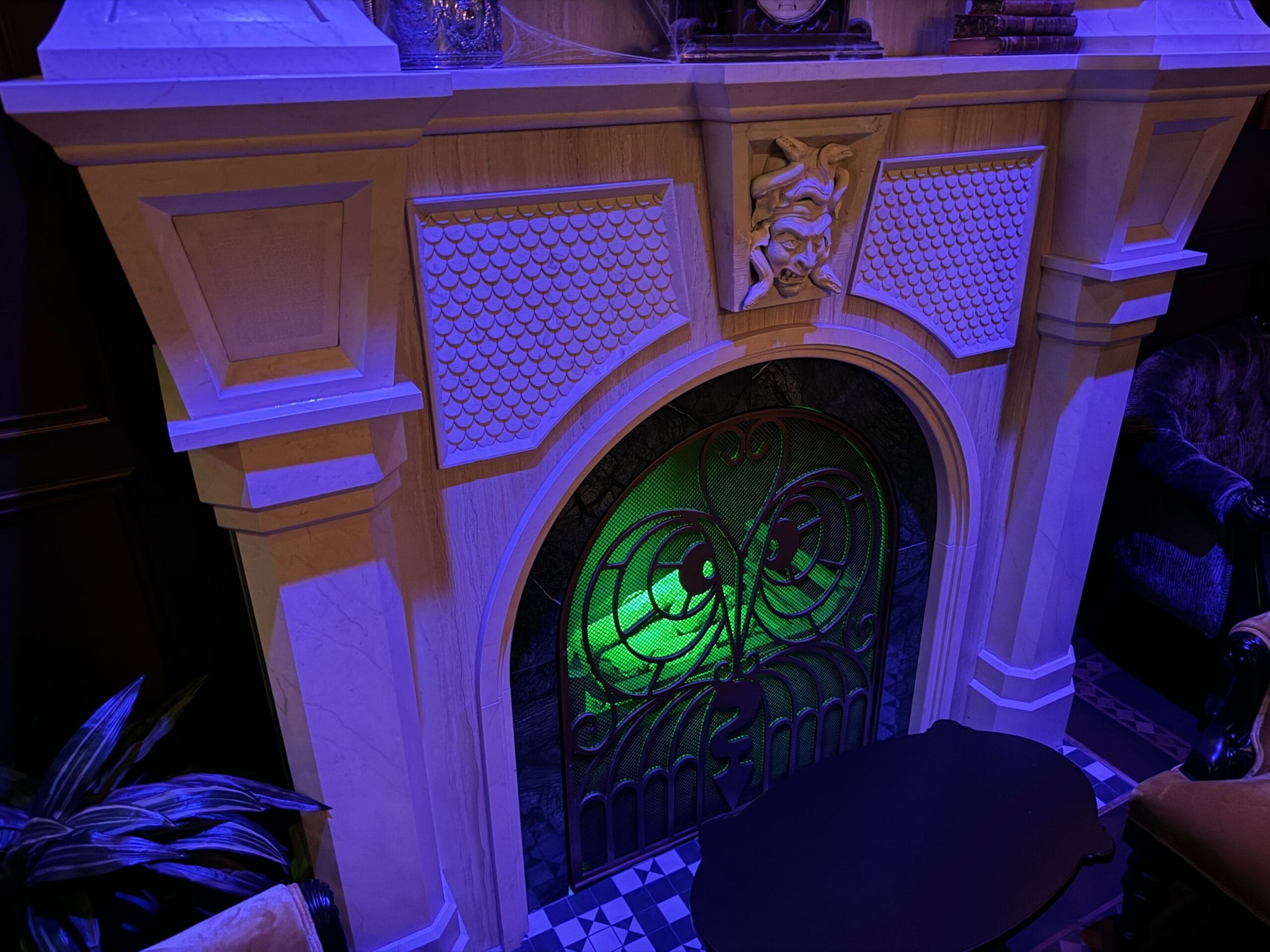 The fireplace is a white marble with the haunted ship’s rendition of the Medusa Lady in the center. There is also familiar detail in the ironwork of the fireplace.