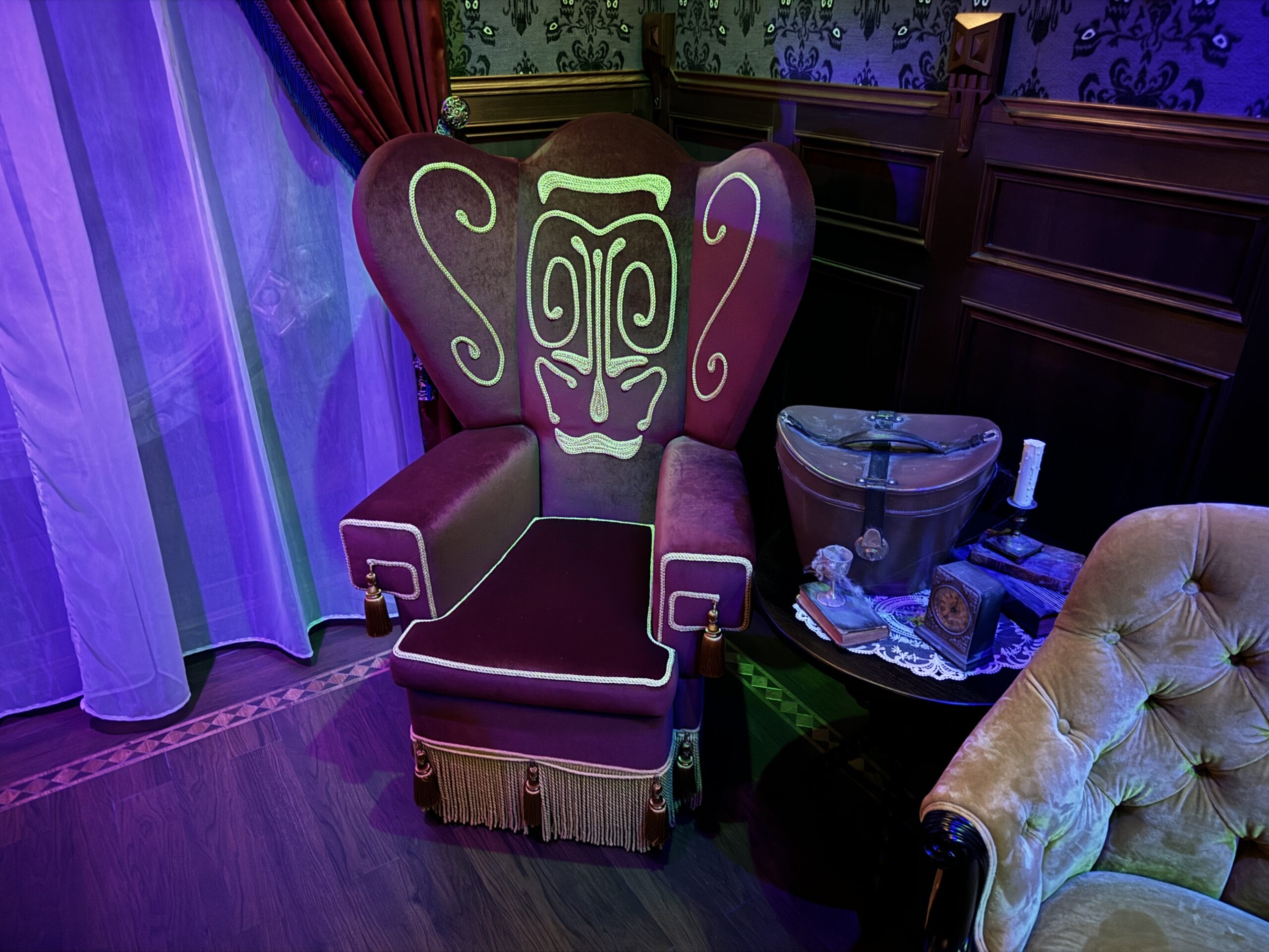 The vintage-style furniture resembles items you might see in The Haunted Mansion. There are small tables next to the sofas and armchairs.