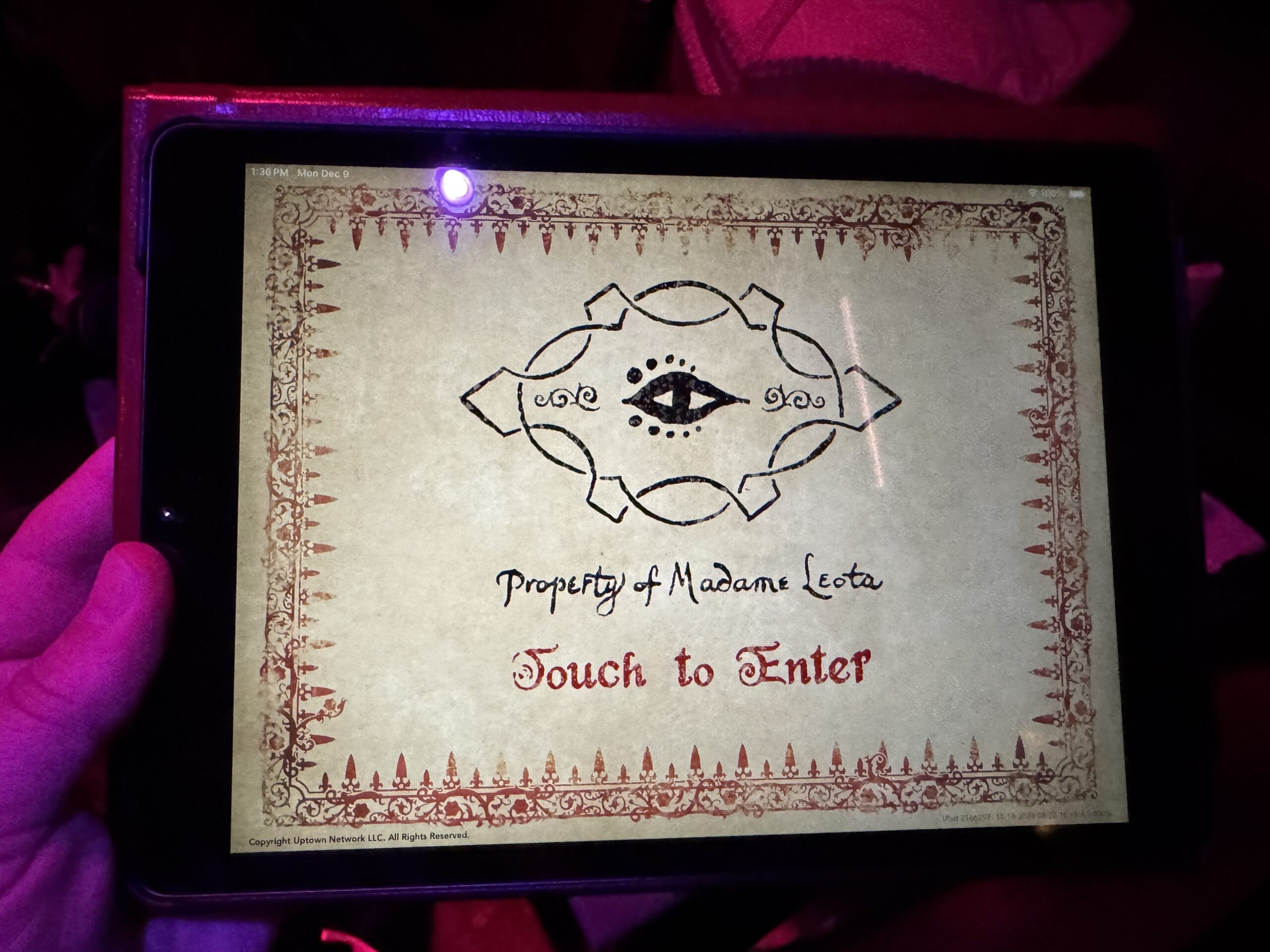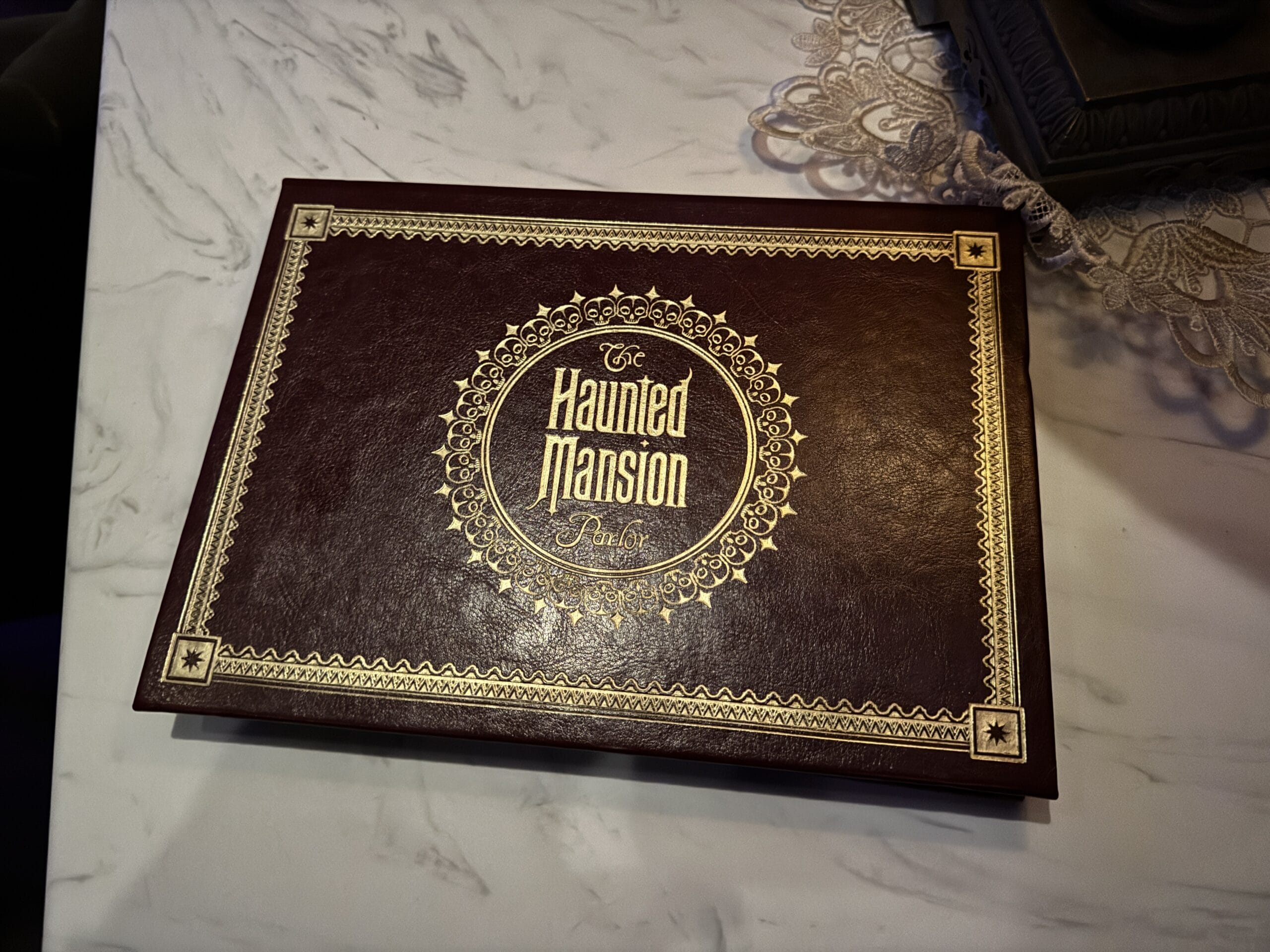 The drinks menu is available via leatherbound tablets. They feature The Haunted Mansion Parlor wordmark on the covers. The virtual menus resemble old book pages.