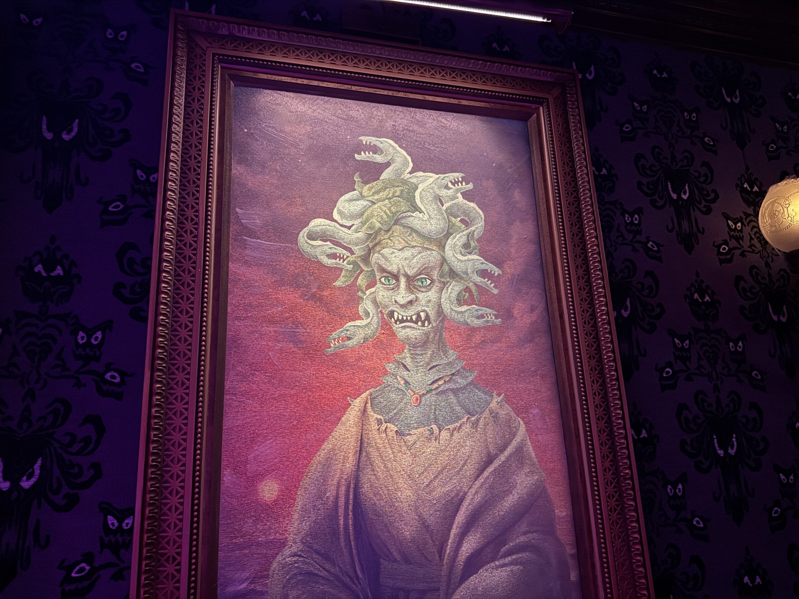 At the top of the golden frame, there is the iconic Haunted Mansion Bat that can be found on the stanchions at The Haunted Mansion across the Disney parks internationally.