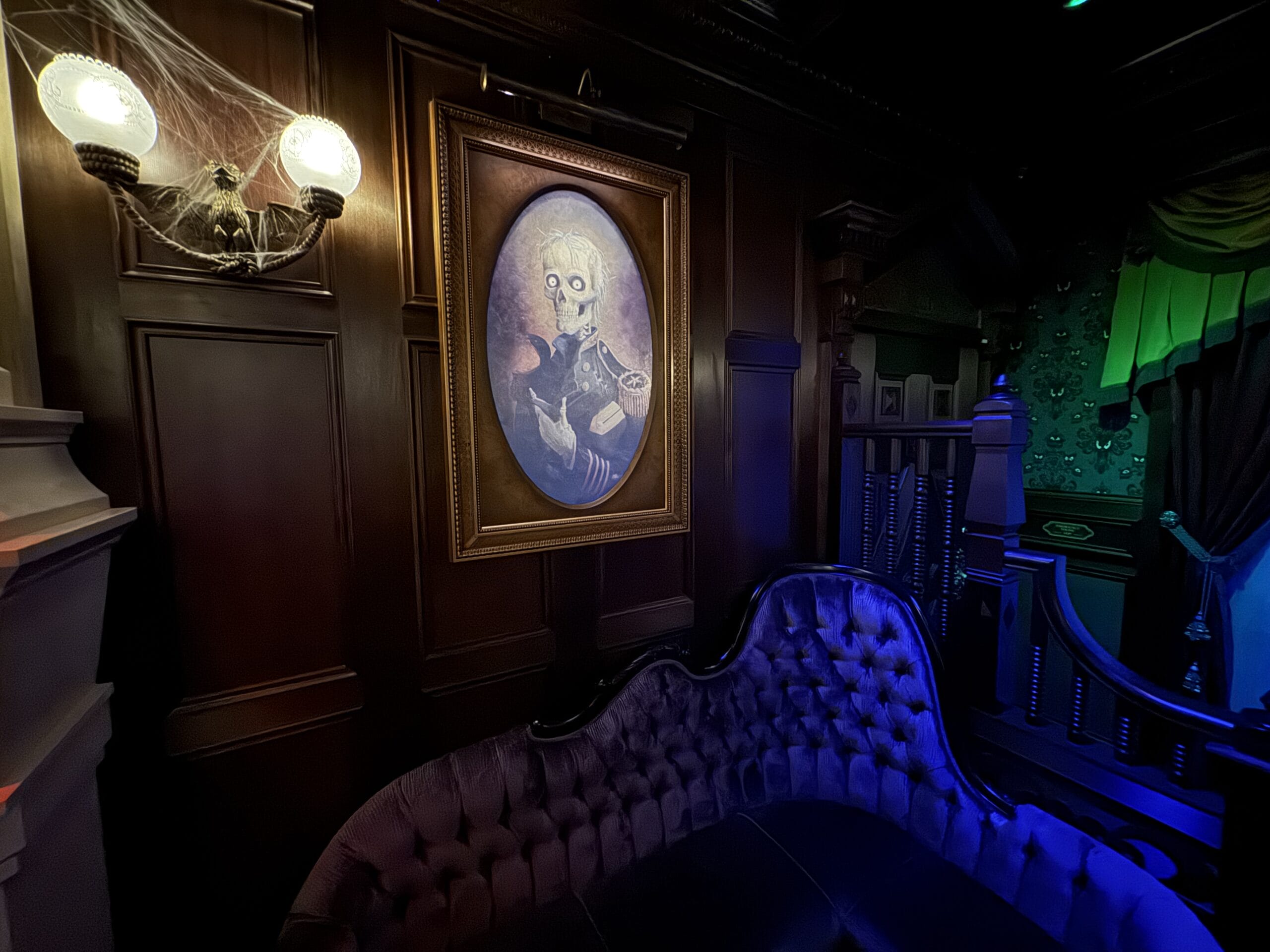 Along the left-side wall is the Parlor’s portrait gallery, which includes art of the wandering souls that have taken up residence on the Disney Treasure. These pieces mimic the art stylings utilized by Imagineers for the original Haunted Mansion in 1969, as well as use present-day technologies to transform the portraits.