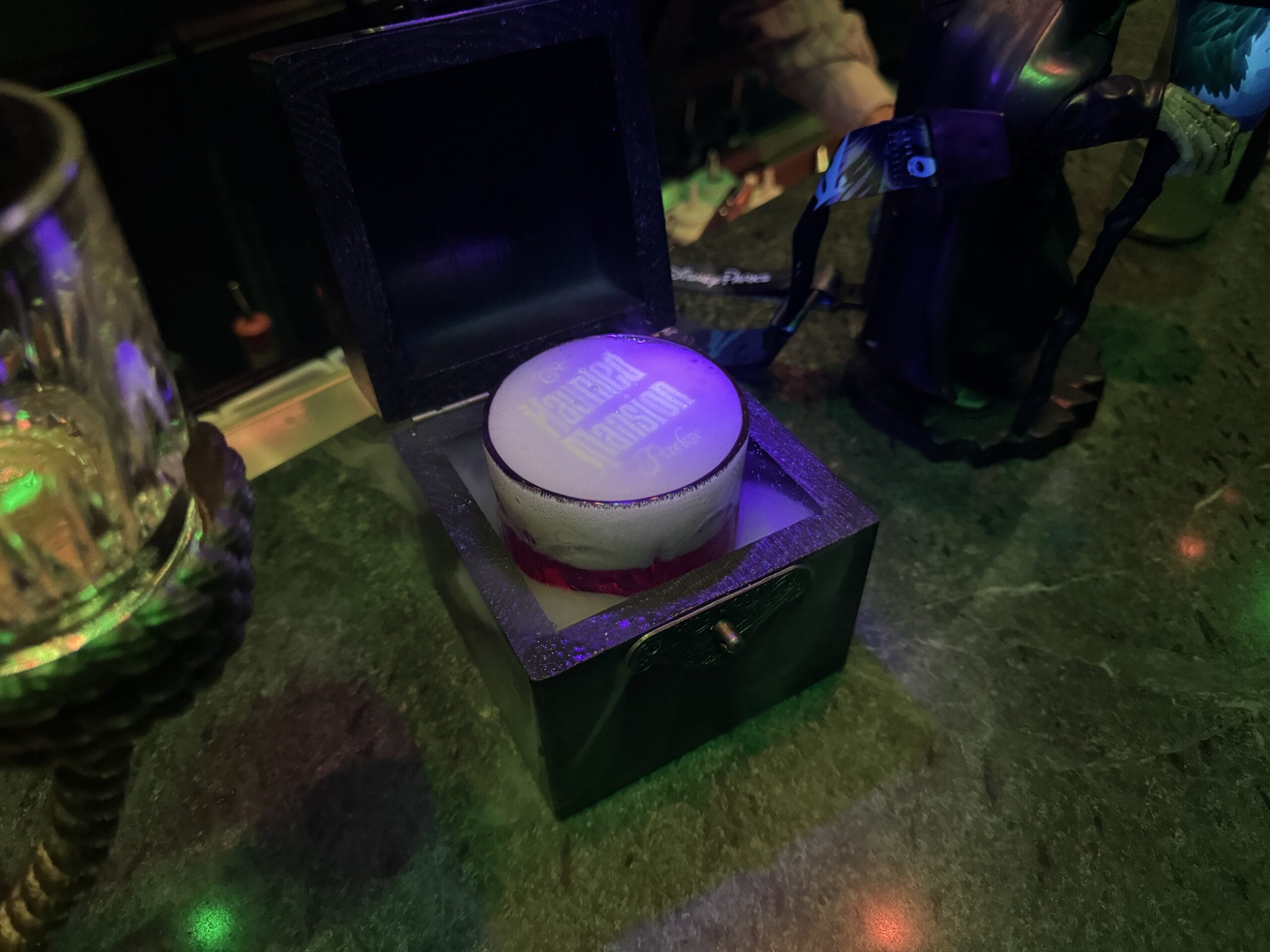 The bar features a green marble which perfectly matches the iconic purple wallpaper. At the back of the bar, there is a mirror, which not only helps to make the space feel bigger but there is an added surprise lurking. The longer you look in, the more likely you are to spot the ghostly figures straight from the Haunted Mansion.