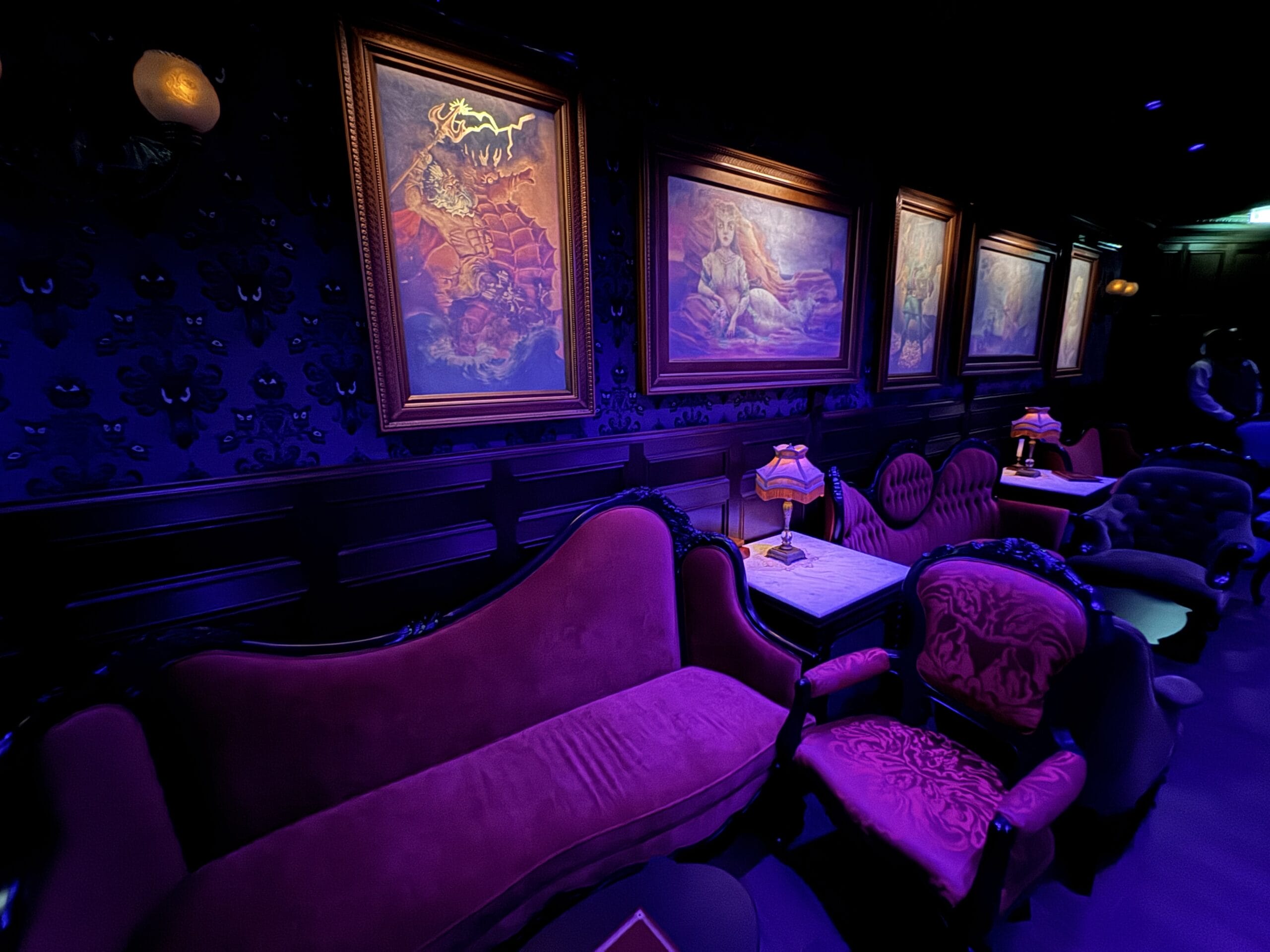 The Haunted Mansion Parlor is accessible beyond a red curtain in an archway near the Skipper Society Lounge.