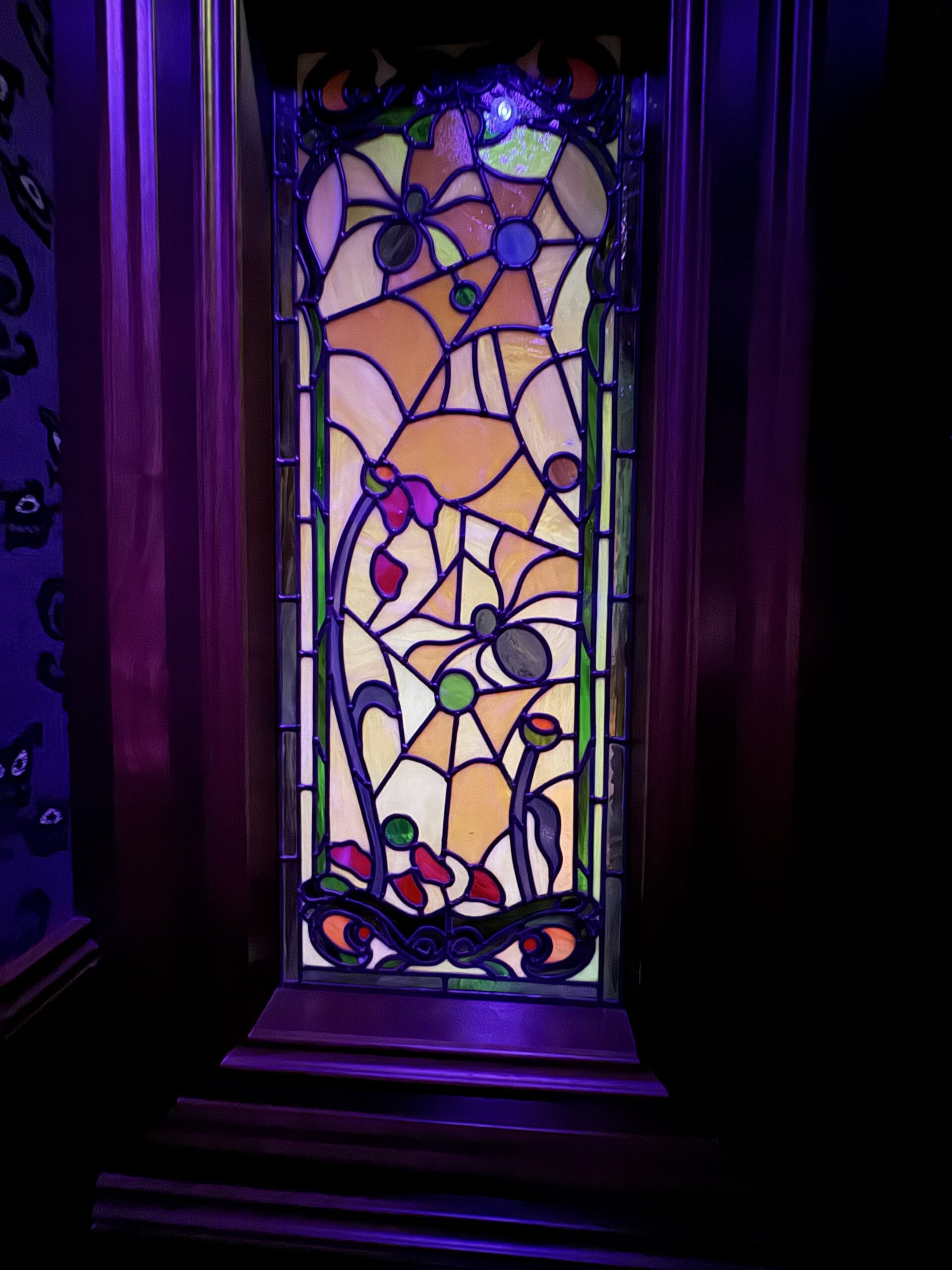 To the side of the entrance door is a fake stained glass window featuring spiders, dead flowers, and creepy eyes.