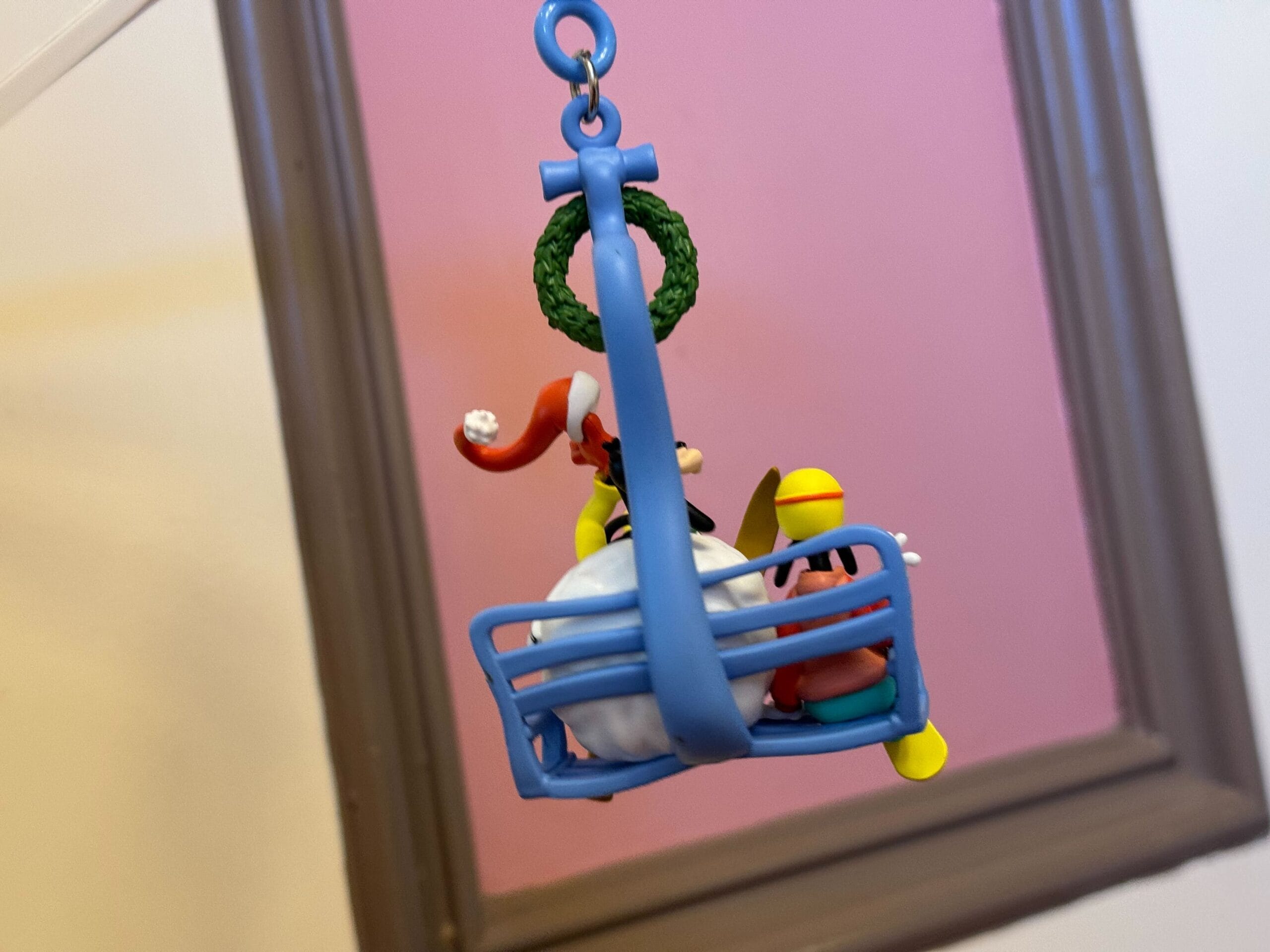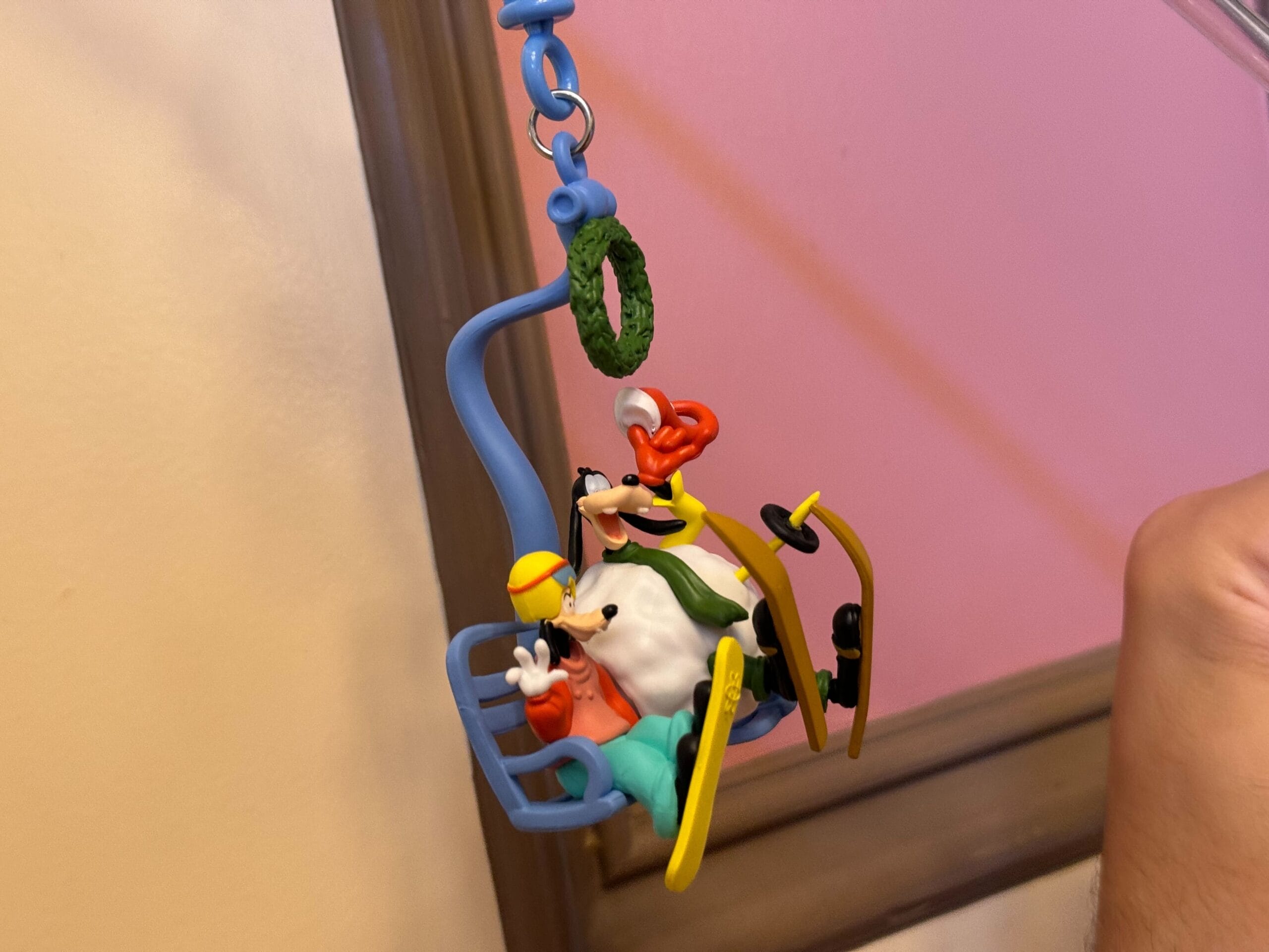 Goofy and his son Max ride a ski lift from your beverage, hanging from a blue lobster clip. Max is ready to snowboard with his helmet and goggles. Goofy has already been having some problems, as he’s all rolled up in a giant snowball. He holds onto his Santa hat before it can fall off the lift.