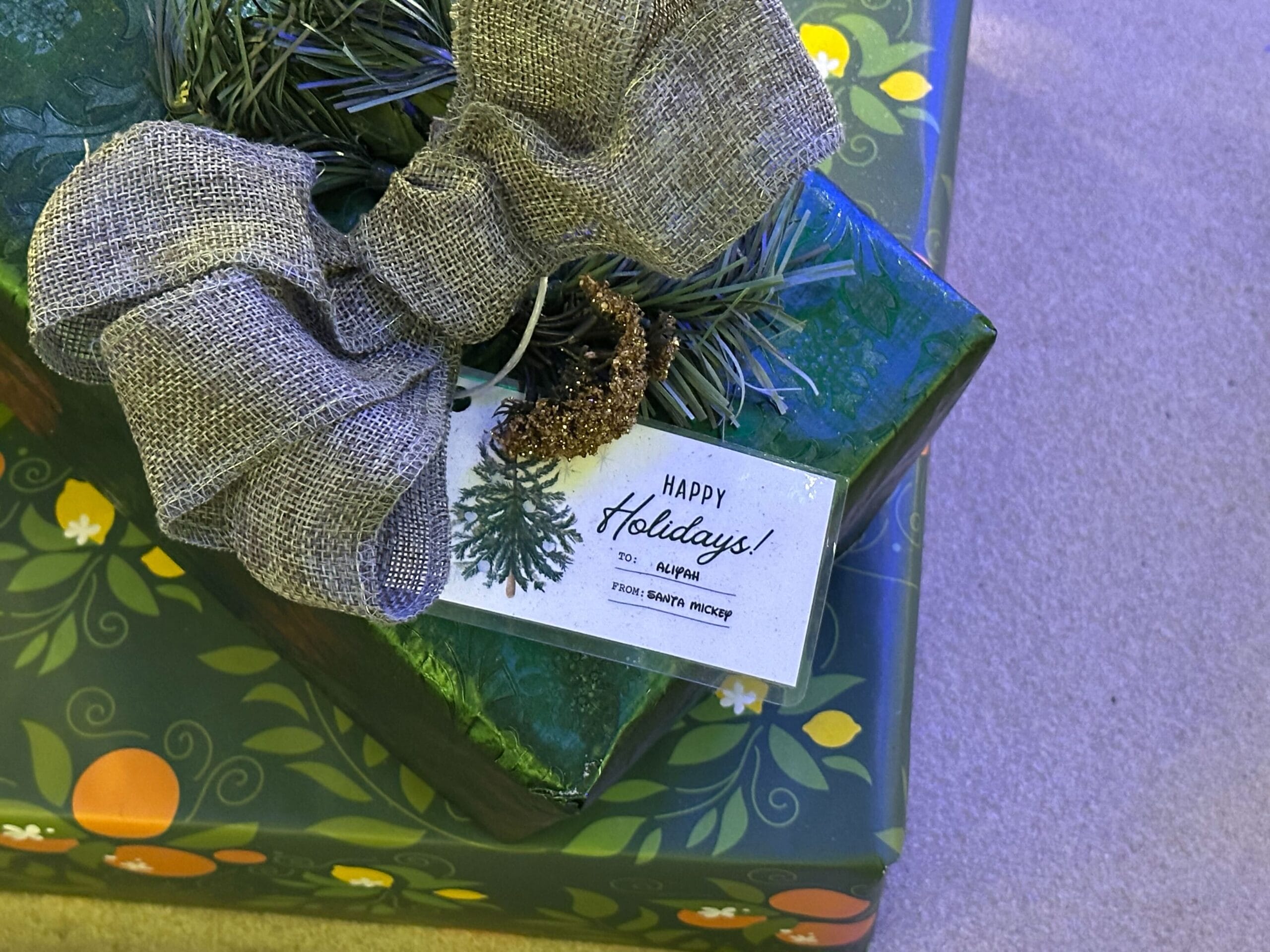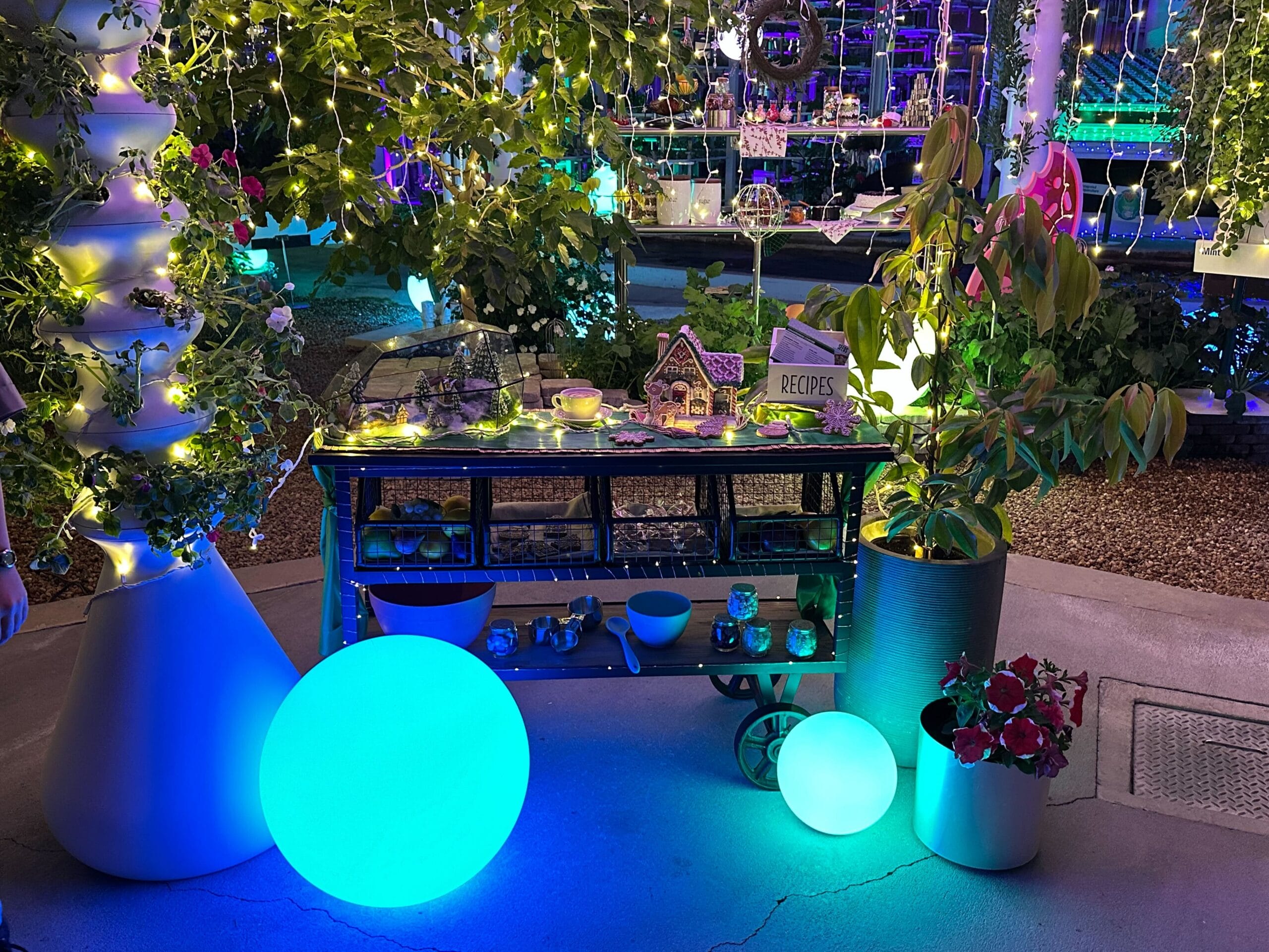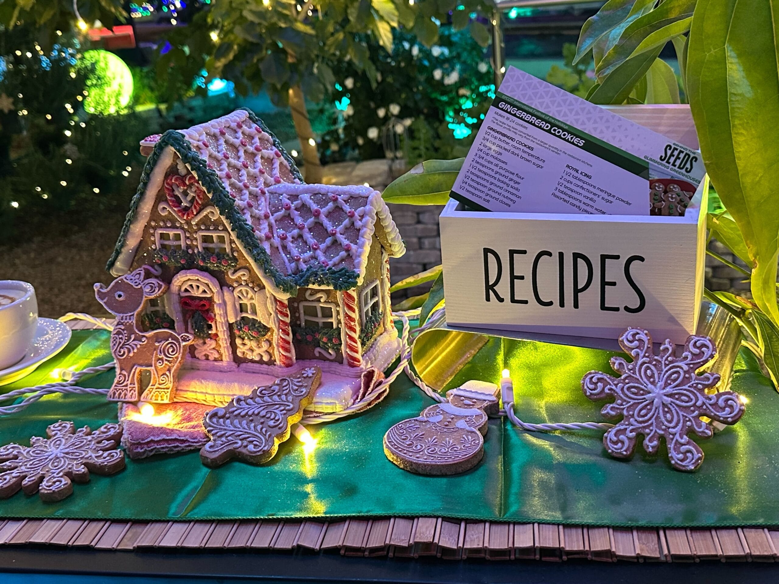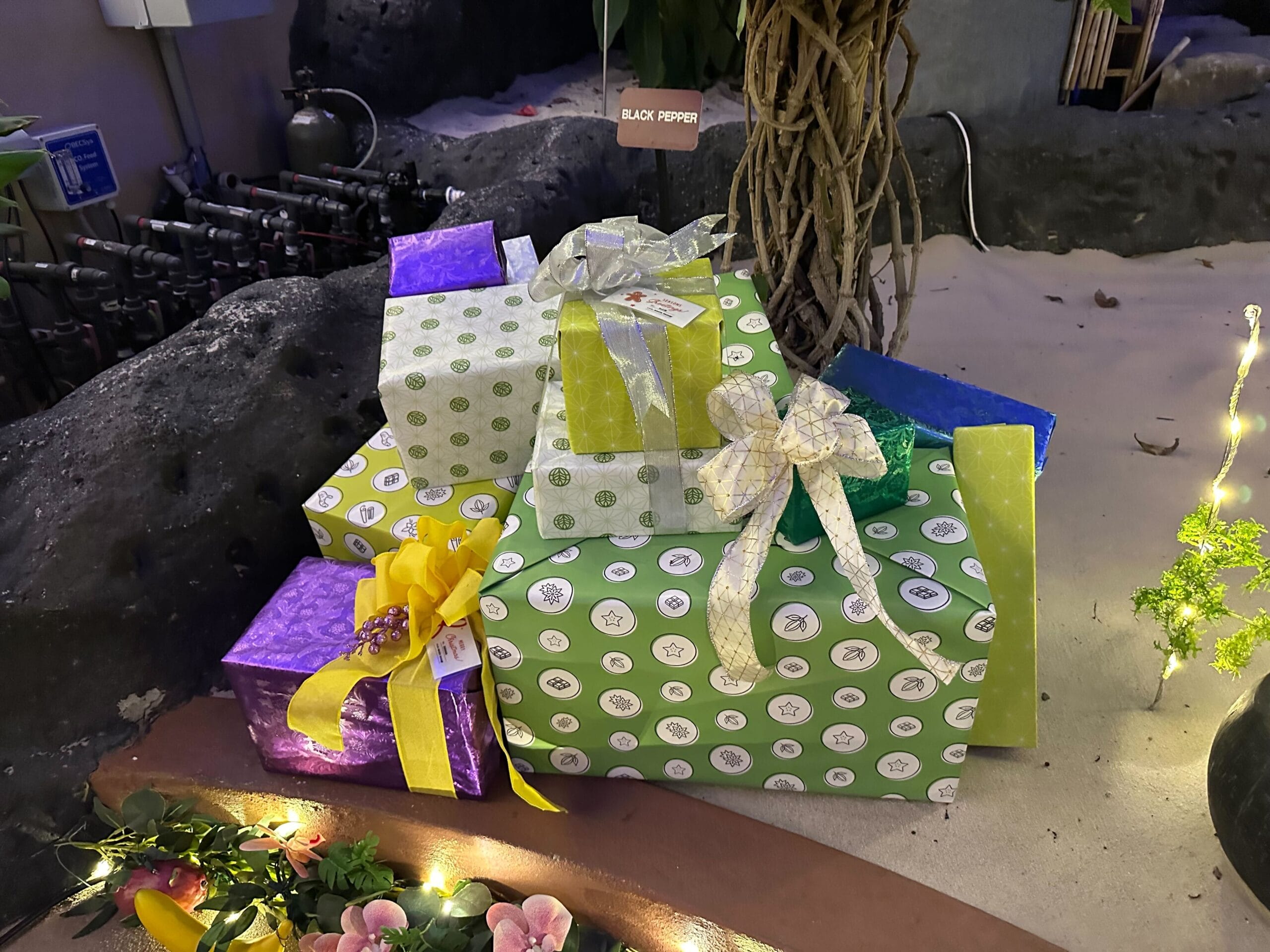 Walt Disney Imagineering’s influence can be seen throughout, including wrapping paper that honors the plants, and the light colors of white, green and blue, meant to honor the planet.