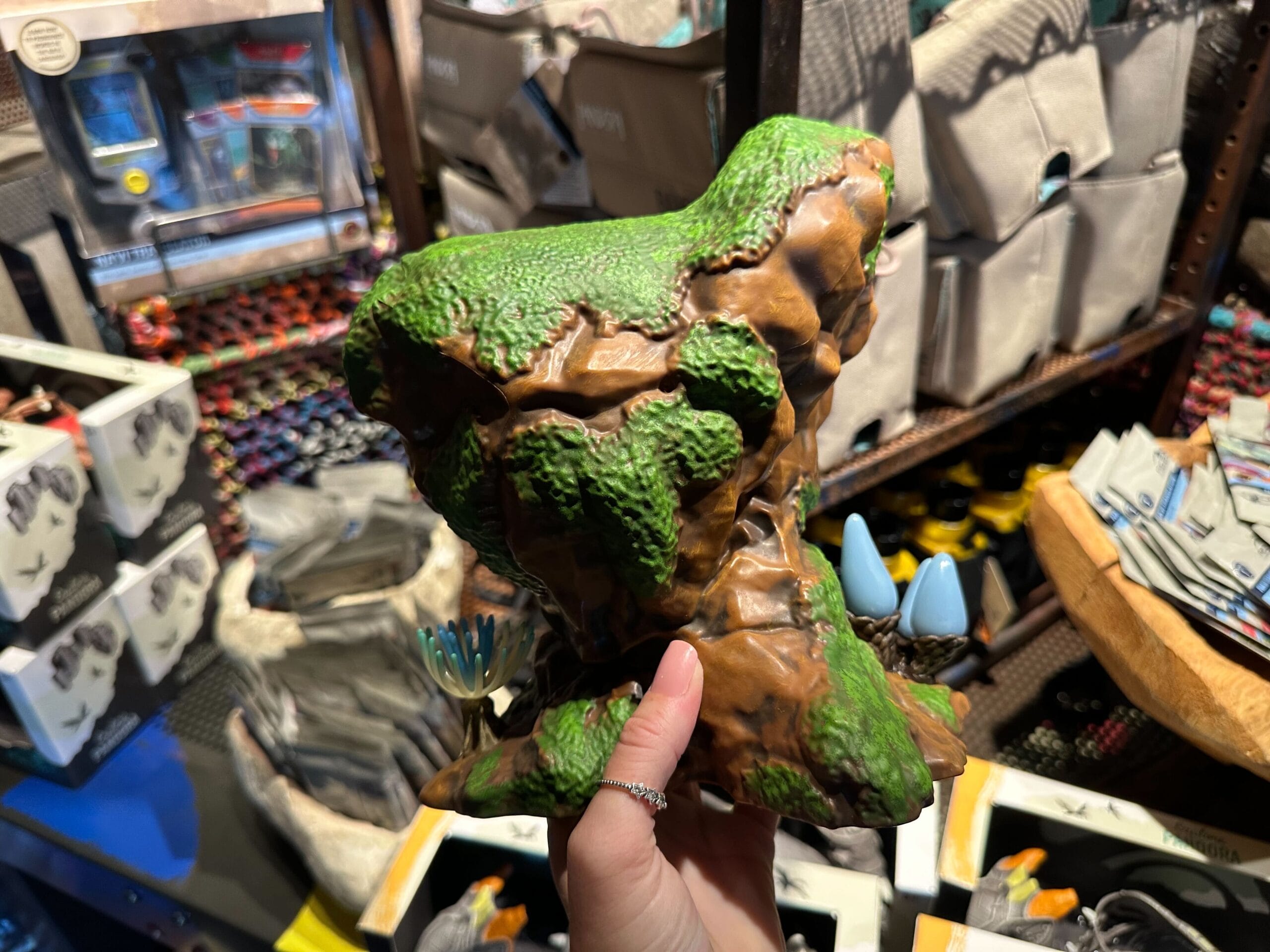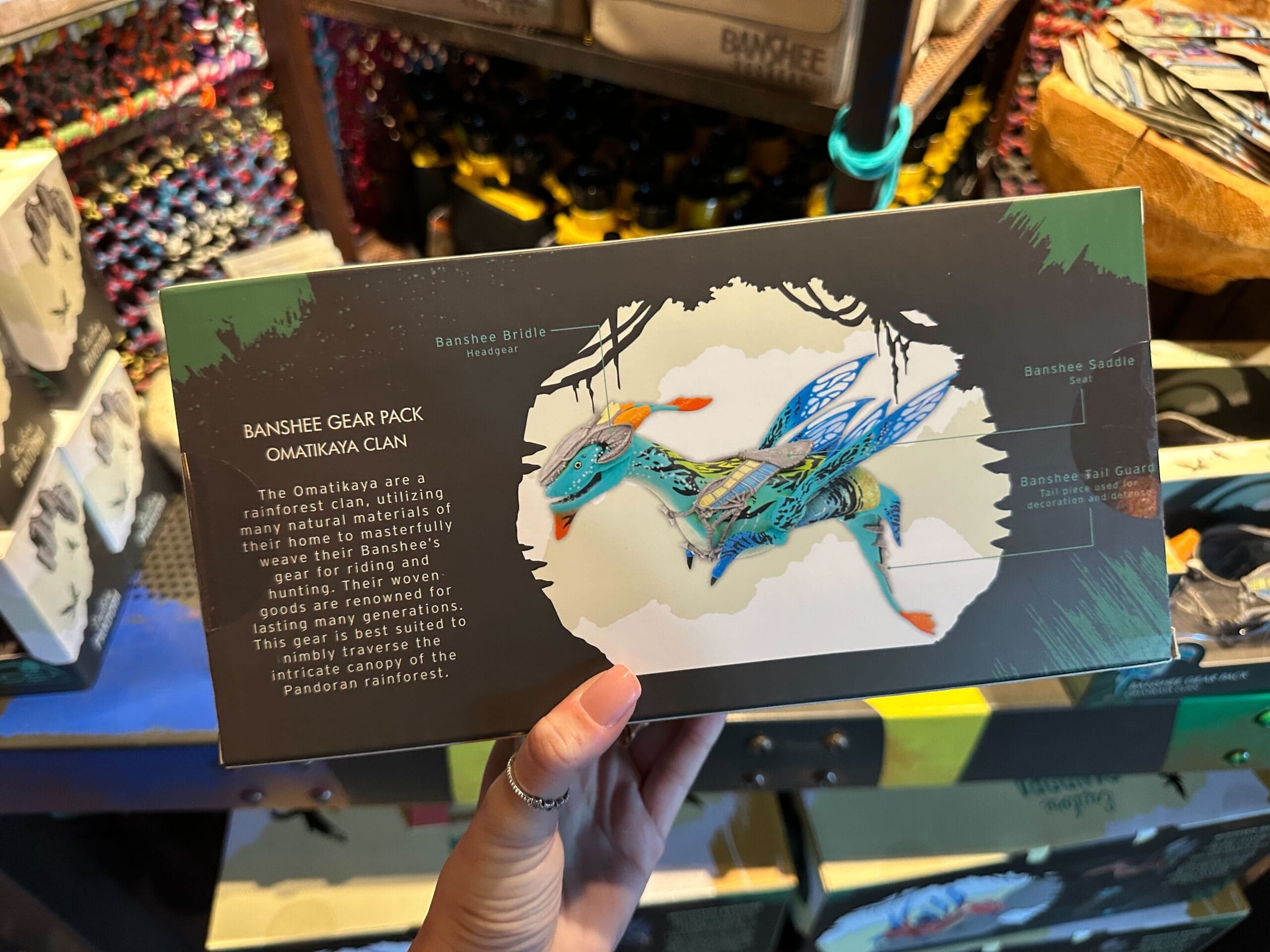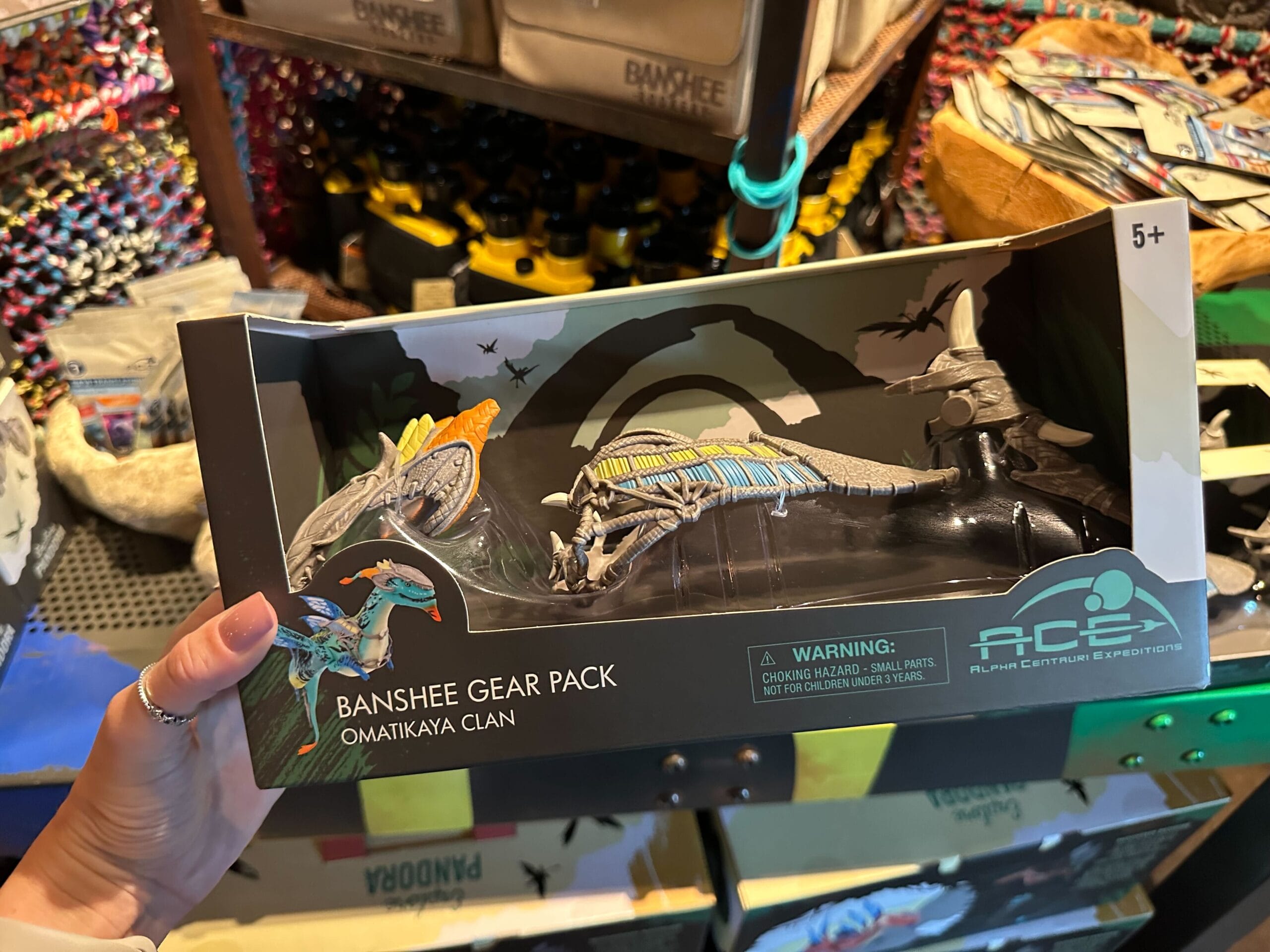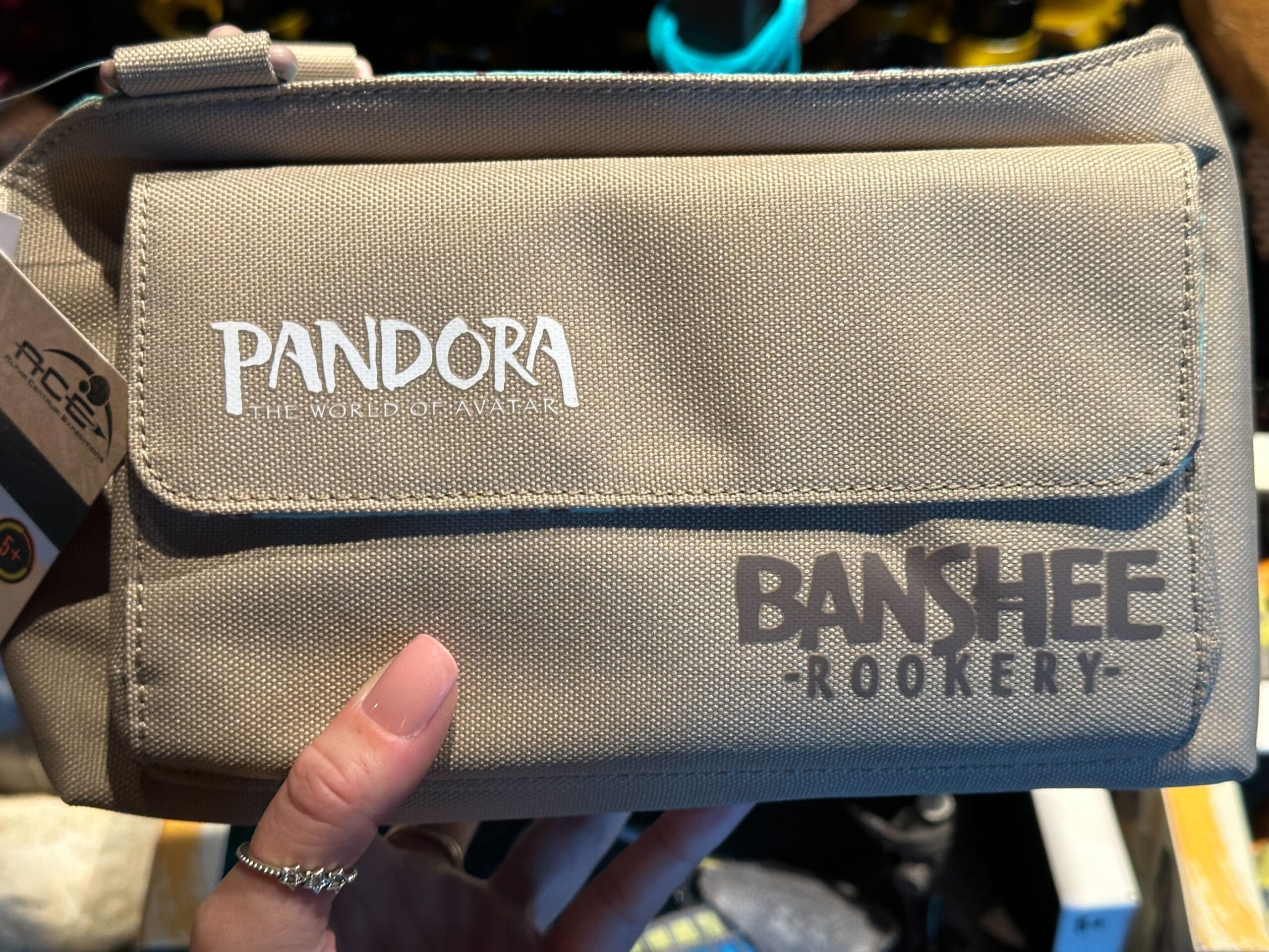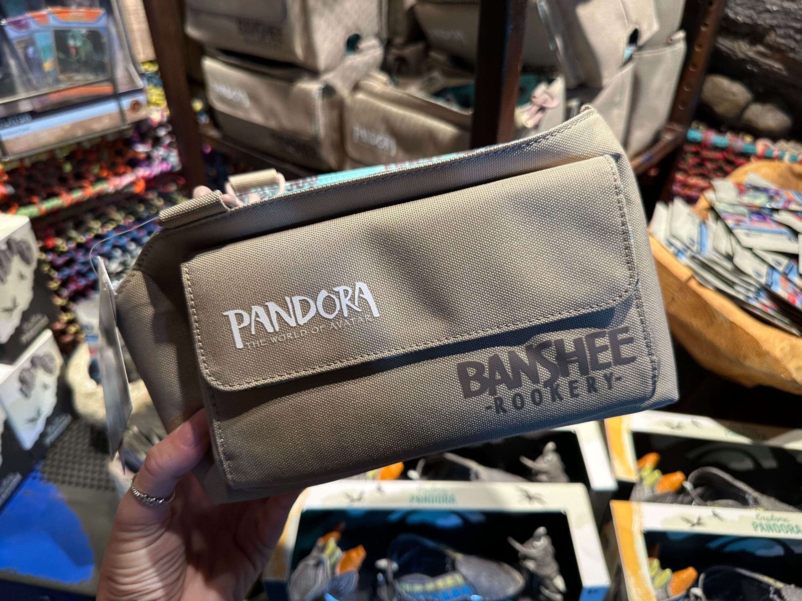 A hand holds a beige pouch with "Pandora: The World of Avatar" and "Banshee Rookery" printed on it. Shelves with similar pouches and toys are visible in the background.