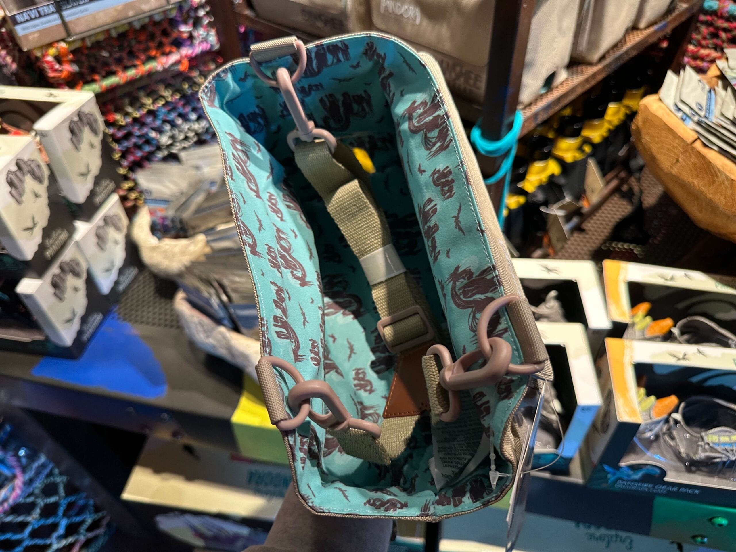 Open beige bag with a turquoise lining featuring a pattern of brown cowboy hats, horseshoes, and small bats. Pink chain straps are attached to the bag.
