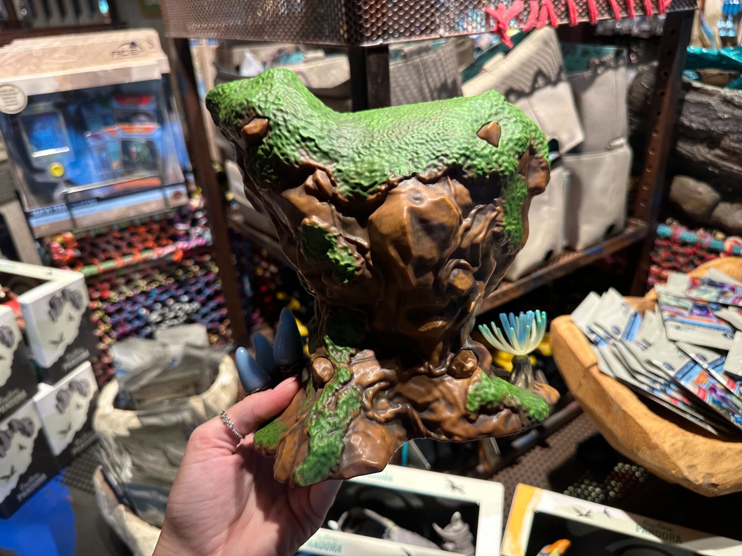 A hand holds a beige bag with "Pandora: The World of Avatar" and "Banshee Rookery" printed on it.