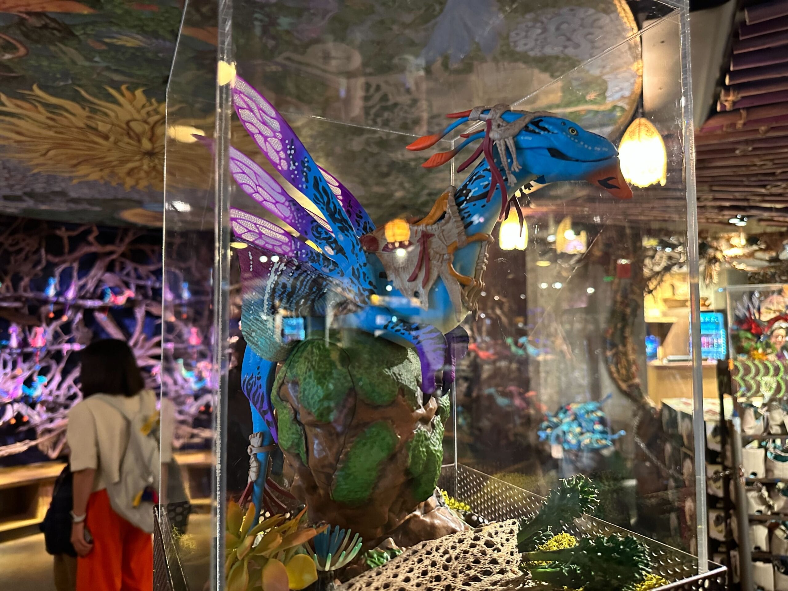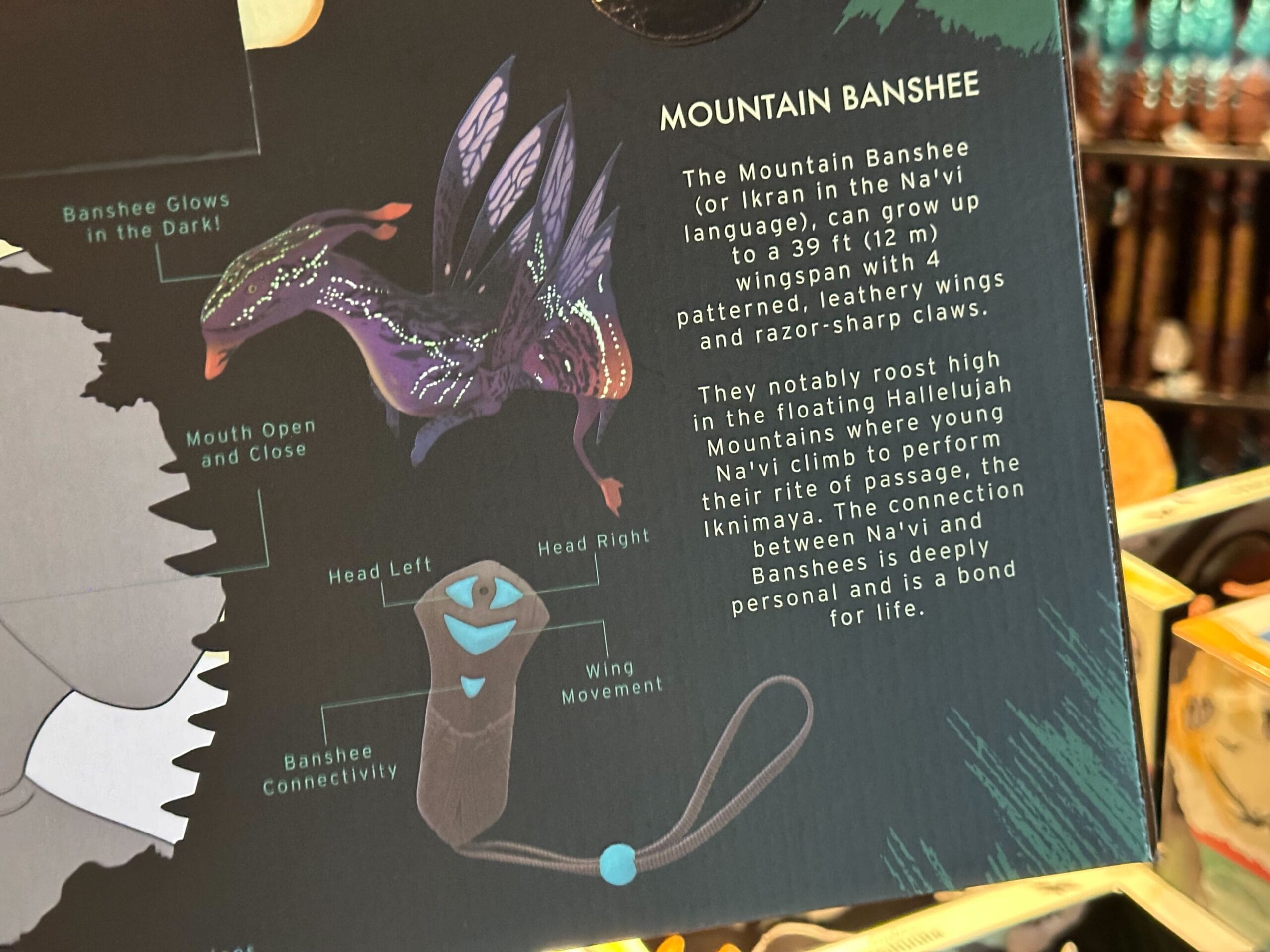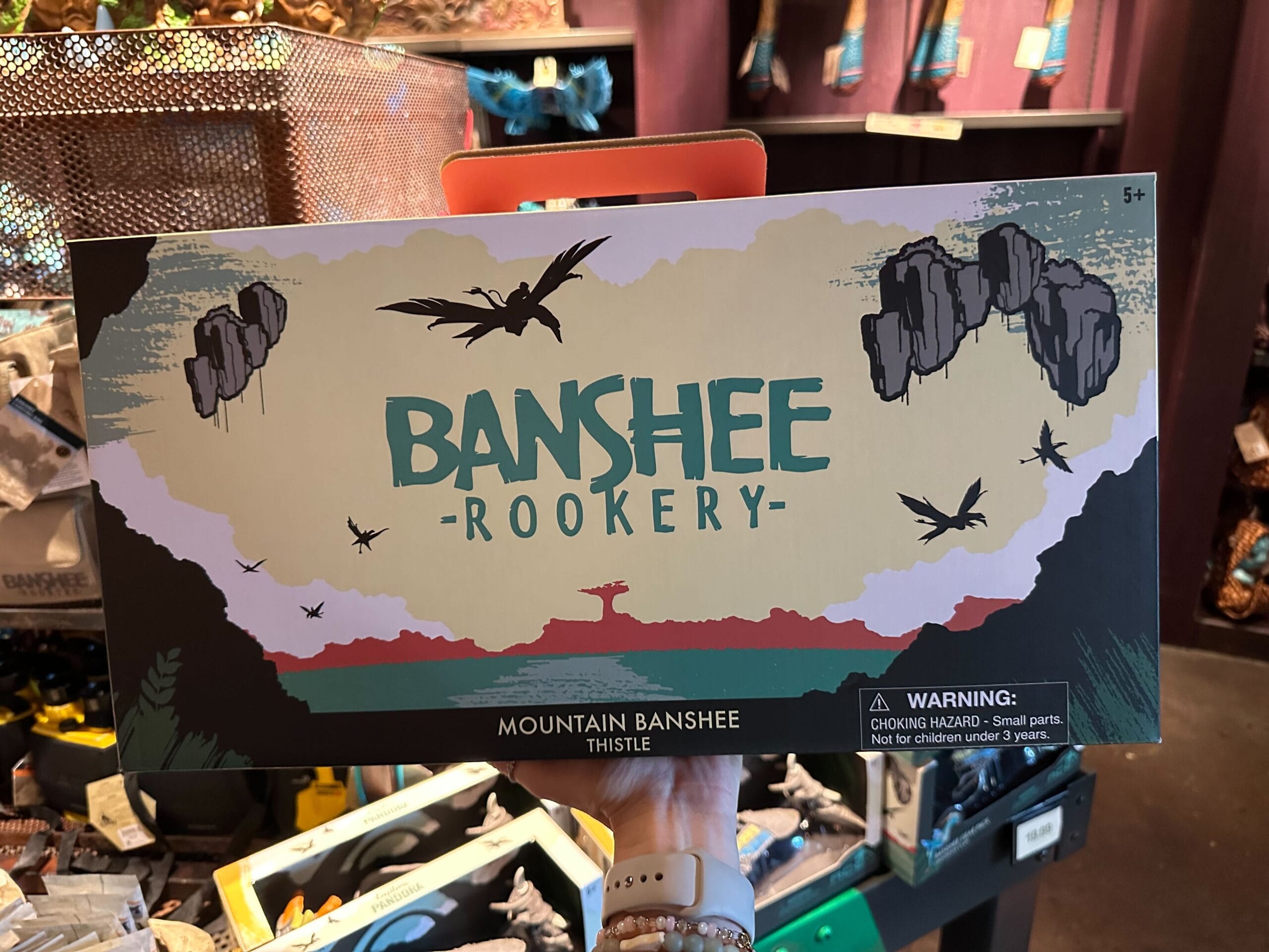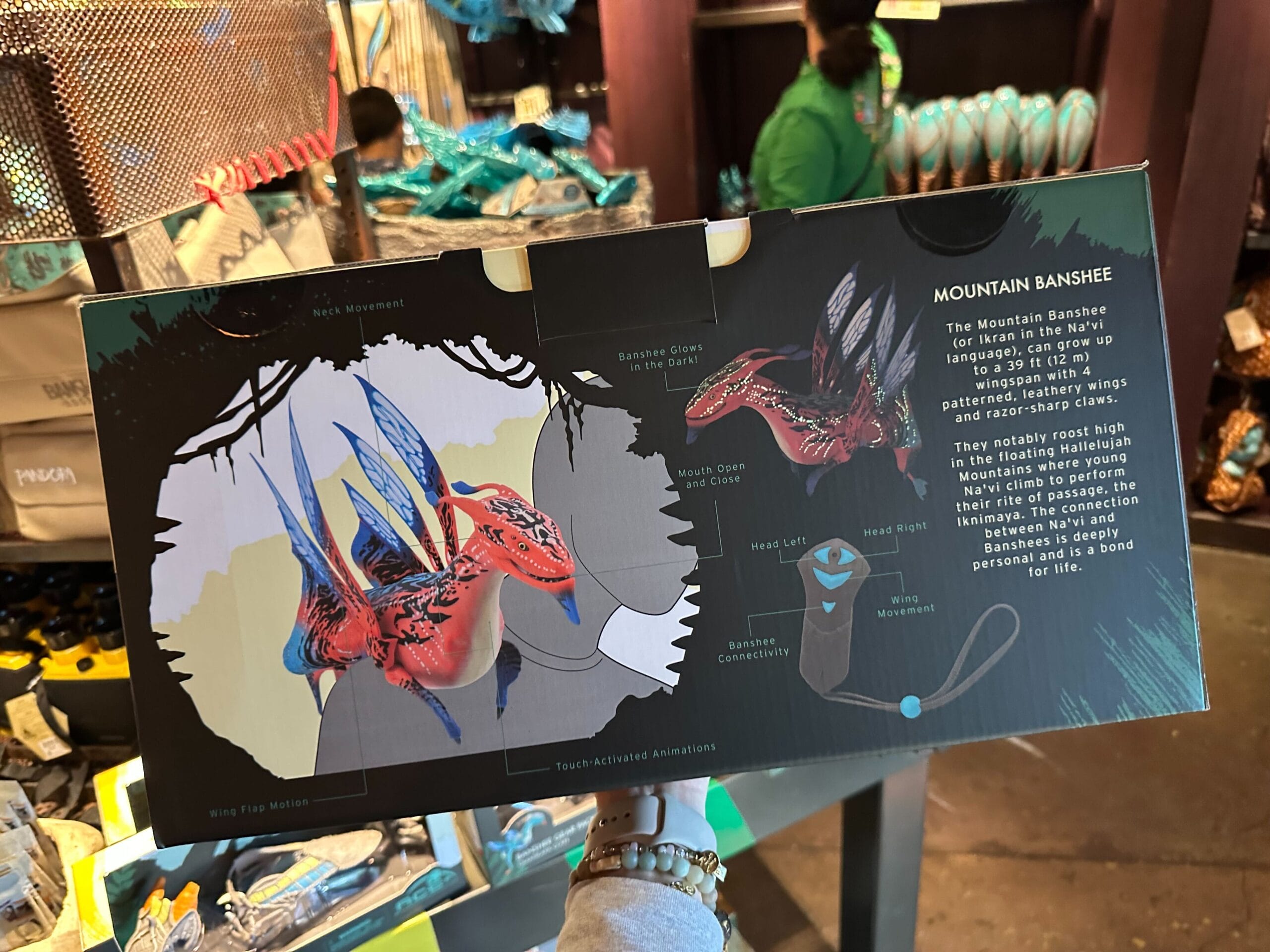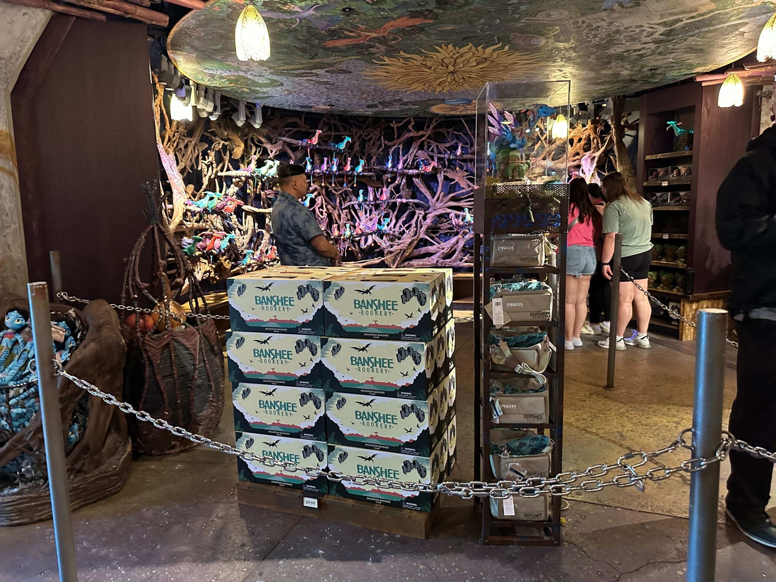 A store display at Disney's Animal Kingdom showcases stacked boxes labeled "Banshee," with merchandise and accessories on shelves. Interactive Shoulder Banshees enchant three people browsing, while tree-like structures and soft lighting enhance the magical atmosphere.