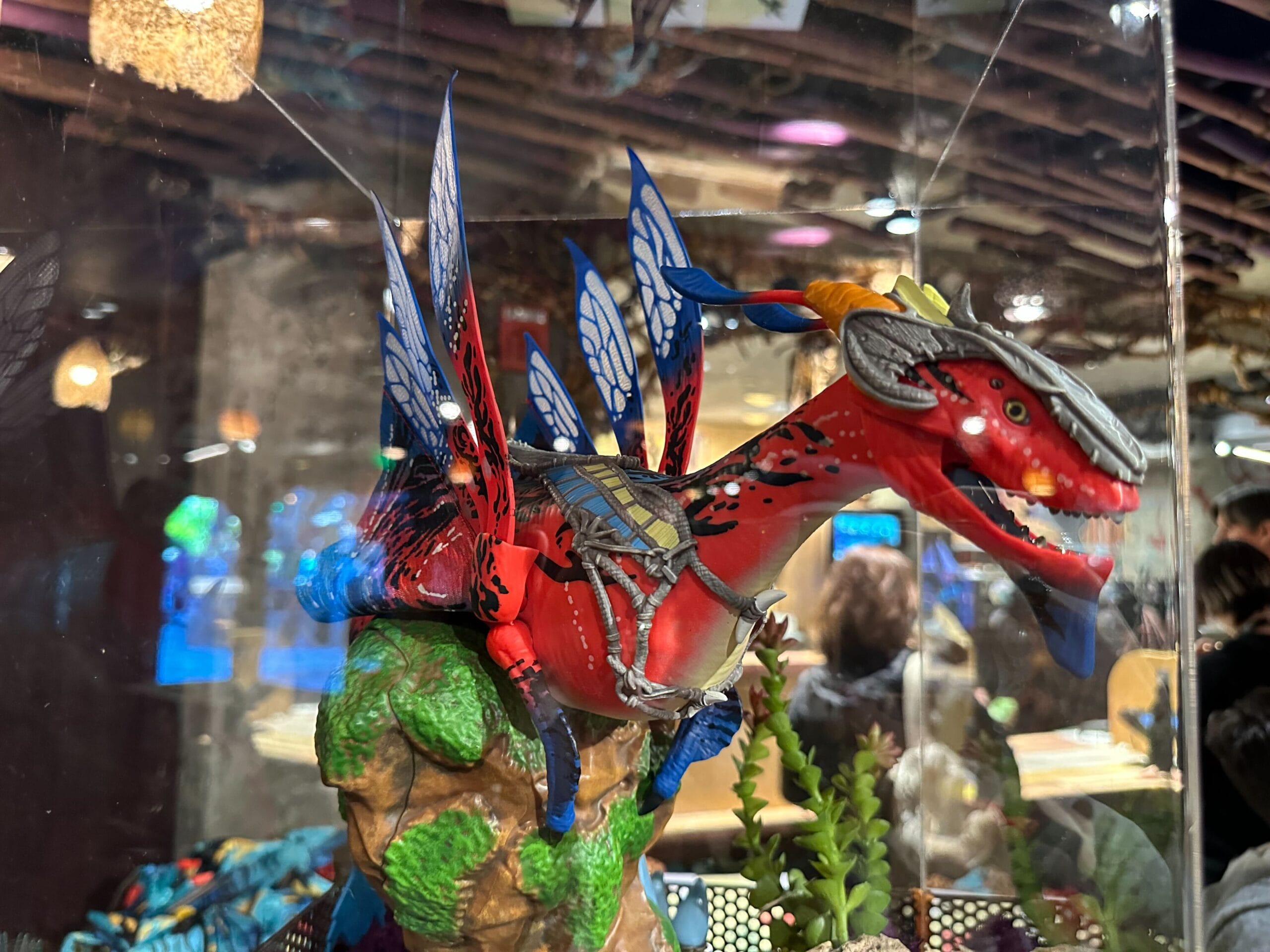 A red, blue, and black dragon toy with multiple wings and spiked details is displayed in a glass case.