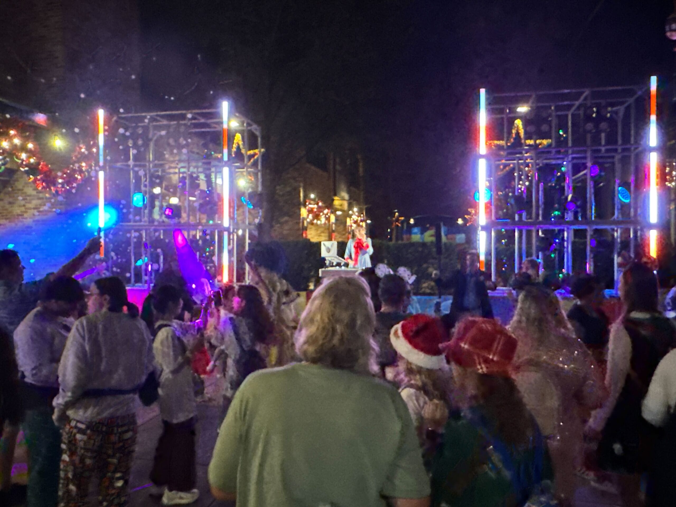 The dance party takes up about half the street, with the back half blocked off. The DJ is located on a platform against a row of planters, with lights on scaffolding to the sides.