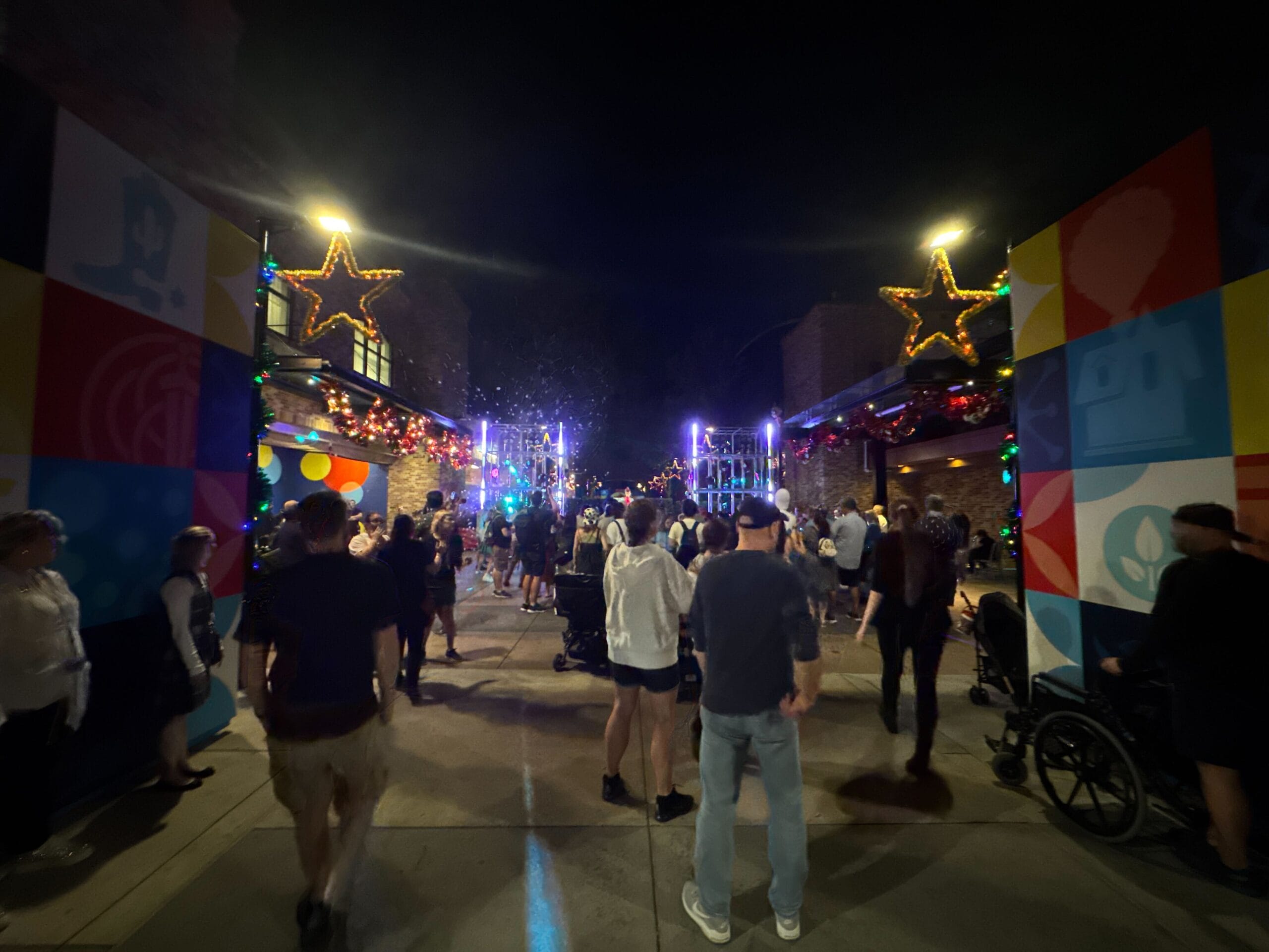 Pixar Plaza is near the main entrance of Toy Story Land at Disney’s Hollywood Studios. The street is decked out with holiday décor and lights. It closes sometimes during the night so the characters and DJs can take a break.
