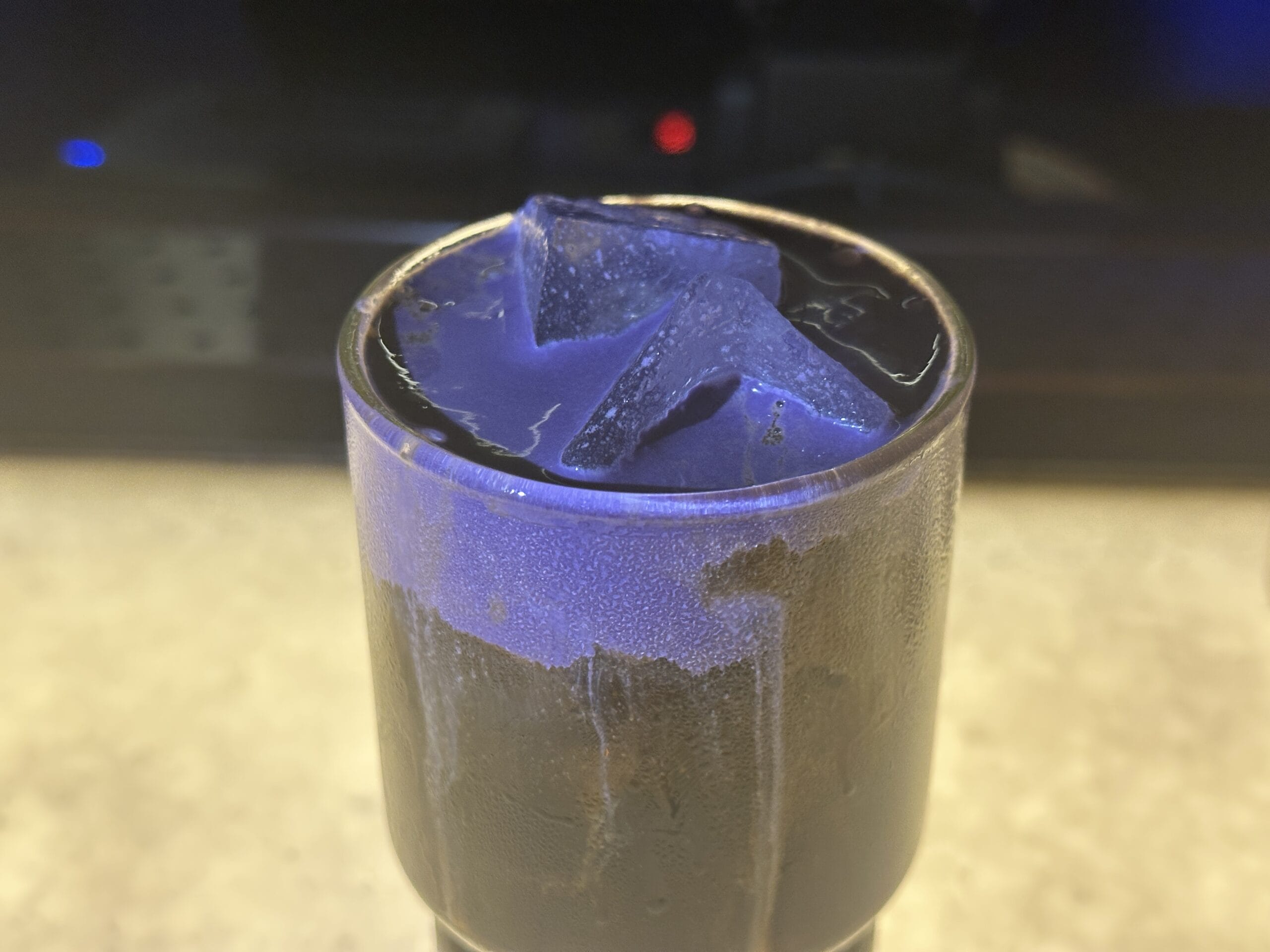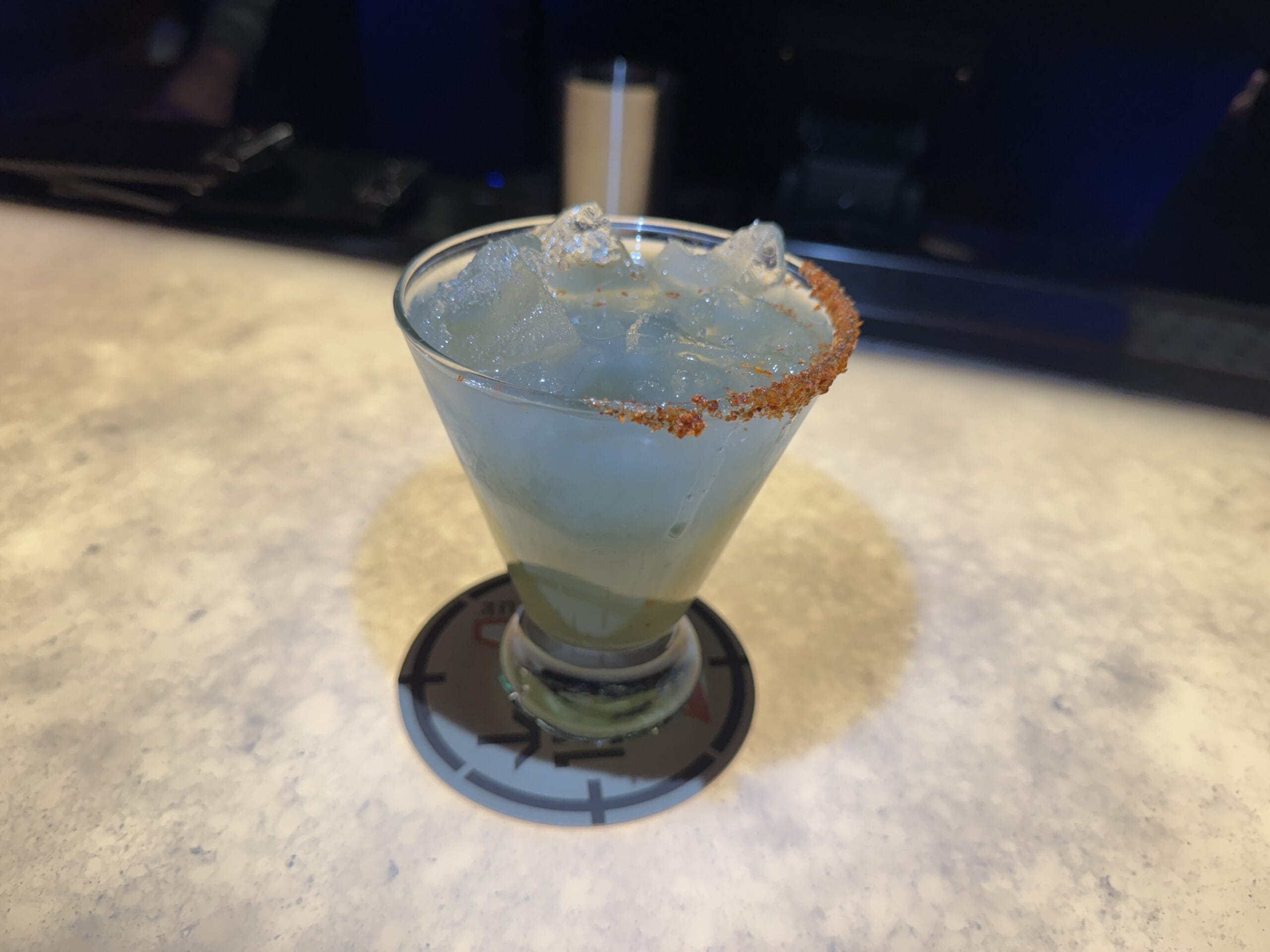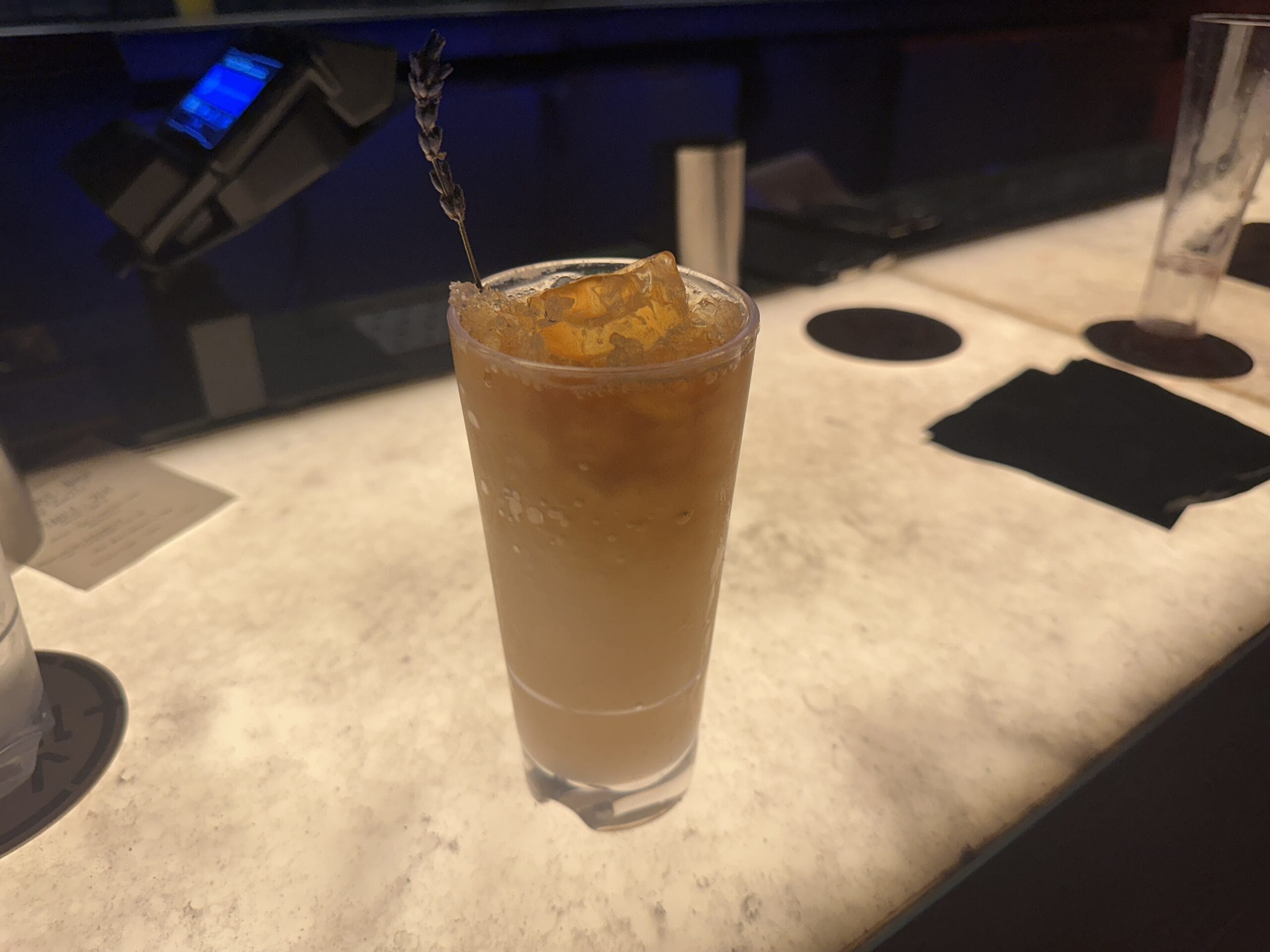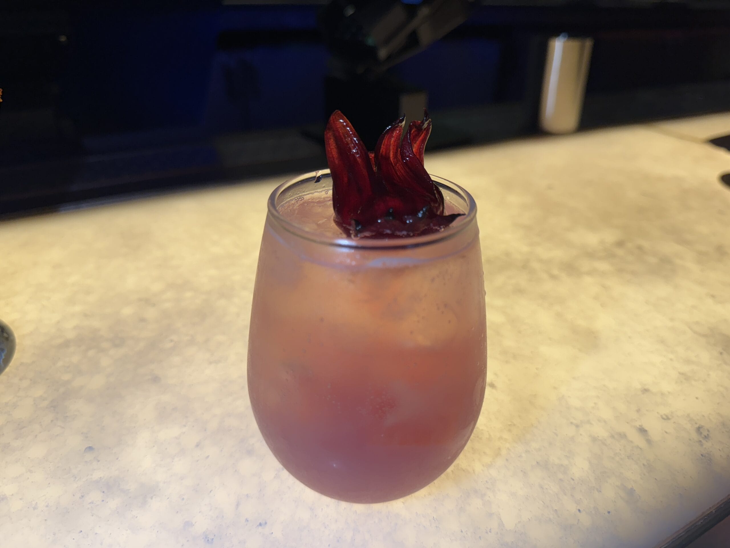 Our reporter is not a huge fan of gin but found this to be very good and their favorite out of the four new alcoholic offerings. The blueberry lime juice base gave it a nice fruity feel. The gin was not overpowering. We tried to eat the hibiscus blossom but didn’t find it very edible. If you’re looking for a light refreshing flowery drink, this is for you.