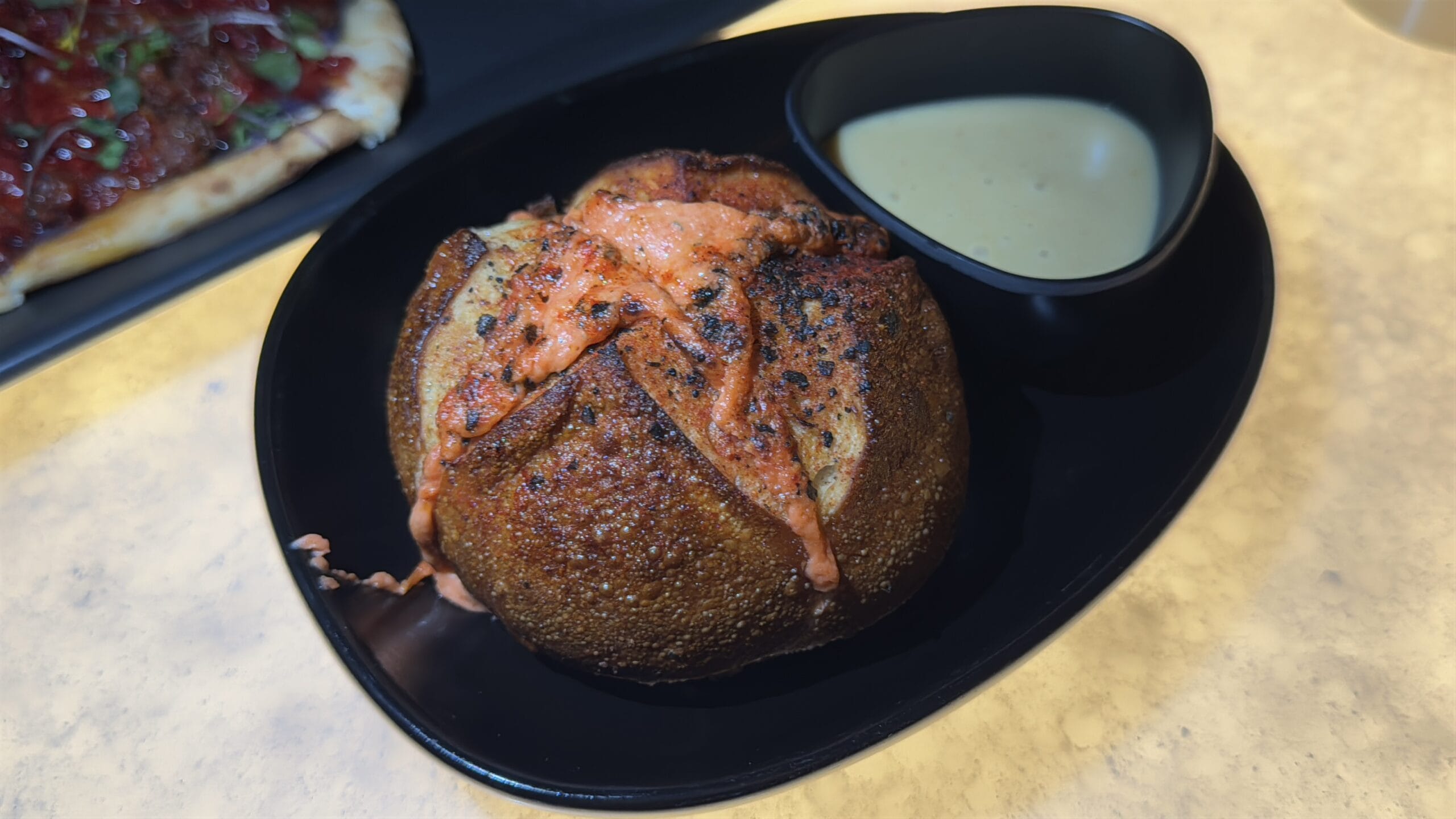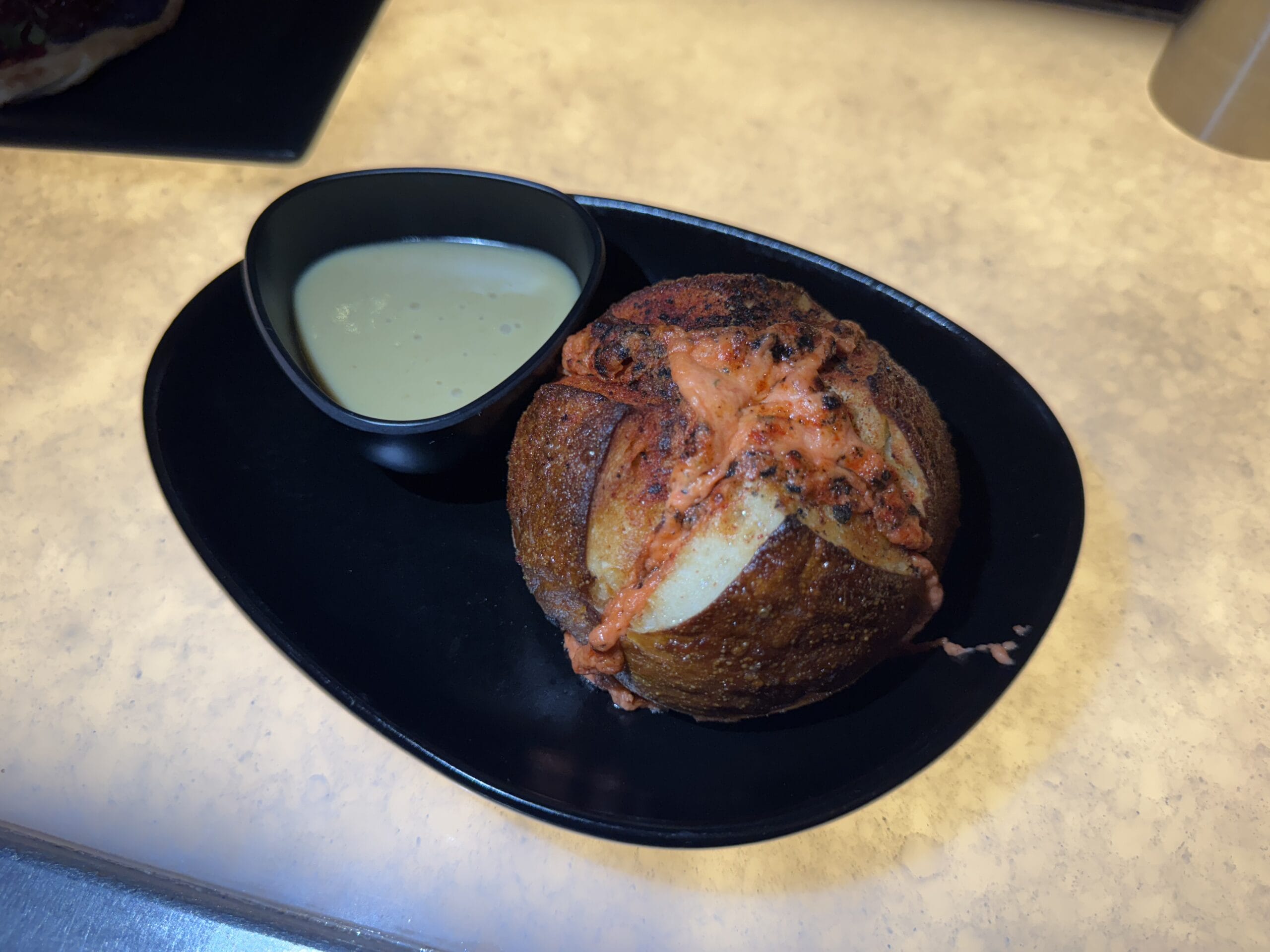 Spice-dusted pretzel bun stuffed with herbed cheese and a dipping sauce