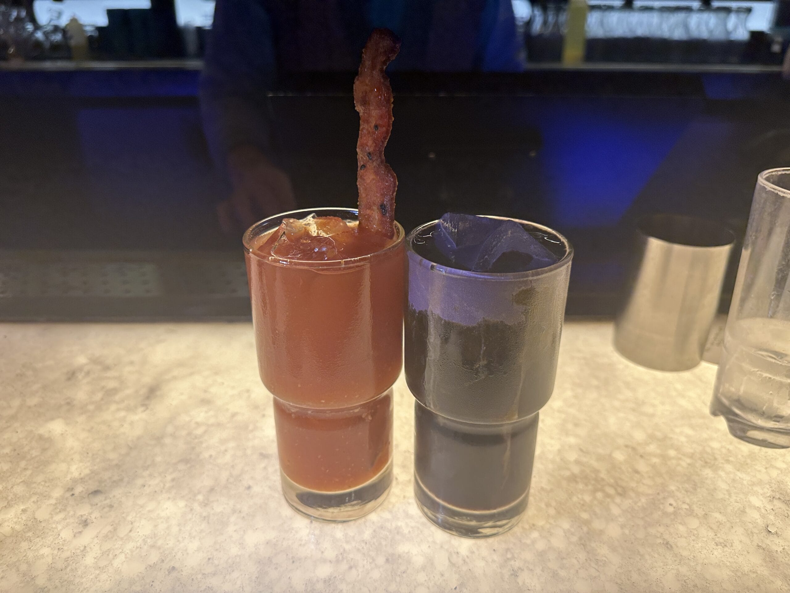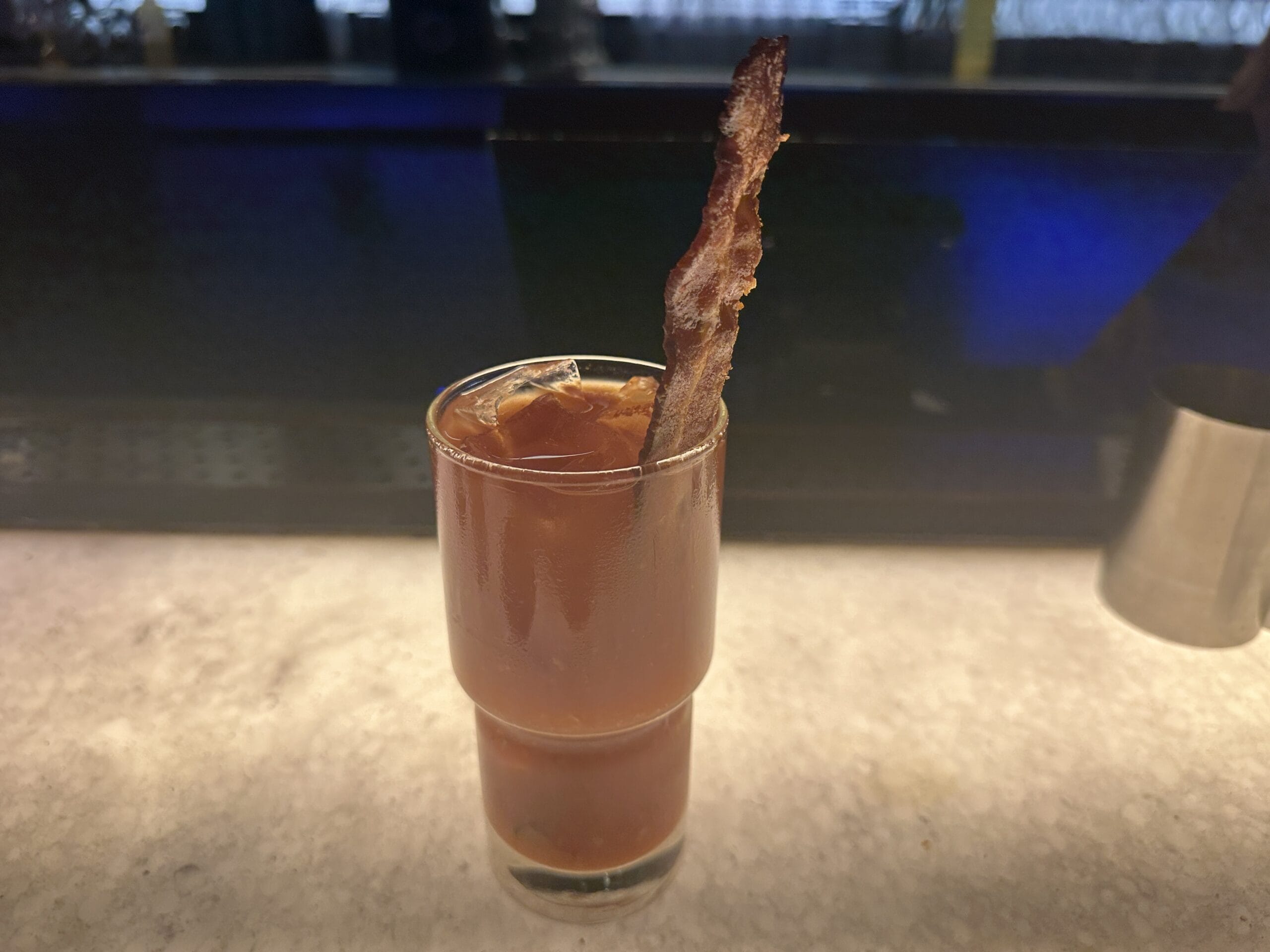 This is essentially a Bloody Mary with a piece of candied bacon. The Bloody Mary mix is advertised as house-made, which we believe. It tasted fresh and high-quality — not like it was out of a can. The candied bacon was tasty and the highlight of the drink. If you like Bloody Marys, you’ll probably like this.