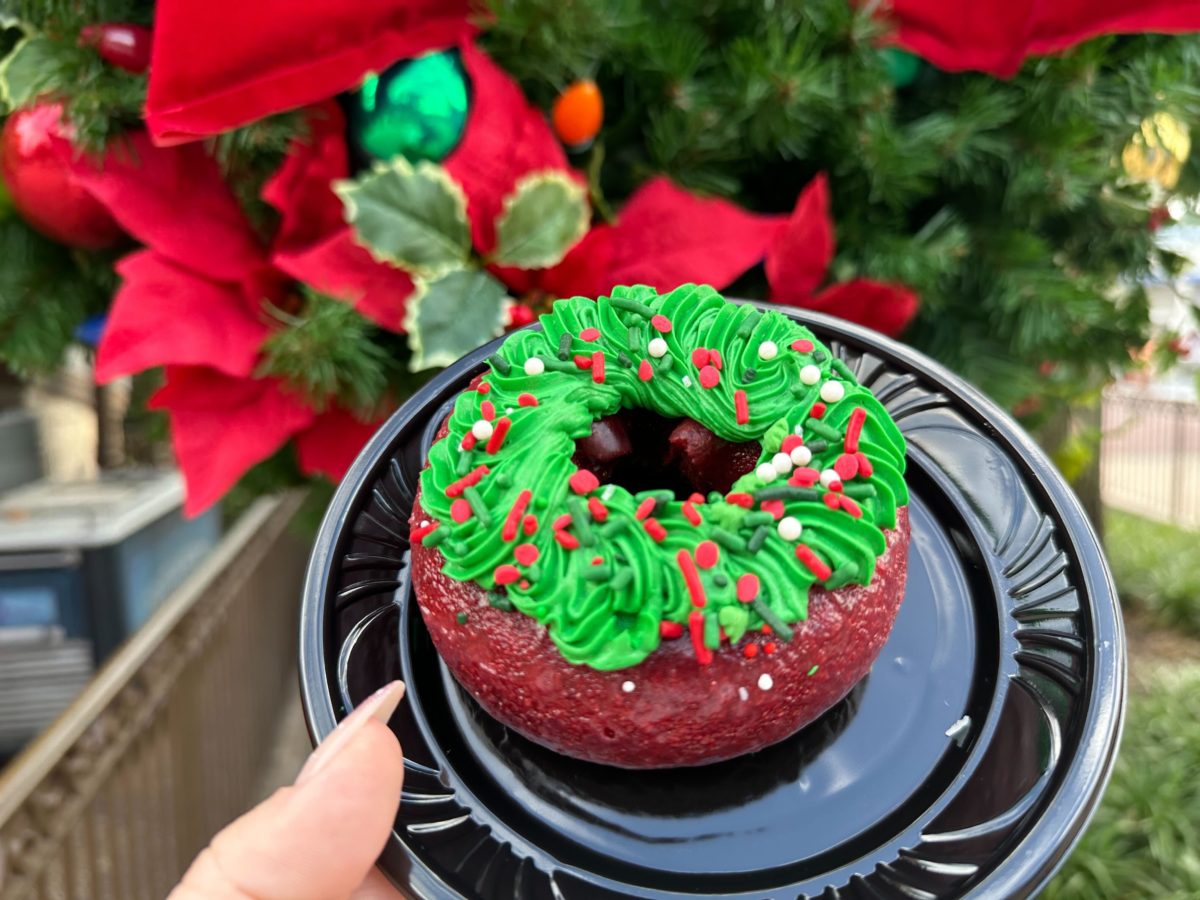 Menu board showcasing "Hot Cocoa Churro" for $7.50 and "Red Velvet Christmas Wreath Doughnut" for $6.00, enticingly described among the delightful array of Christmas treats at Magic Kingdom.