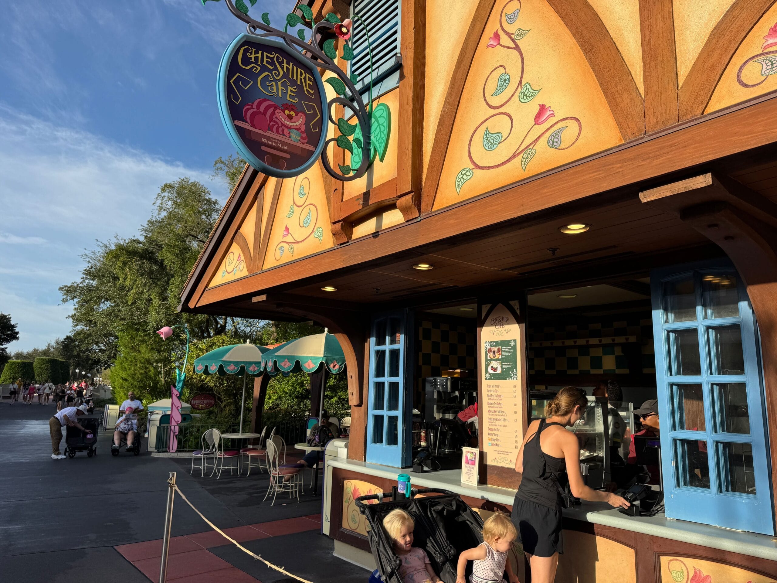 A woman stands at the counter of Cheshire Café in Magic Kingdom, with two children in a stroller. The whimsical decor and a smiling cat sign hint at the seasonal delights inside, as outdoor seating with umbrellas beckons guests to savor magical Christmas treats.