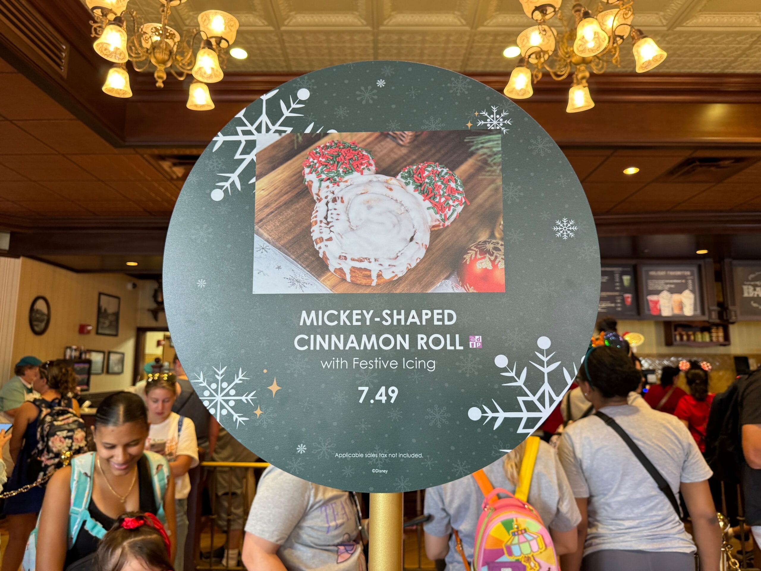 Sign promoting a Mickey-shaped cinnamon roll with festive icing as one of the delightful Christmas treats at Magic Kingdom, priced at $7.49 in a busy cafe setting.