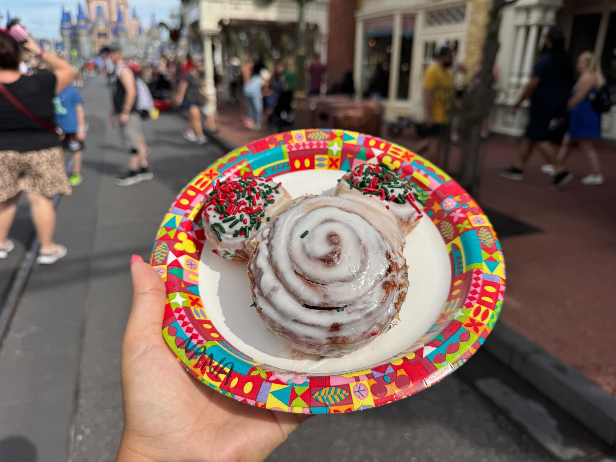 A hand holds a colorful plate featuring a Mickey Mouse-shaped cinnamon roll topped with icing and two sprinkled treats, capturing the festive spirit of Christmas treats at Magic Kingdom in an outdoor setting with people strolling by in the background.