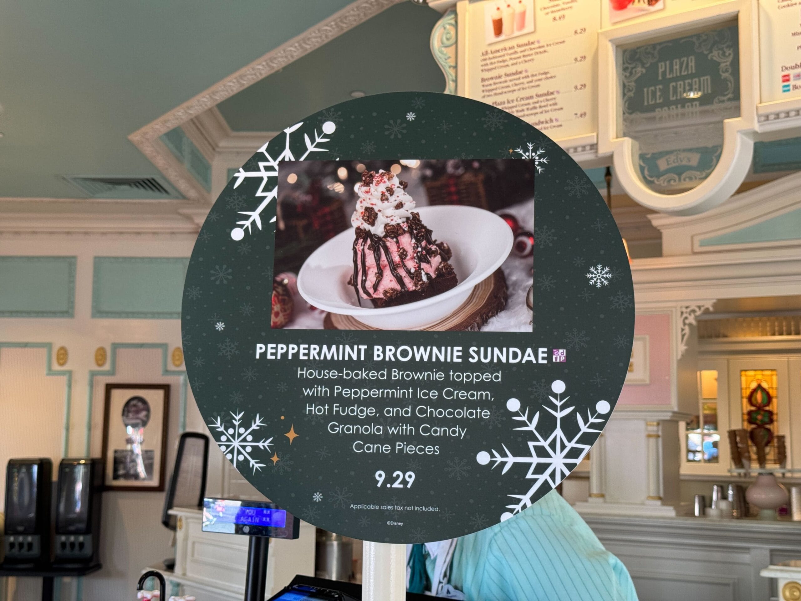 A festive sign reading "Peppermint Brownie Sundae" features a delightful description and price, adorned with snowflakes. This delicious addition to Christmas treats at Magic Kingdom is showcased against the warm backdrop of a cozy café interior with a menu board and counter.