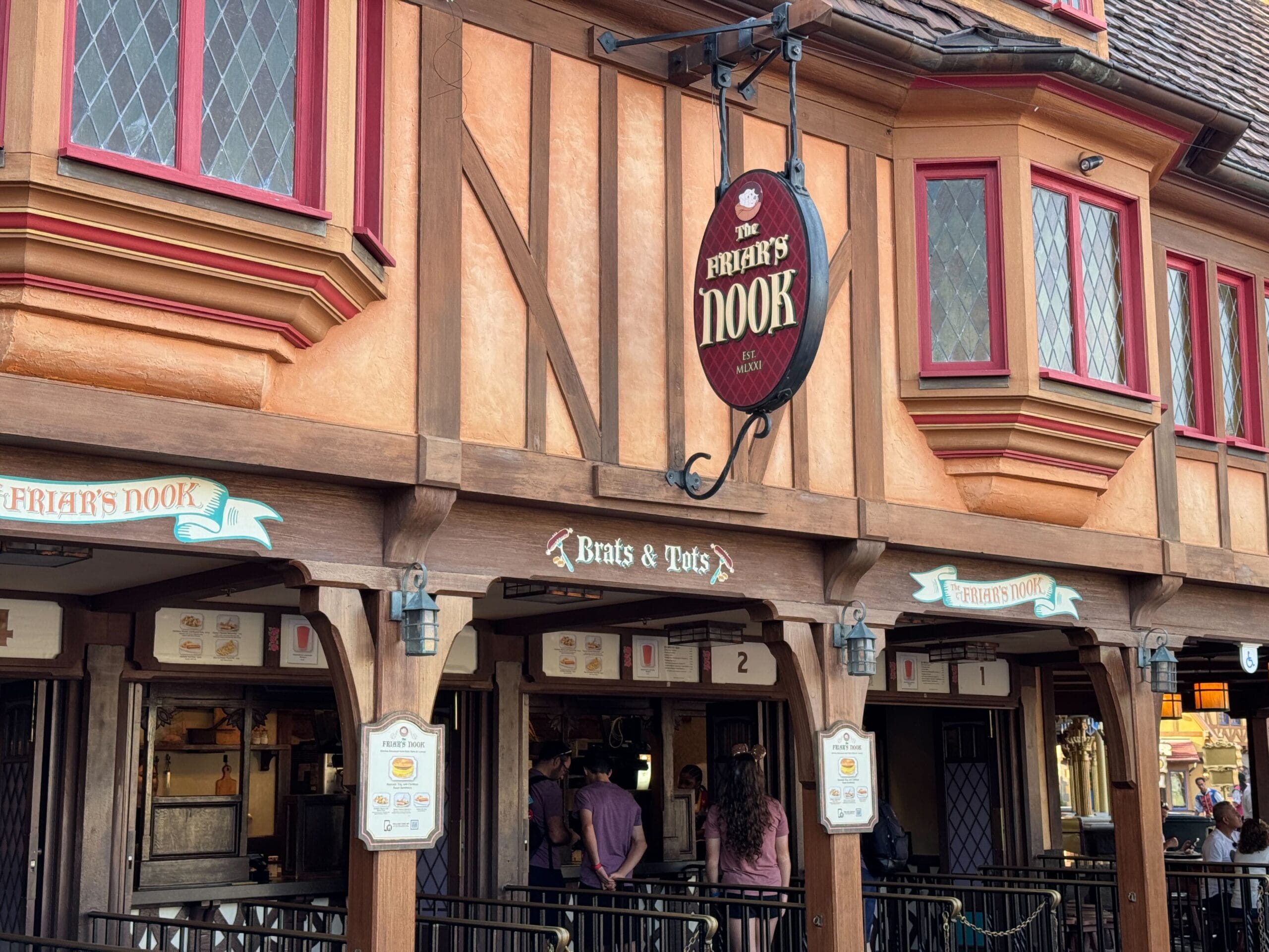 The Friar’s Nook is in Fantasyland between Princess Fairytale Hall and Storybook Treats.