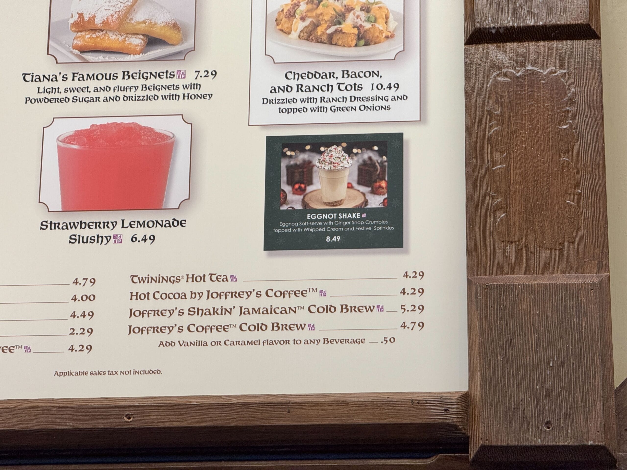A festive menu board at Magic Kingdom showcases an array of delights, featuring Tiana's Famous Beignets and Cheddar Bacon Ranch Tots. Indulge in a Strawberry Lemonade Slushy or the seasonal Eggnog Shake, perfect Christmas treats for a magical experience.