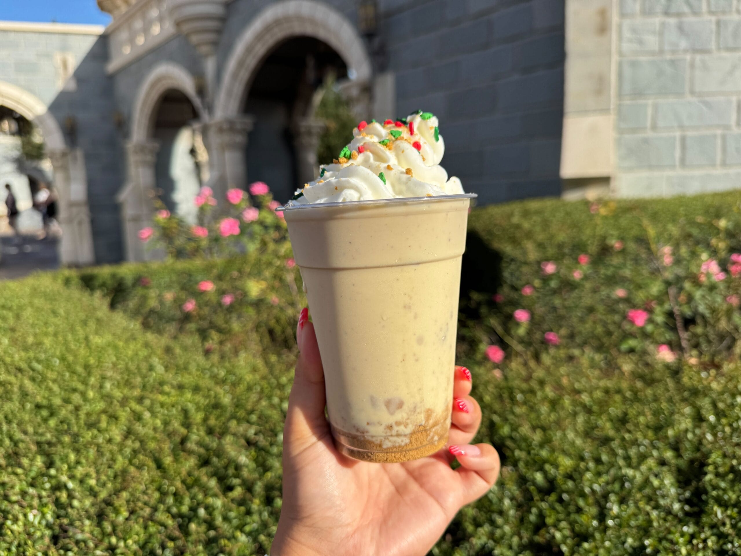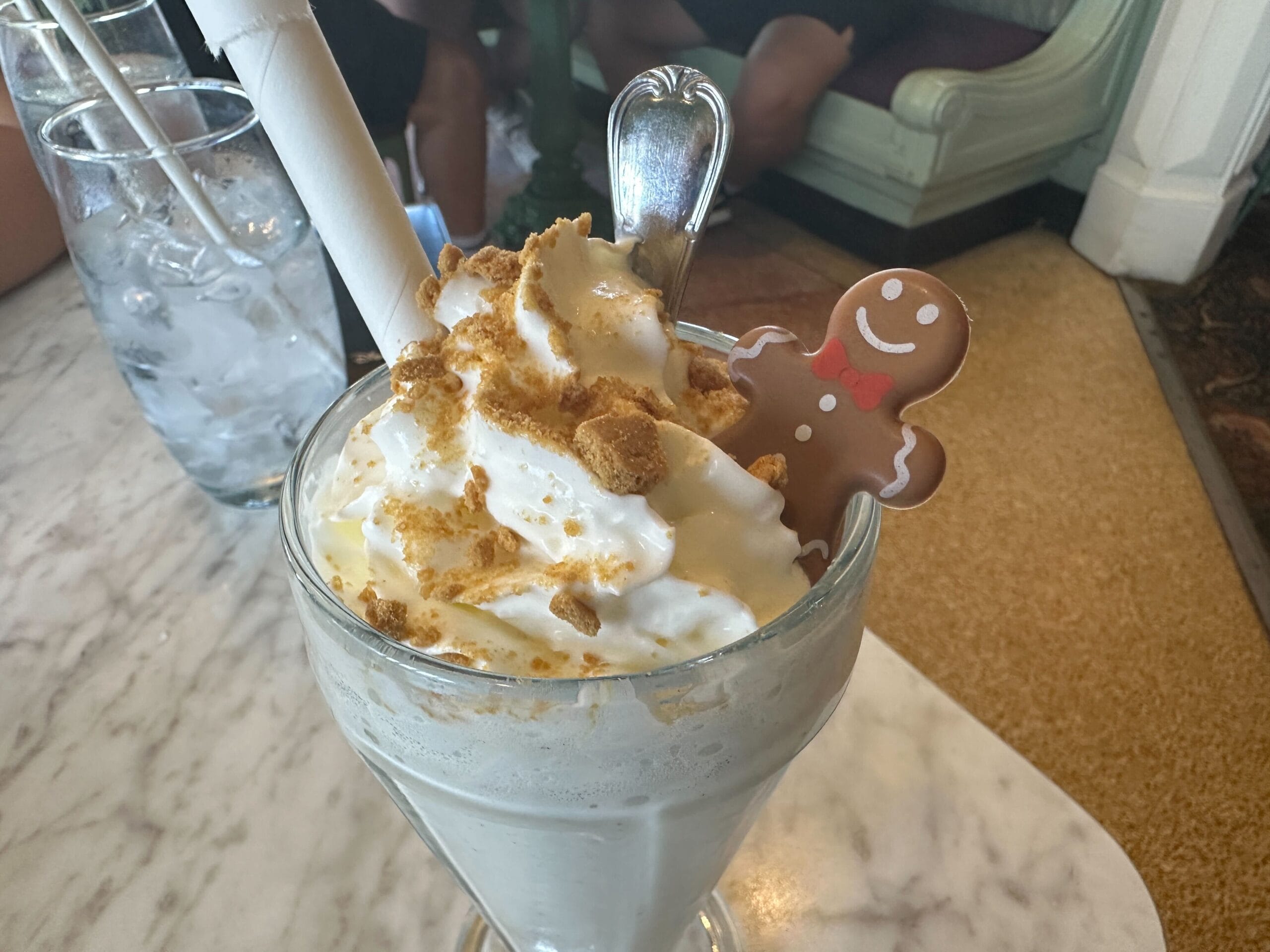 Enjoy a festive milkshake, a Christmas treat at Magic Kingdom, topped with whipped cream, crumbled cookies, and a charming gingerbread figure. Served in a tall glass with a spoon and straw, it's the perfect holiday delight.