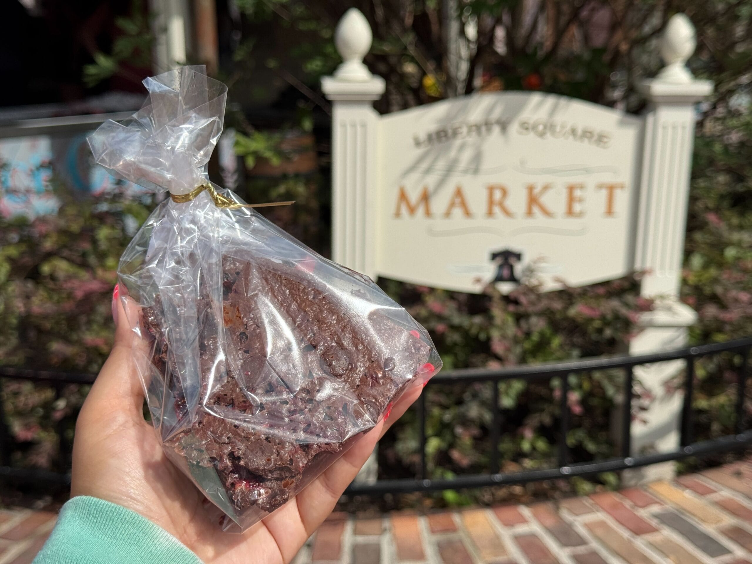 A hand holds a wrapped chocolate snack in front of a sign reading "Liberty Square Market," capturing the joy of discovering Christmas treats at Magic Kingdom.