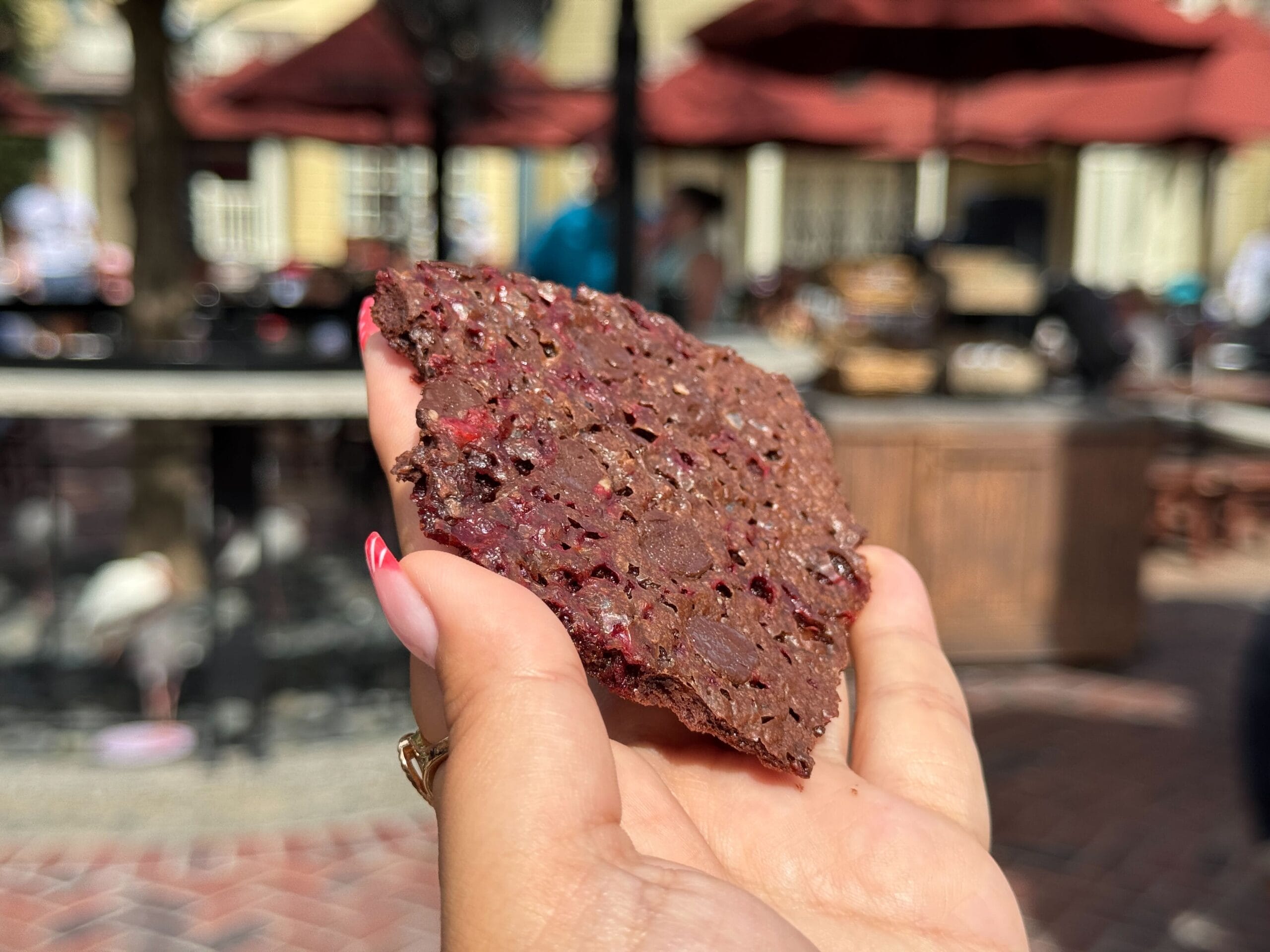 A hand holding a piece of chocolate with dried berries, reminiscent of Christmas treats at Magic Kingdom, outdoors with tables and red umbrellas in the background.