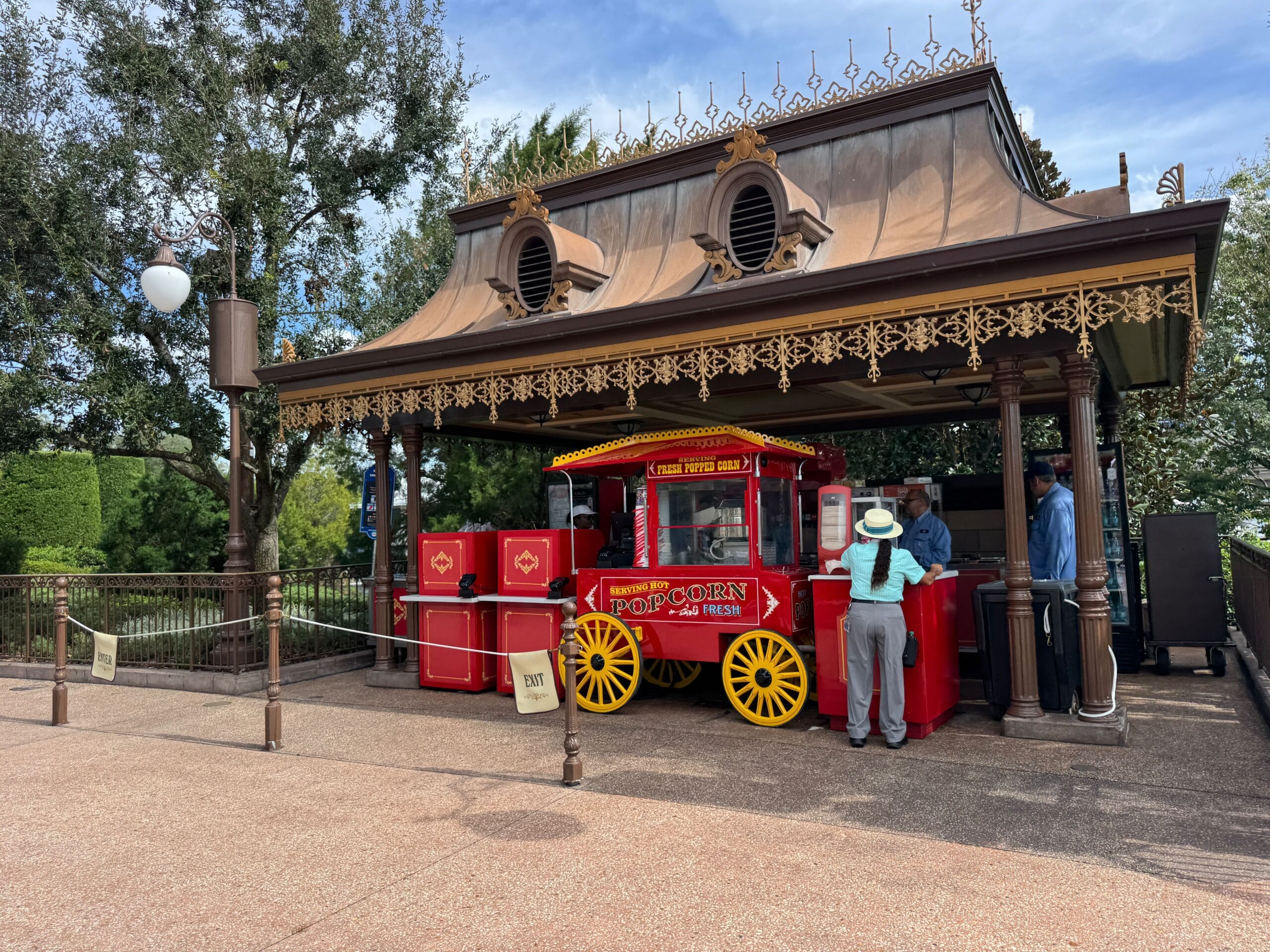 A red popcorn cart, offering Christmas treats at Magic Kingdom, is stationed under a decorative canopy. Two people are present, one serving and the other waiting. A few trees and a clear sky provide the perfect festive backdrop.