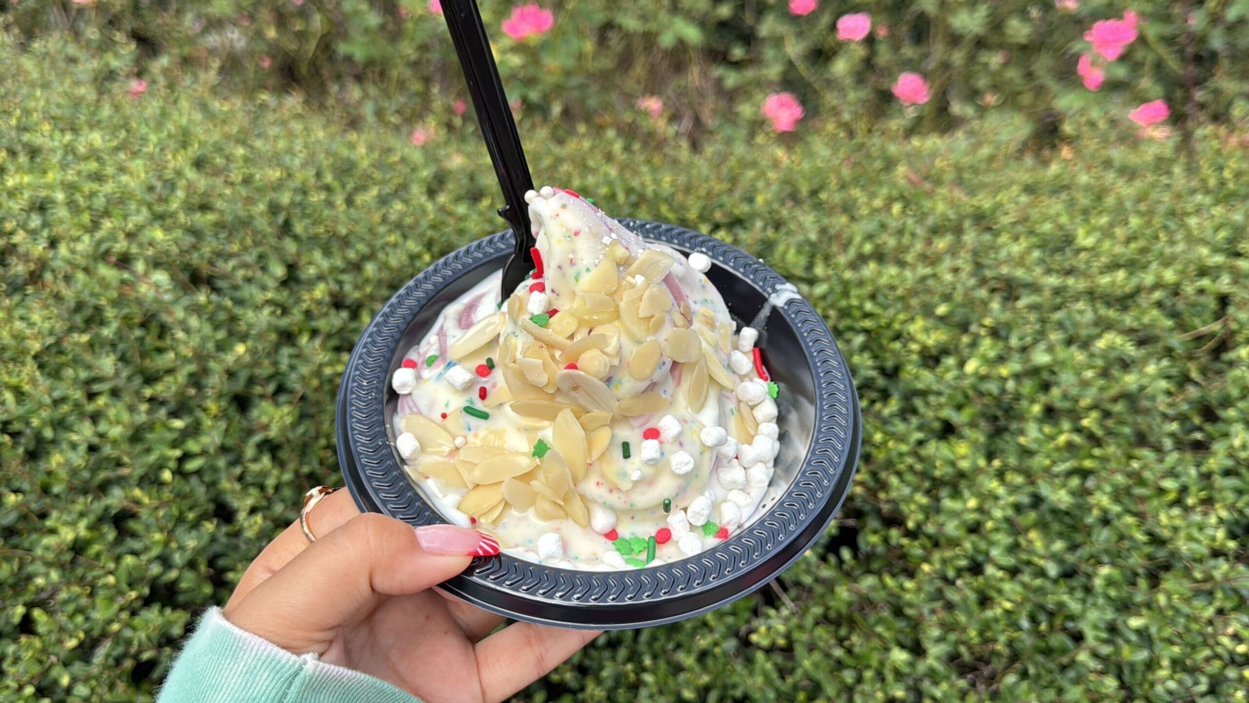 A hand holding a bowl of soft-serve ice cream, reminiscent of the delightful Christmas treats at Magic Kingdom, topped with sliced almonds and colorful sprinkles, with a black spoon. Greenery and pink flowers are blurred in the background.
