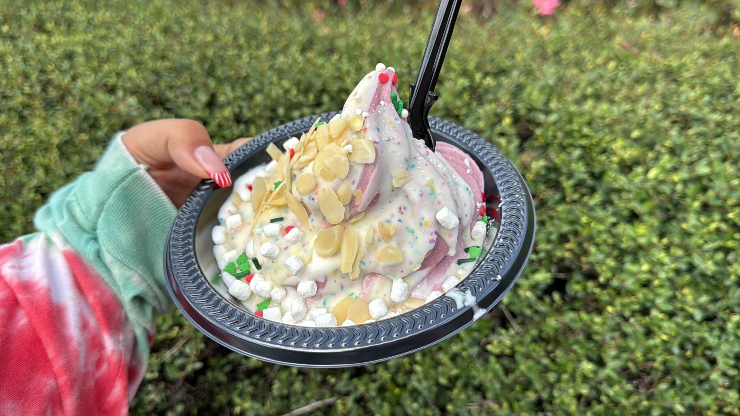 A person holds a plate of swirled ice cream, reminiscent of the delightful Christmas treats at Magic Kingdom, topped with almonds, sprinkles, and mini marshmallows against a lush greenery background.