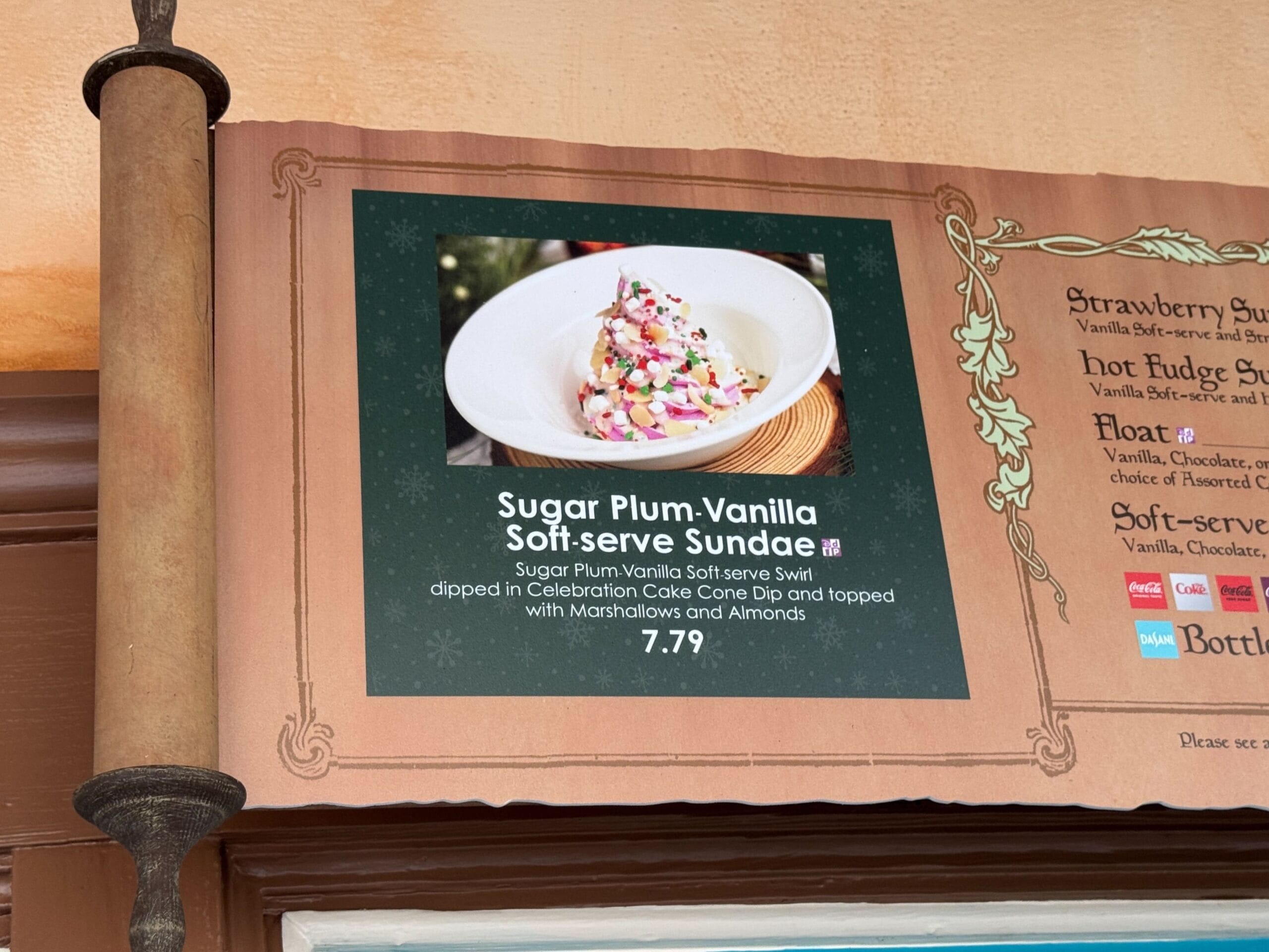 Discover our magical menu featuring a Sugar Plum-Vanilla Soft-serve Sundae topped with festive sprinkles, marshmallows, and almonds. Indulge in this delightful Christmas treat at Magic Kingdom for just $7.79.