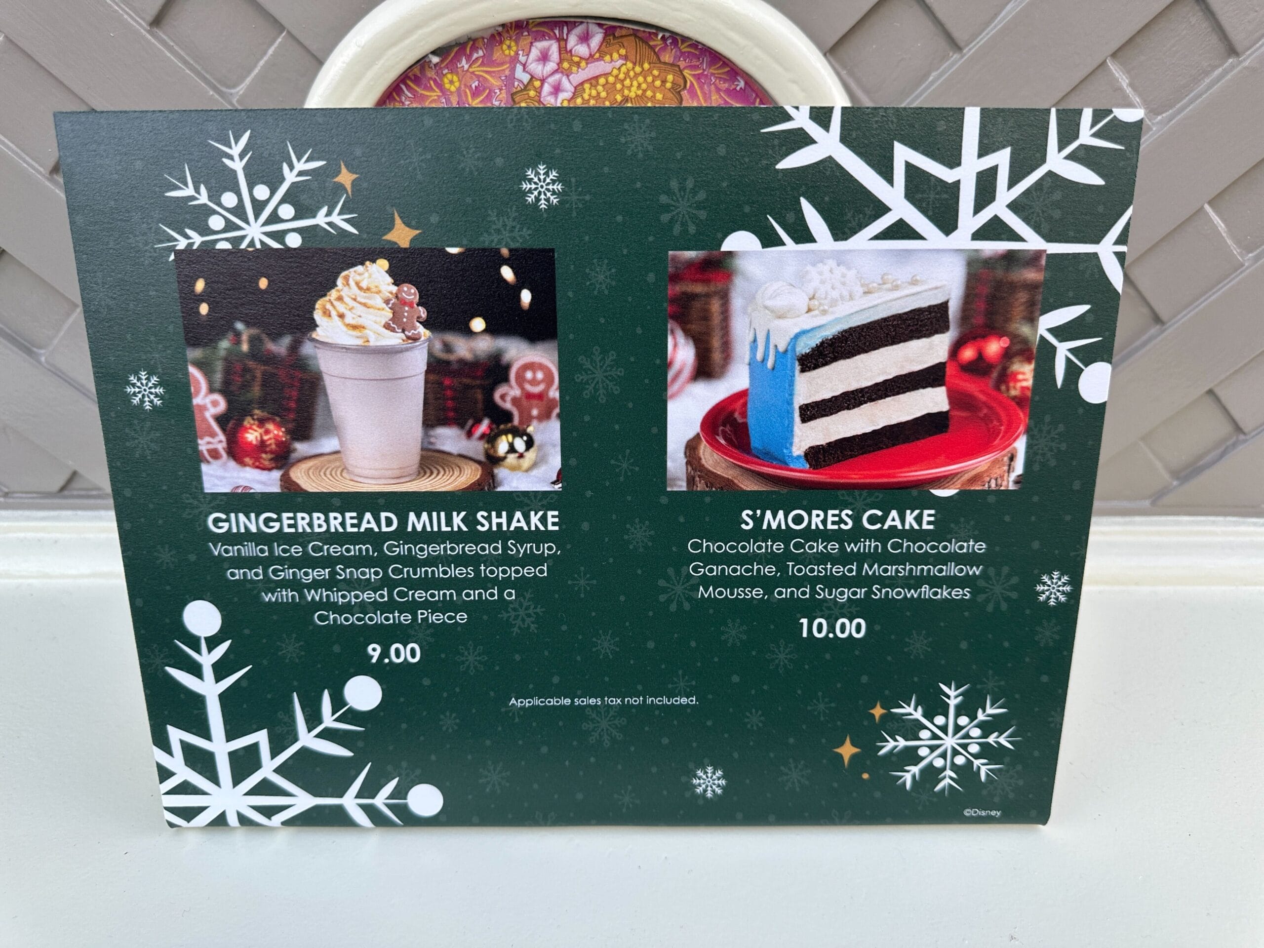 Discover our delightful Christmas treats at Magic Kingdom: a Gingerbread Milk Shake with ice cream and whipped cream for $9, and a S’mores Cake lavishly coated in chocolate ganache for $10. Each dessert is enchantingly decorated with snowflakes.