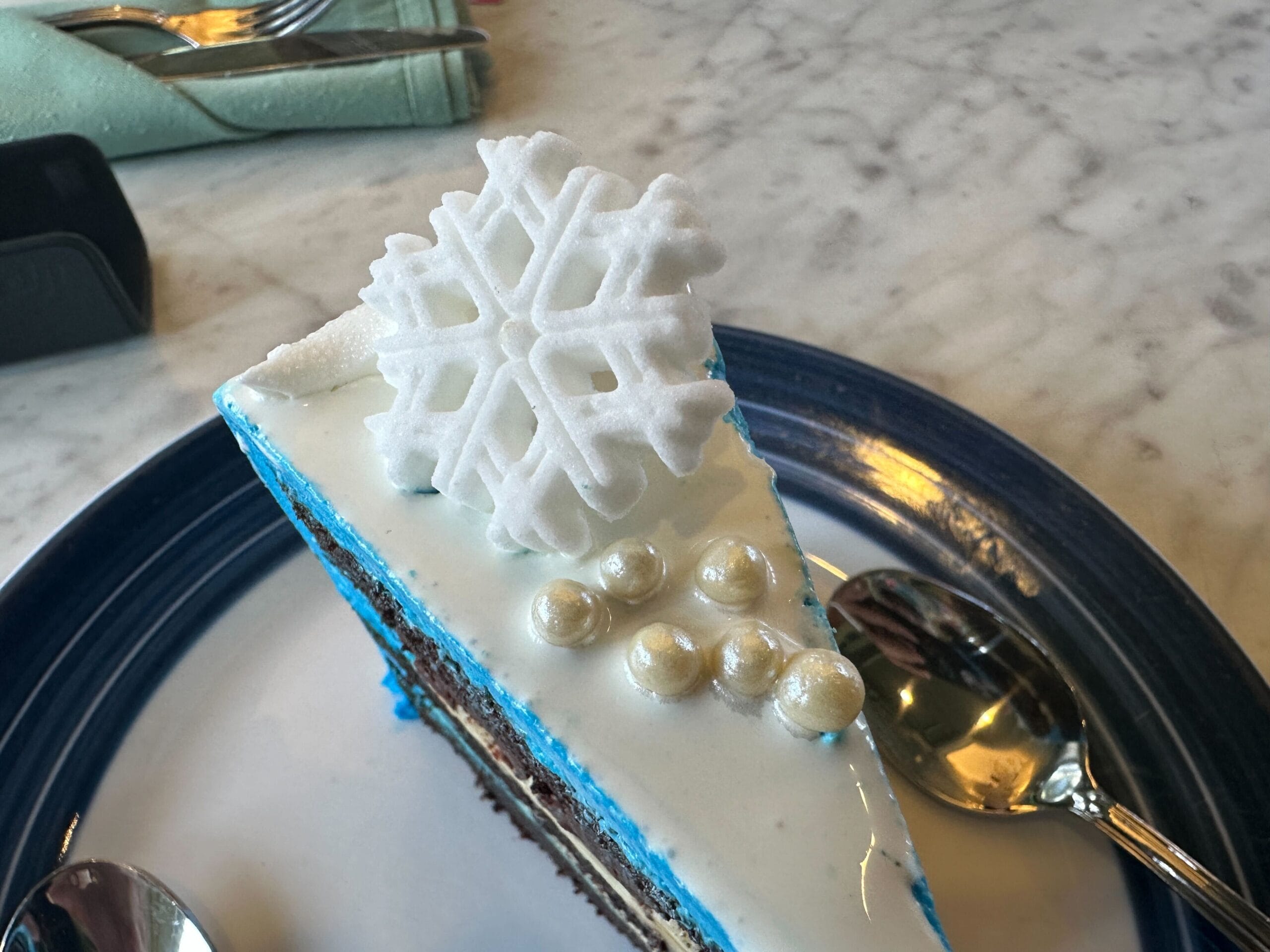 A slice of chocolate cake with blue frosting, white icing, and a decorative snowflake on top evokes the festive spirit of Christmas treats at Magic Kingdom, served on a plate with two spoons.