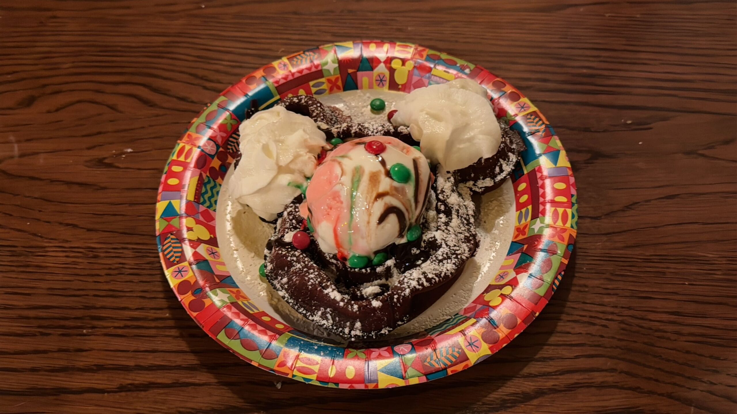 Mickey-shaped red velvet waffle topped with M&Ms Milk Chocolate Candies, peppermint ice cream, and hot fudge